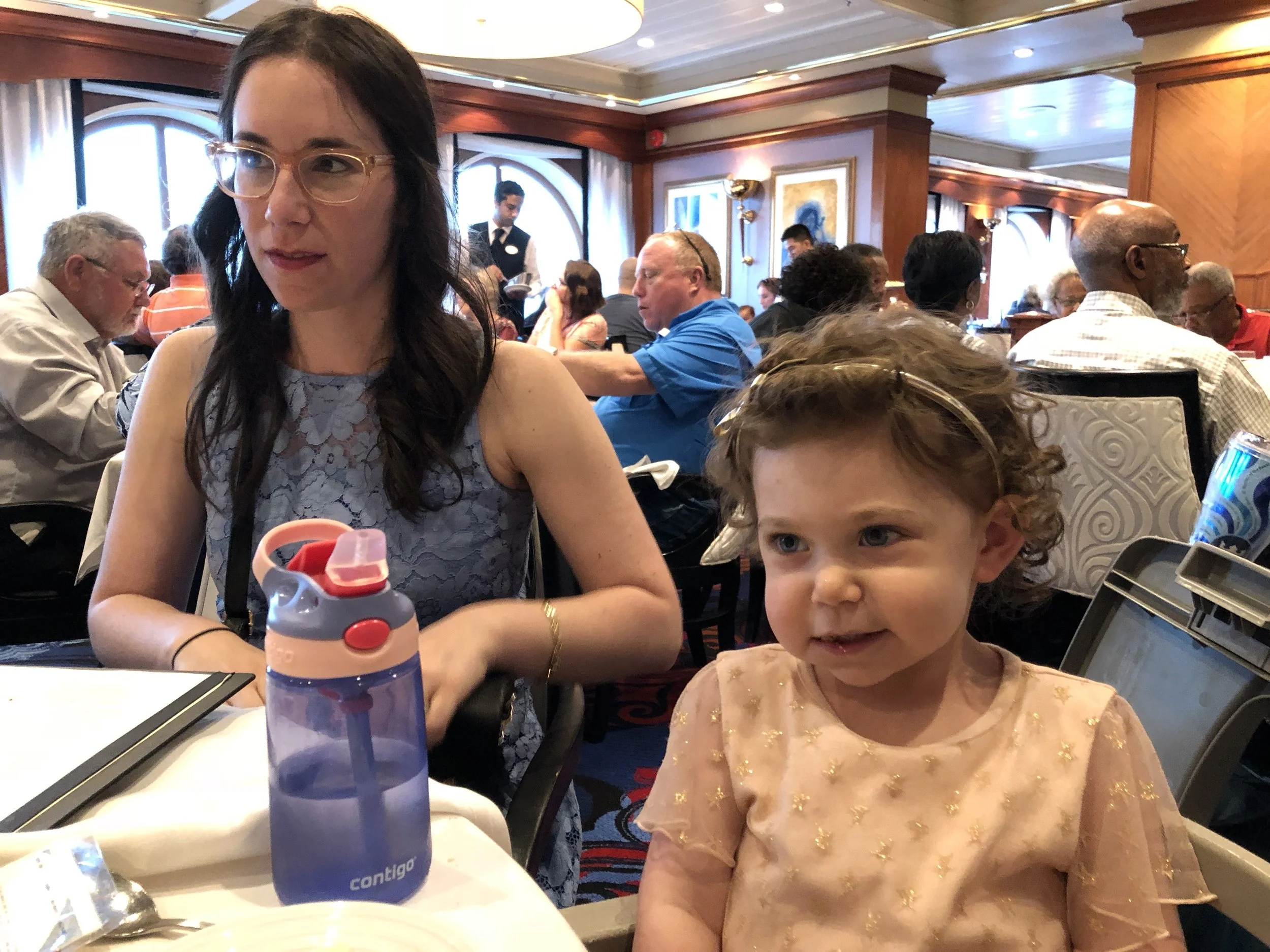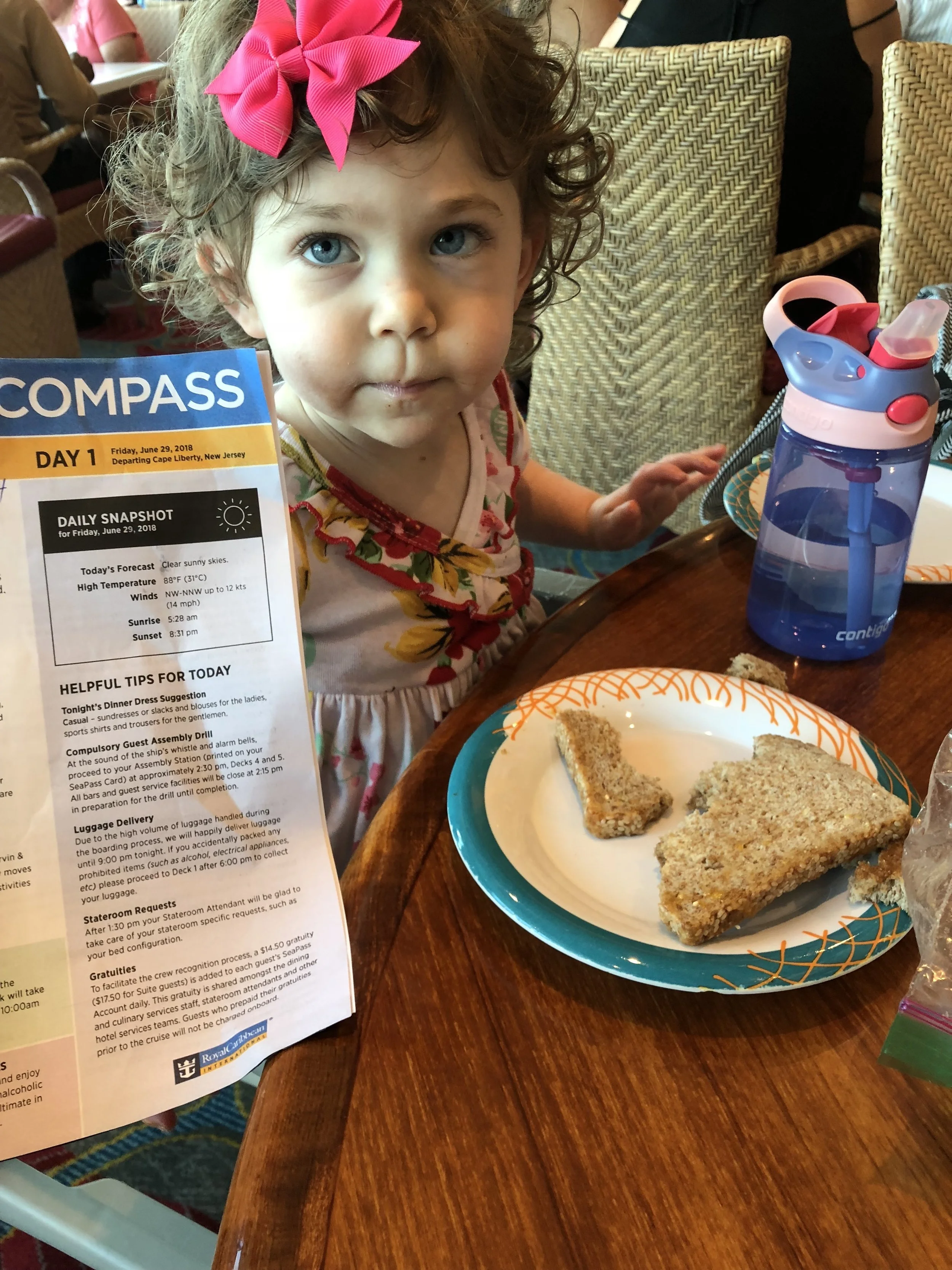 My parents were in another car. They got to the cruise before us, and had checked in online, printed their bag tags ahead of time, and made it onto the ship real quick. Tzvi’s been too busy to deal with anything, so when we unloaded and they asked us for our bag tags or stateroom number, we just had nothing. Tzvi went searching through emails and found the cabin number and they wrote us bag tags. No big deal. Then we went inside, went through security, check in, took our obligatory cruise photo and then headed onto the ship. Hallie was very excited. She’s been talking all week about how she’s going on a ship, and how they have pizza and ice cream and fruit and salmon every day on the ship.