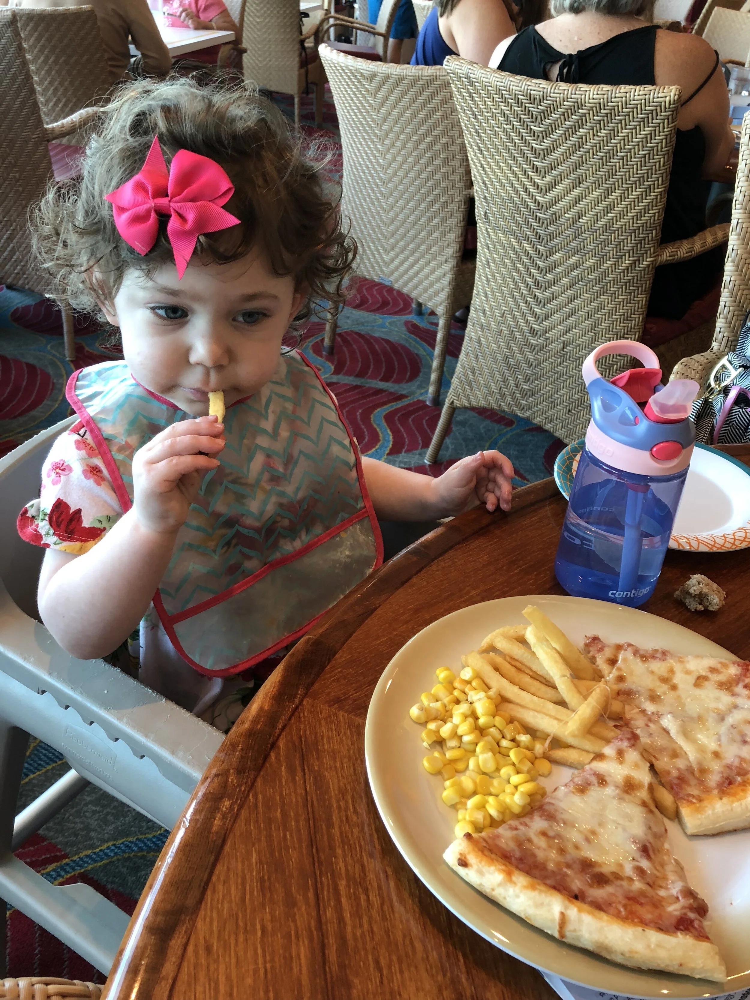 We left the room and went for our first buffet at Windjammer (the buffet). First thing we did was get Hallie a plate of pizza, French fries and corn. She enjoyed the French fries and corn but wasn’t crazy about the pizza. Tzvi got off to a good start – a taco, some vegetable ragout dish and some cream sauce pasta. I had a salad and found tuna. Pop pop didn’t get tuna because it said “contains seafood.” I was pretty sure that just meant it was fish. I was right.
