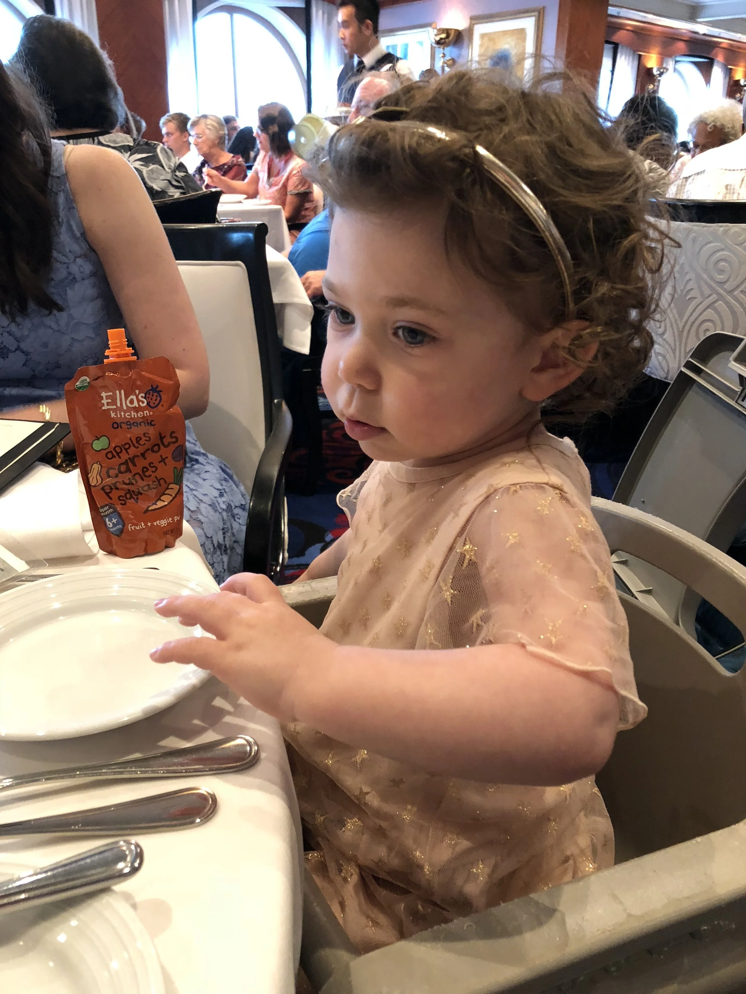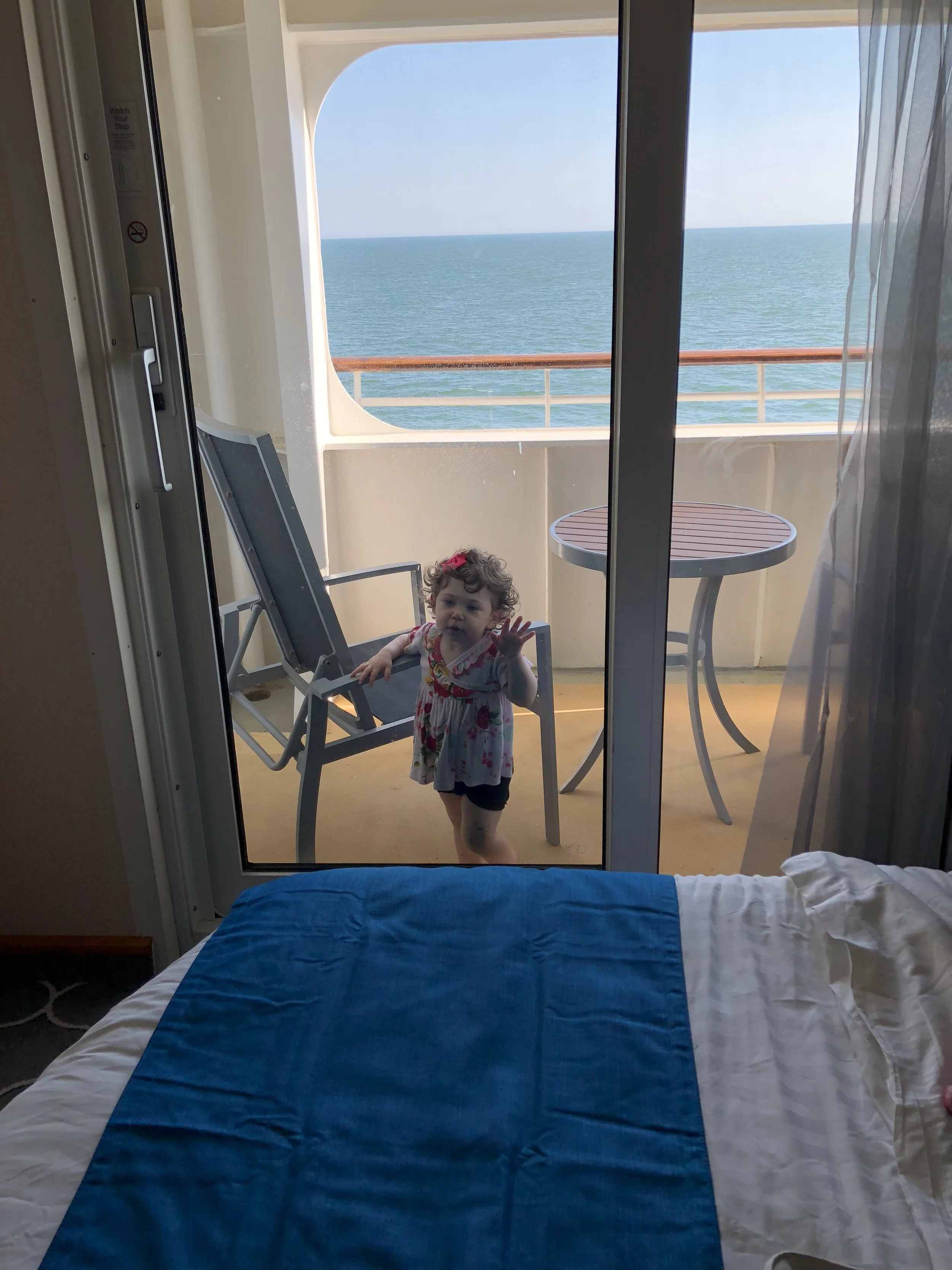 We started unpacking and then moved on to the next challenge. We had requested a crib for Hallie, but it hadn’t arrived yet, so again, we found a steward and had them bring one. Except they brought a pack n play, which would have been fine, except it was a travel pack n play for small children. Like babies. Like tiny babies. Like Hallie would’ve done well in this thing when she was still too young to go on a cruise. Hallie tried to lay down but in order to fit she had to have her legs sticking up against the side of the pack n play. She actually loved playing in it, though I’m sure she would’ve woken up very cramped if she tried to sleep in it. We told Joseph our cabin attendant that it was too small. He smiled, said sorry, and then said there was nothing he could do. We asked if they could bring a larger crib. No, they don’t have larger cribs. We asked if he could make up the couch into a bed. No, it doesn’t open into a bed.