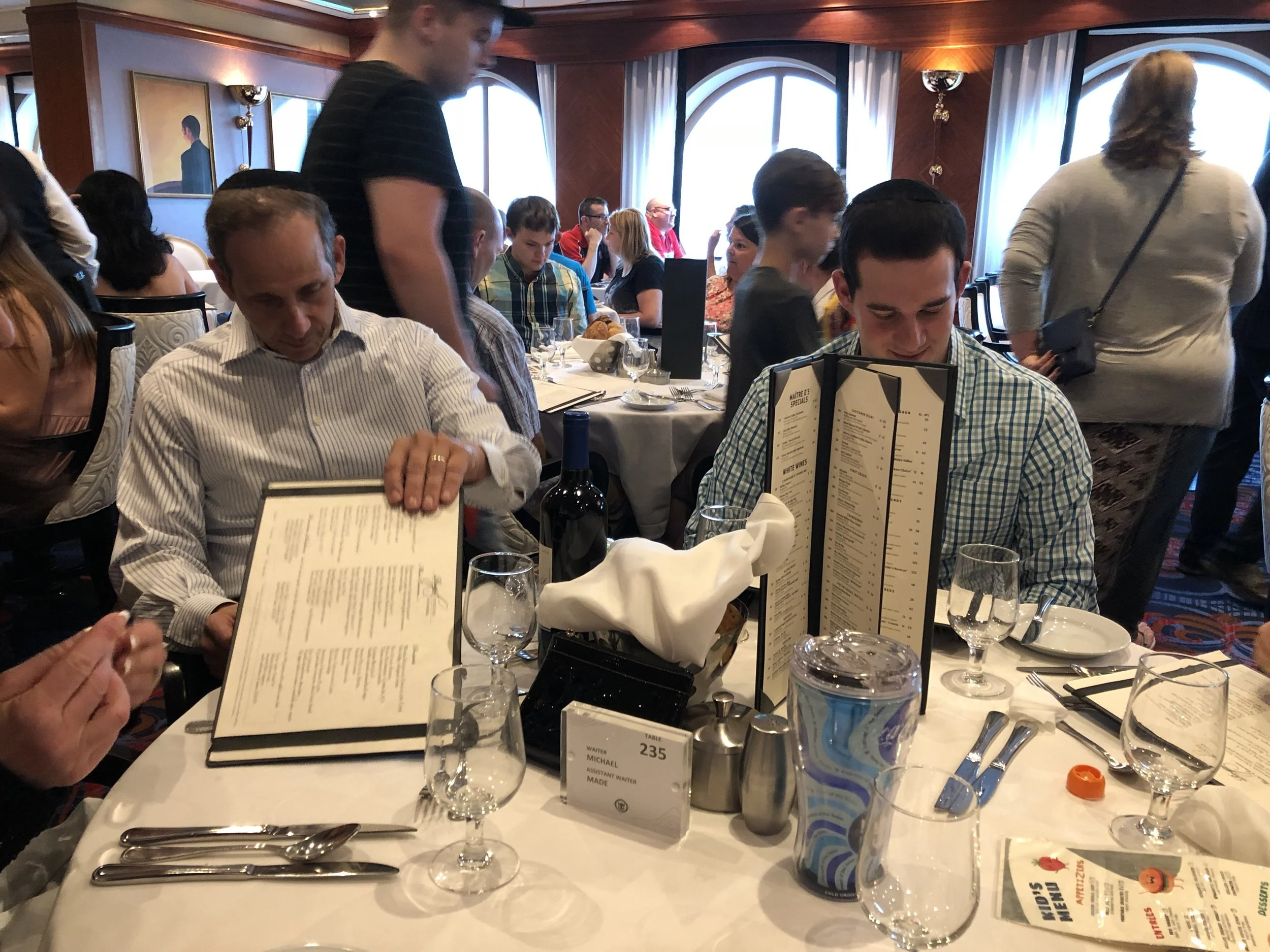 Around 4 o’clock we went back to the room to unpack, shower and change for dinner. Unfortunately, our luggage still had not arrived. Tzvi called the operator and they said that was normal, luggage can arrive up until 8 pm. Oy. We waited a bit longer, until eventually (around an hour later) Tzvi found some stewards out in the hall and had them take him to the service area where they keep bags until they’re delivered. He pointed out the bags and made them bring them out.