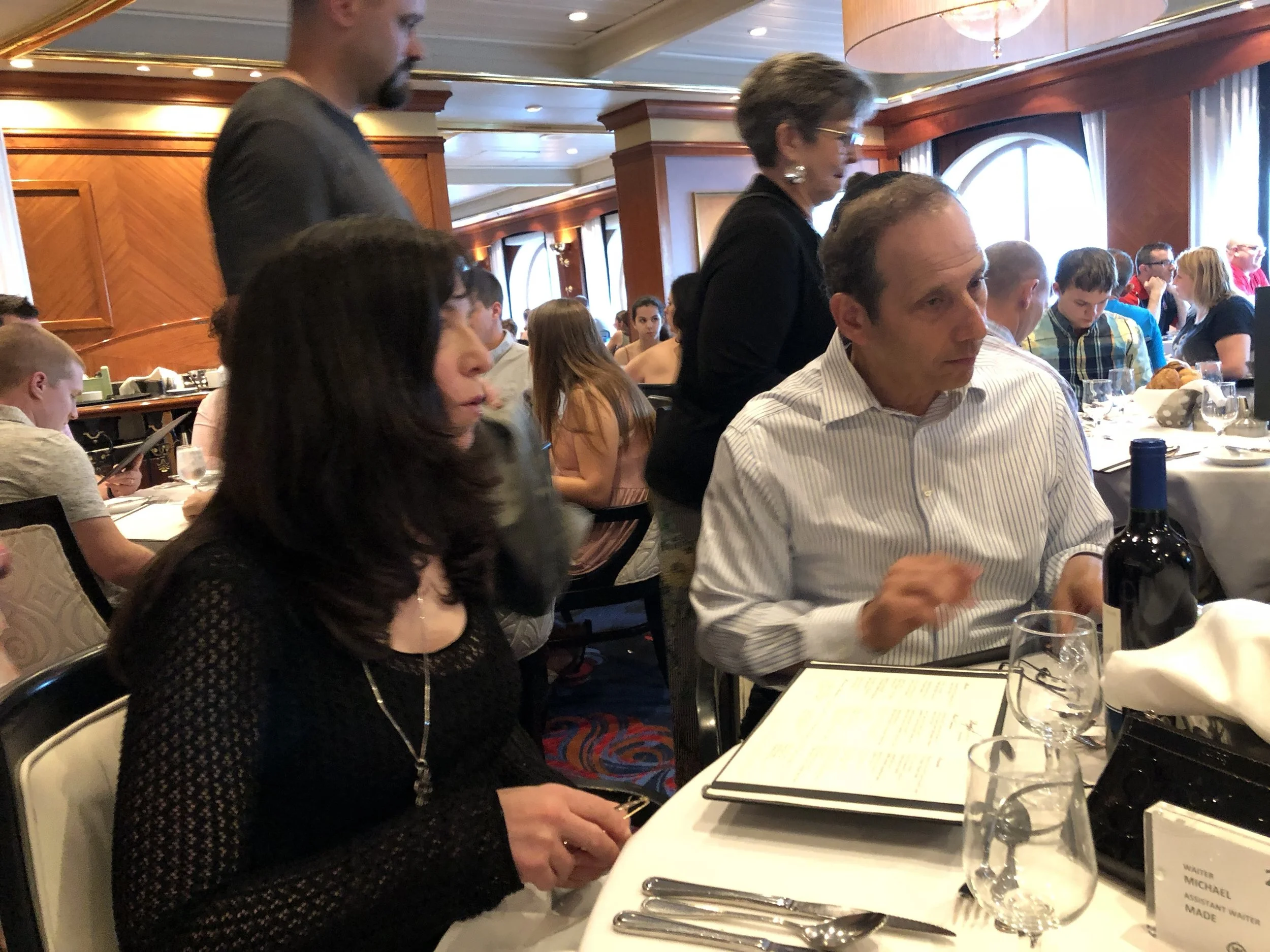We ordered a bunch of food off the kosher menu, which for Tzvi would be dinner number 2. While we waited for the kosher food to come, Tzvi ordered a cream of mushroom soup (he really liked it), a Caesar salad (standard cruise Caesar salad, we’ll probably have at least one a day here), a couple of fruit plates (why is there a fruit plate on the appetizer menu) and a polenta entrée with grilled vegetables and cheese (a very interesting dish). Dinner was very pleasant, Tzvi enjoyed his food and we waited for the kosher food to come.