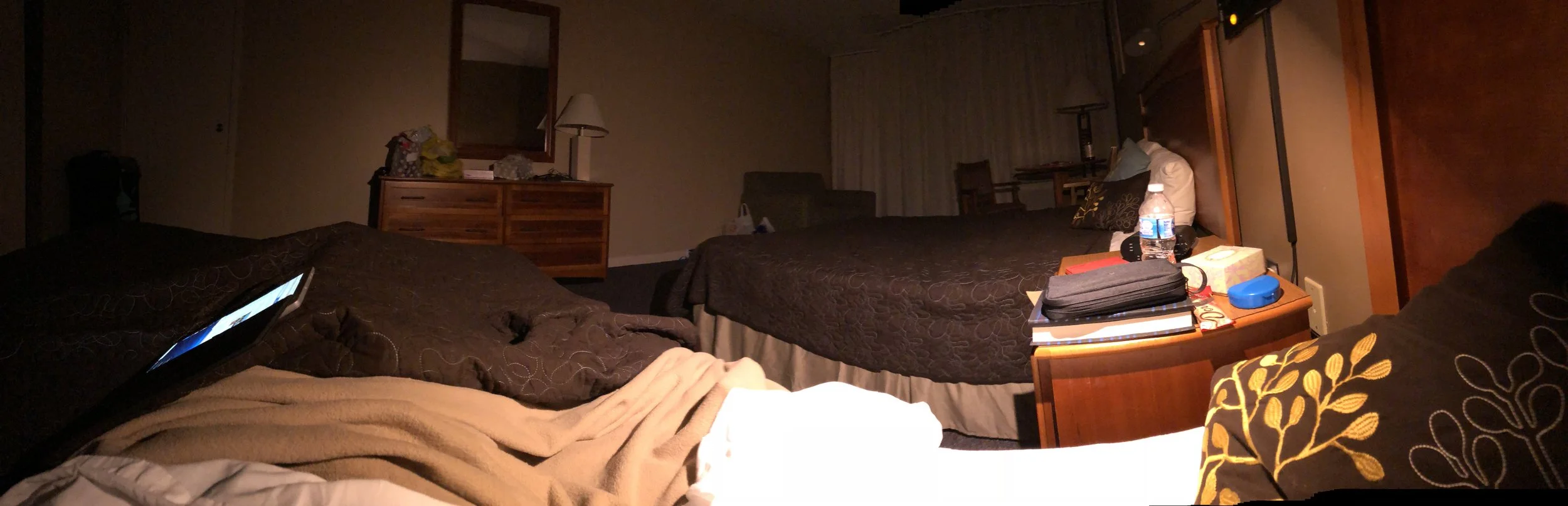 After I was unpacked I decided to check out the gym. That is where I saw a big bug. I think it was dead, but who knows. Then I came back, showered, and here I am. Eliana texted me saying she might stay by a friend in Baltimore tonight and come in tomorrow morning, so that’s nice for me. I’m in bed now. There are two flat pillows and a thin blanket.