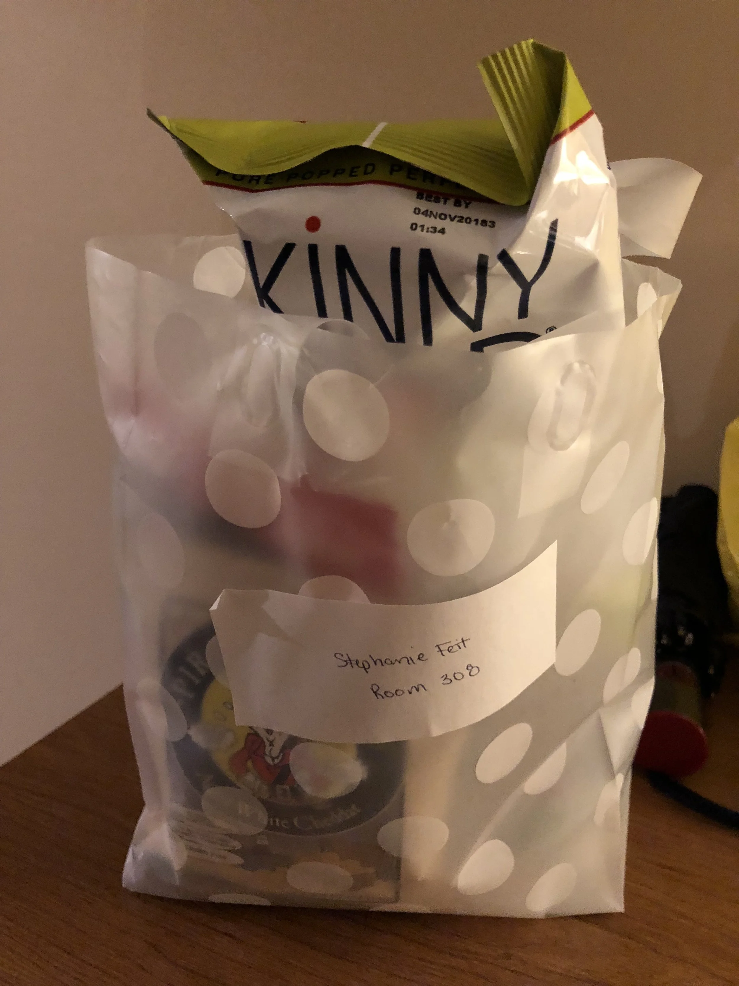 I was also greeted by a goodie bag with some snacks and a Hershey’s kiss. That was nice.