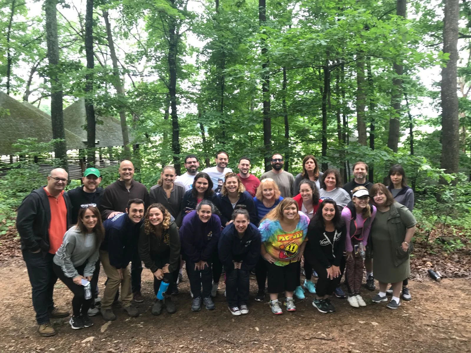 At 8:30 we headed outside for our morning of ‘team bonding.’ First we all introduced ourselves and gave an ice cream flavor we liked. I said cookie dough. Then we did some random activities that basically everyone knew from summer camp. I did not. I do not regret that. There was this one game where you play rock paper scissors and when you win the loser has to start cheering for you. From there we trekked to the woods. I called it a hike, even though I guess it was a road. Then we had to stand in the forest, on wet leaves. Basically what you avoid stepping in on a regular basis, you were purposely stepping in. We were divided into three groups to do even more activities! So many activities! One activity was standing around a person who sort of did trust falls, and we would push them back up. Then there was this thing that involved swinging on a rope. Yep, I swung on a rope. It was interesting. That ended around 10:30 and we went back to change into more professional clothes.