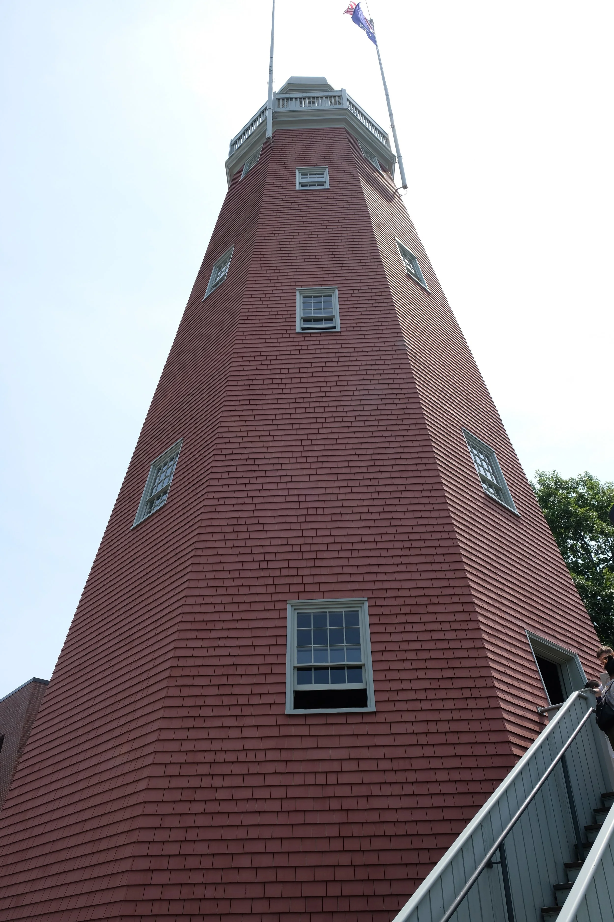 We finally made it to the Portland Observatory, a maritime signal tower built in 1807. To be clear, it’s not a lighthouse – it’s a signal tower to communicate with ships coming into the port. The tower is all wood, has no ac, and is 103 steps to the top. We waited a few minutes and then got a guided tour from a fairly large man with a white mustache who looked like he would be from Maine. It was so hot. It was a very informative tour and everyone else enjoyed, and Hallie was a little bit difficult during it. We made our way to the top, stopped on each of six levels to hear about the tower. At the top were very nice views of the whole city which I took in for a hole 30 seconds before having to go back downstairs with Hallie.