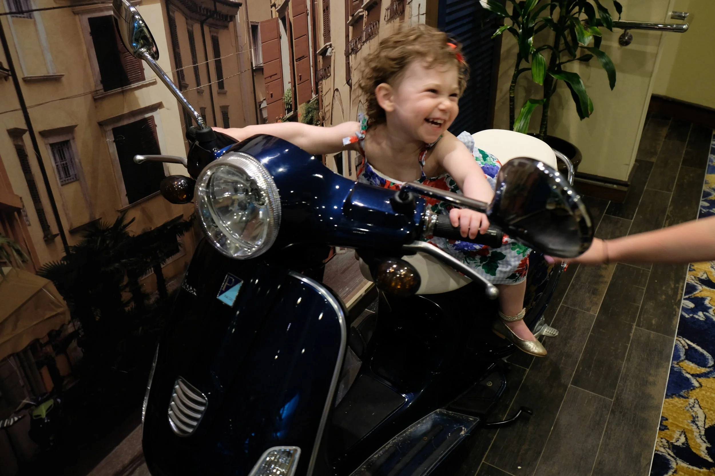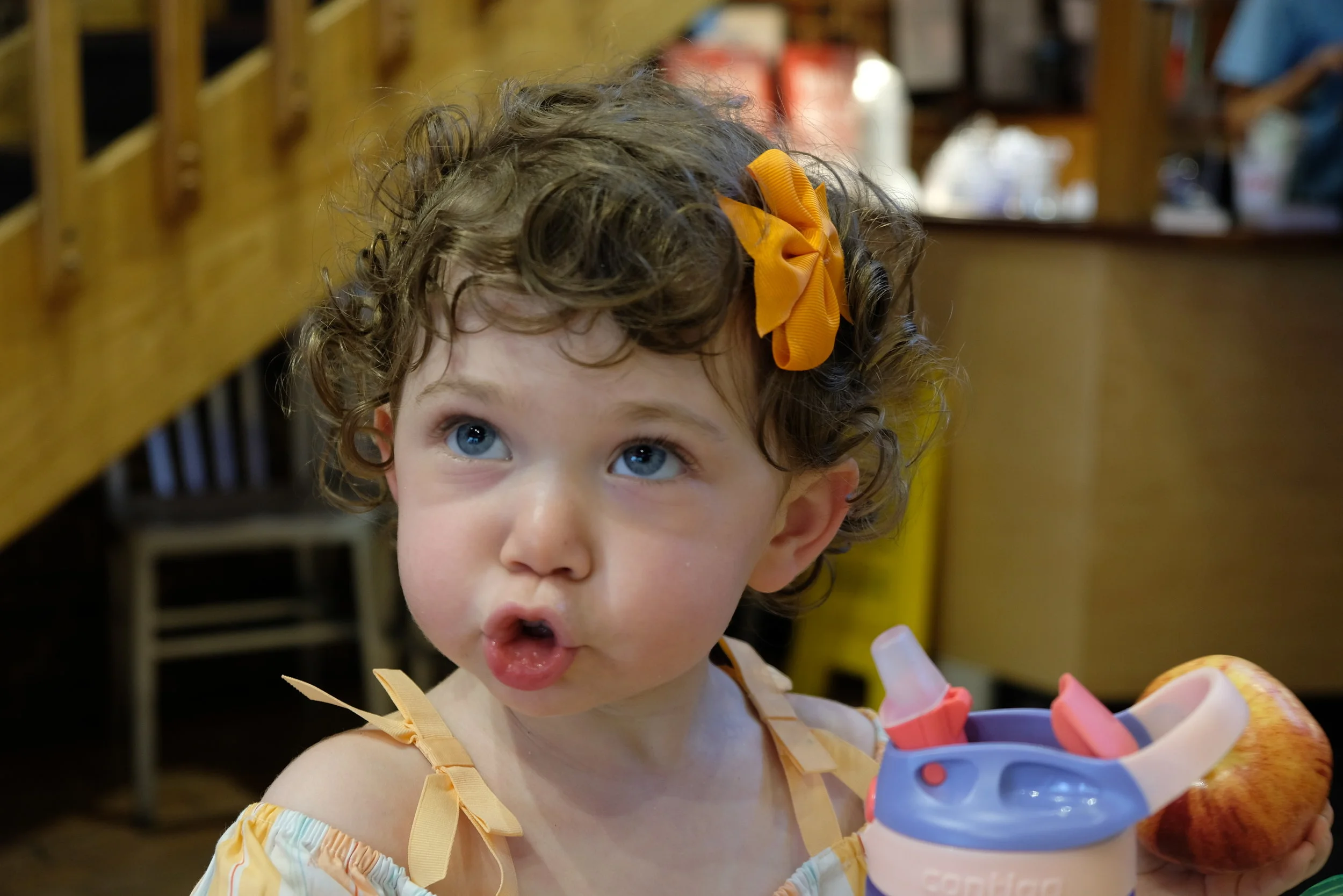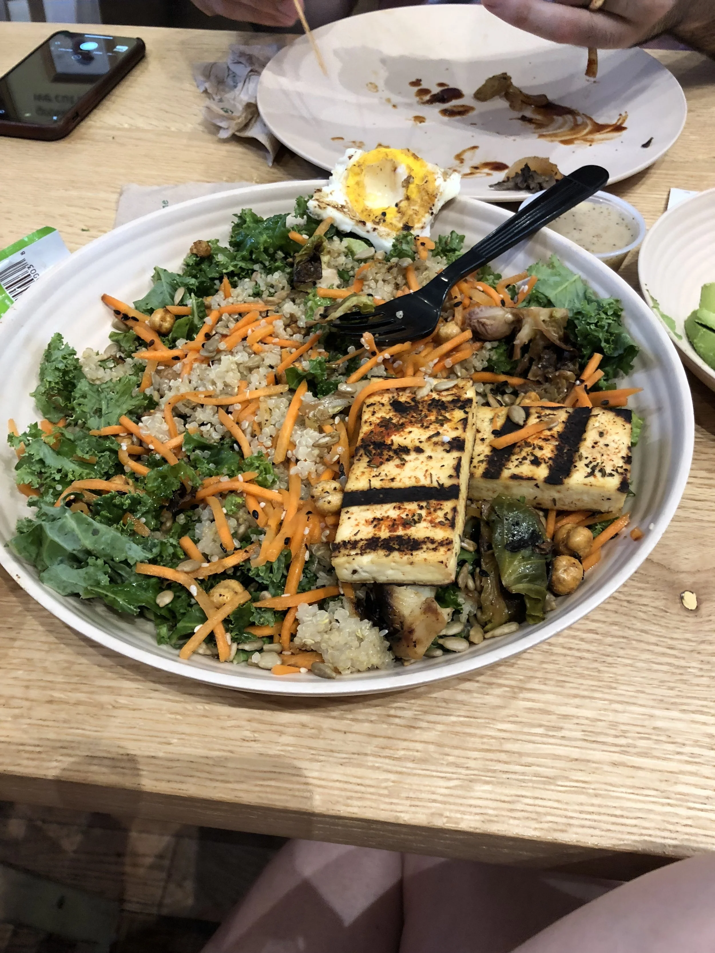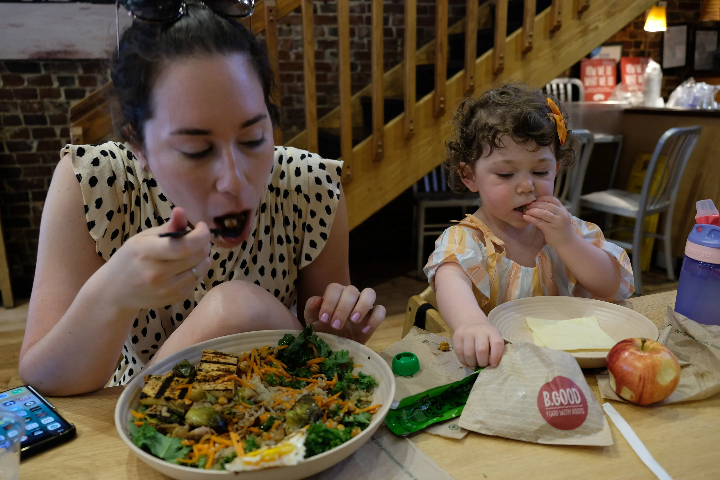 After the bakery people were hungry and tired. We had a seen a fast casual place with vegetarian options a few blocks back, but my parents weren’t willing to walk back, so we split up and they went back to the ship. The restaurant was called B Good. I ordered a kale and tofu salad with avocado and Tzvi ordered a veggie burger with gouda cheese. We ordered just a plate of cheese for Hallie. When the food came, the salad was missing the avocado, the burger was missing the cheese, and we didn’t have Hallie’s plate of cheese. The waitress apologized and they got us the missing items and all was delicious. We also got fries with ketchup, which Hallie of course devoured. After lunch we walked back to the ship, stopped to buy Hallie stickers at an overpriced paper store. I think it was something like 20 cents a sticker.