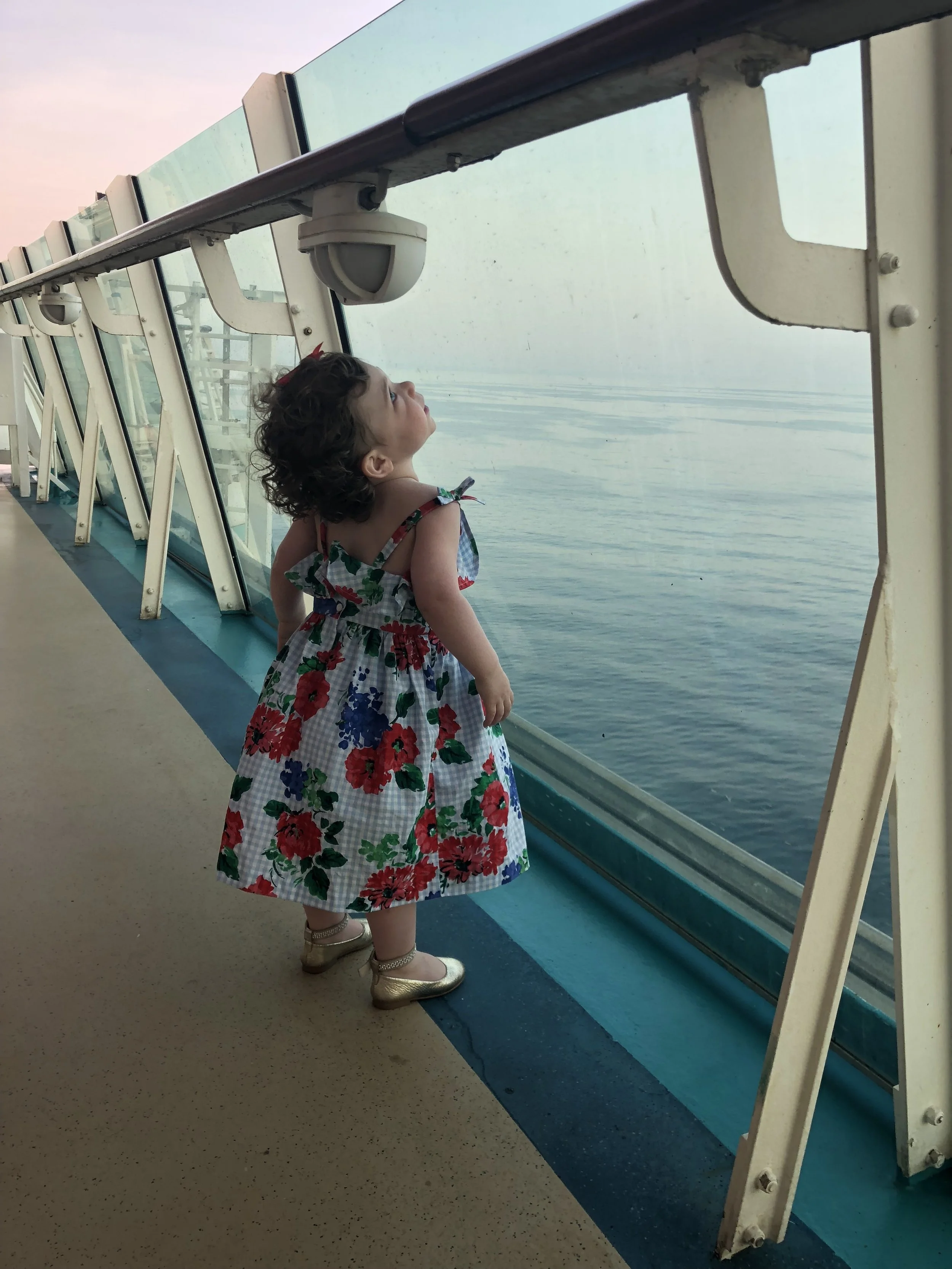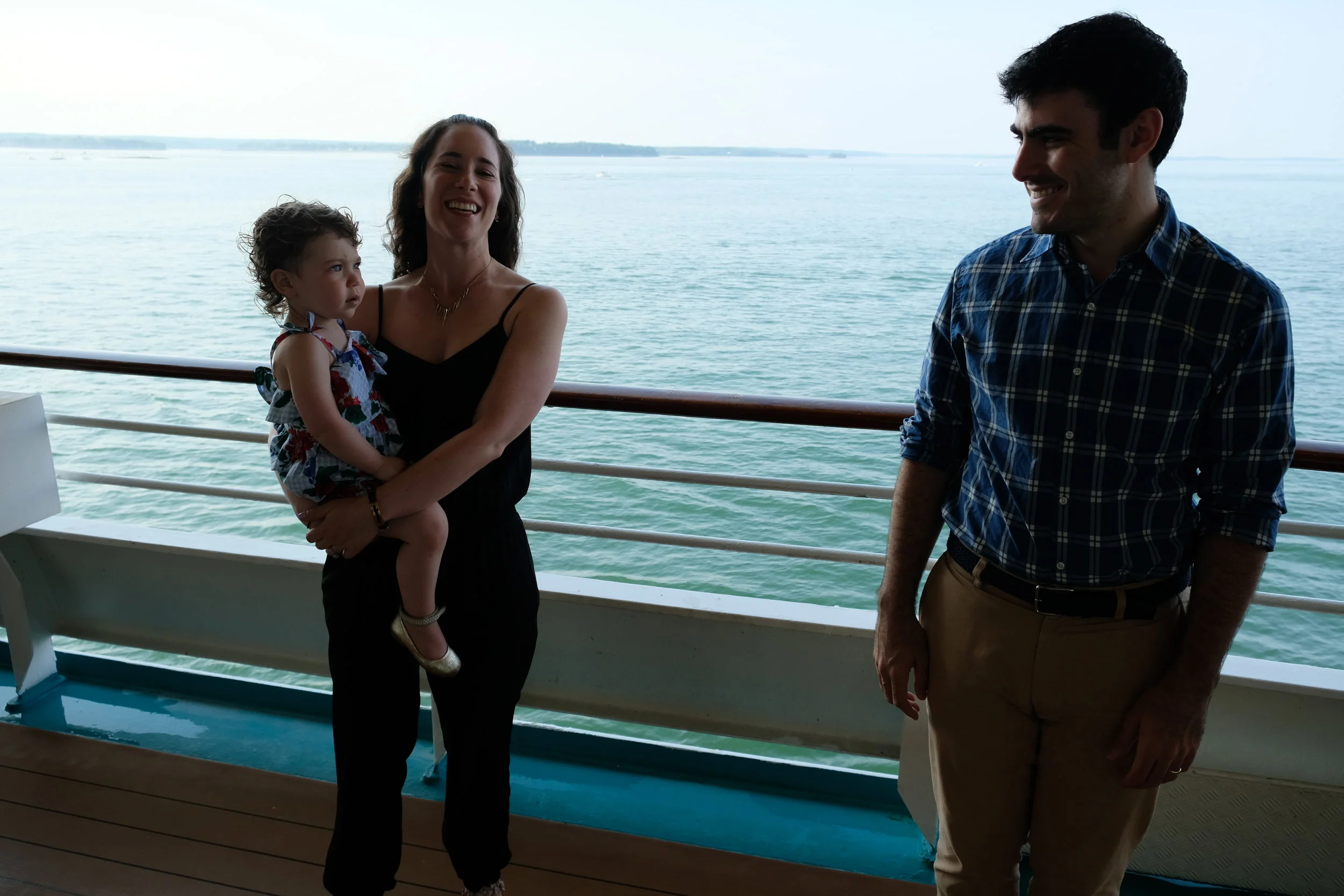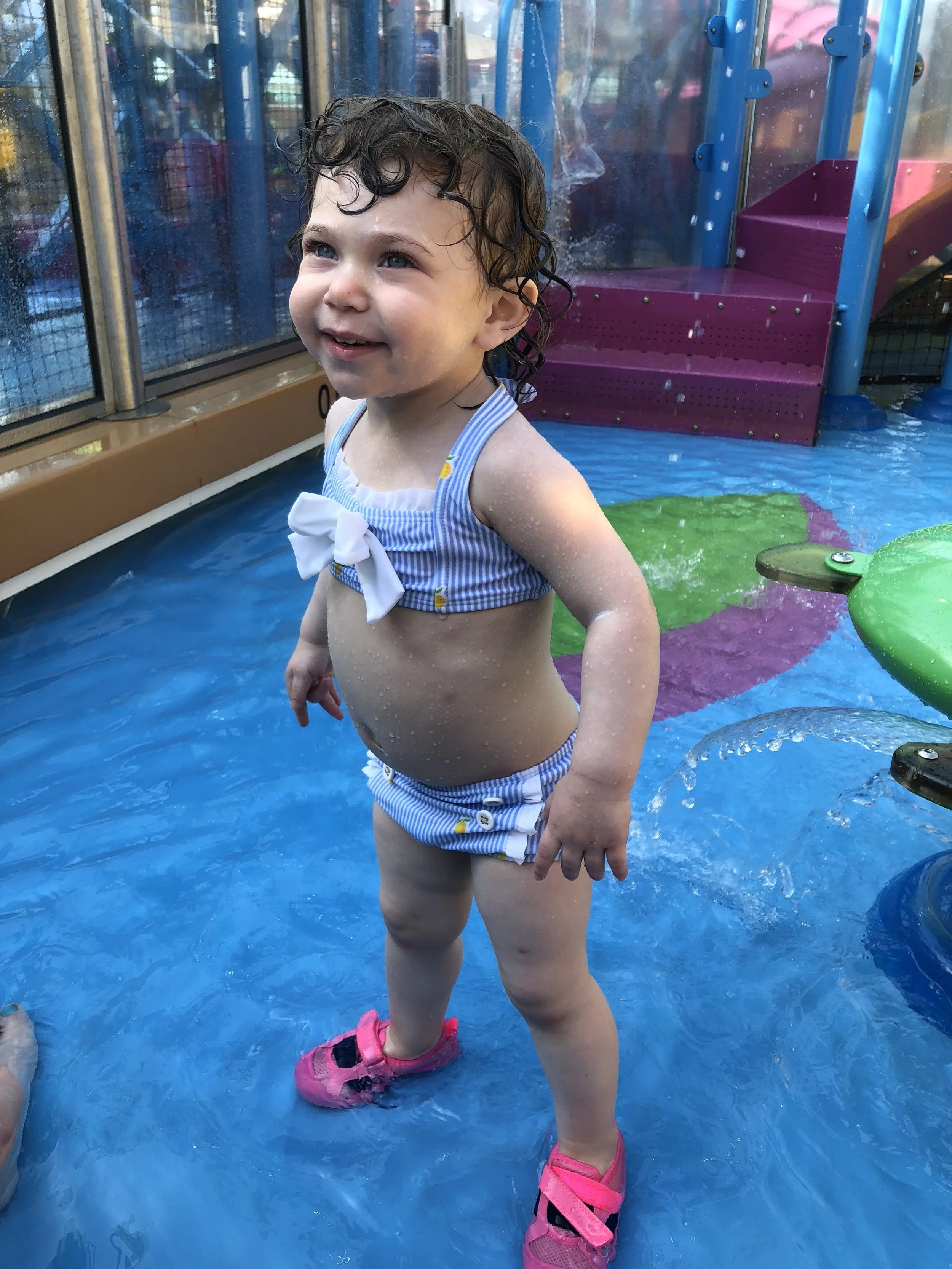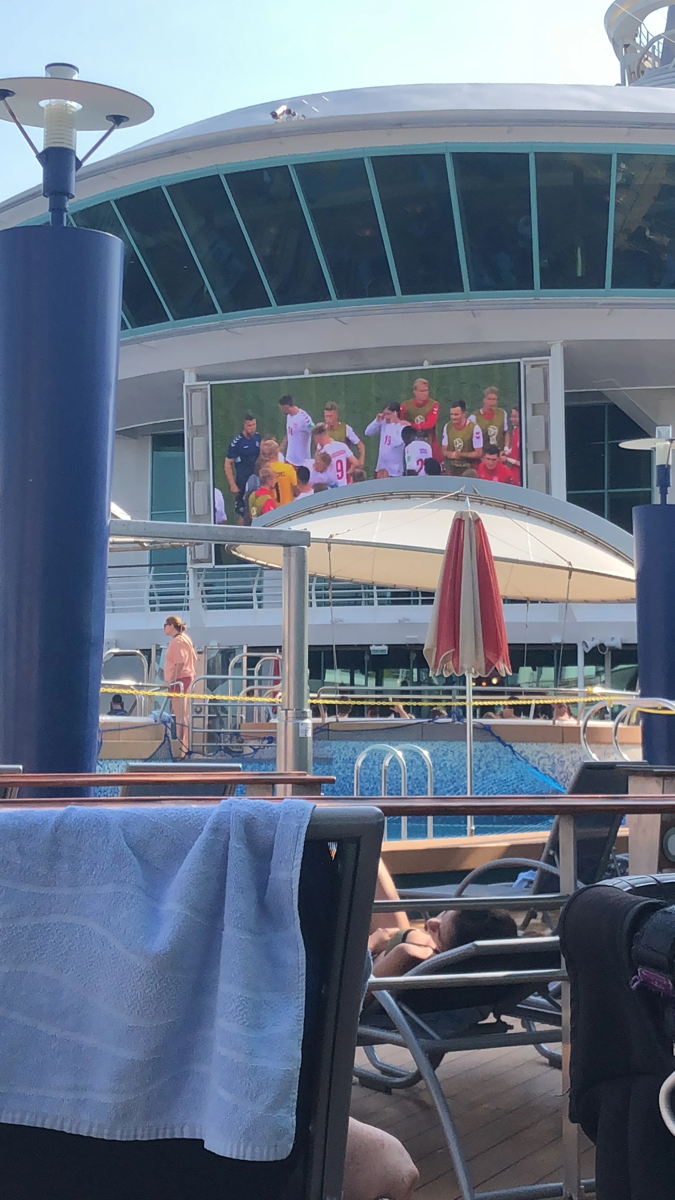 Once we got back on the ship we ate a bunch of donuts and then changed into bathing suits. We took Hallie to the splash pool, which she loved and played in for almost an hour. The Croatia vs Denmark world cup game was on the big screen over the pool and people were very excited about it, especially once it went to penalty kicks. We got a cocktail. Nice afternoon.