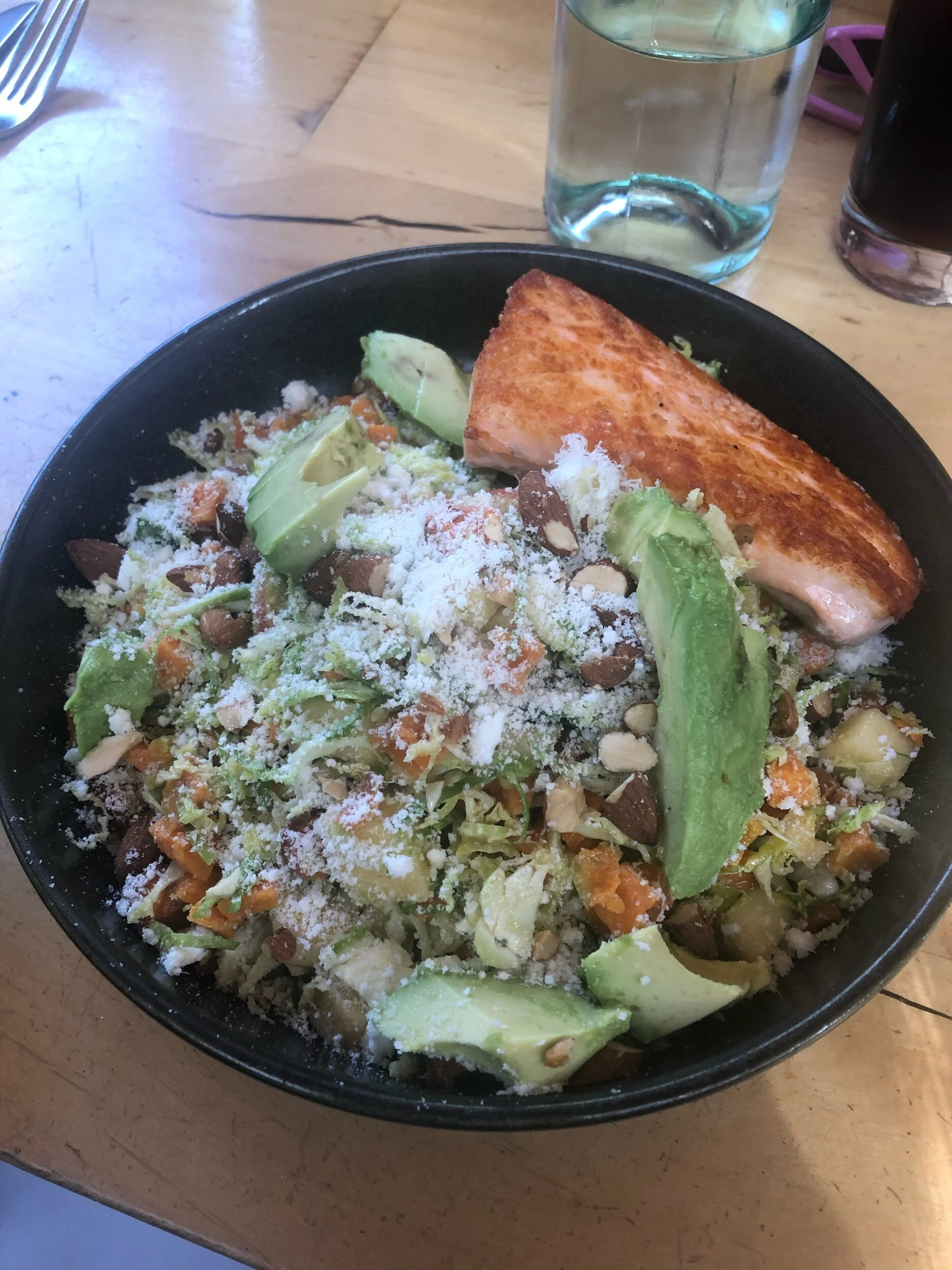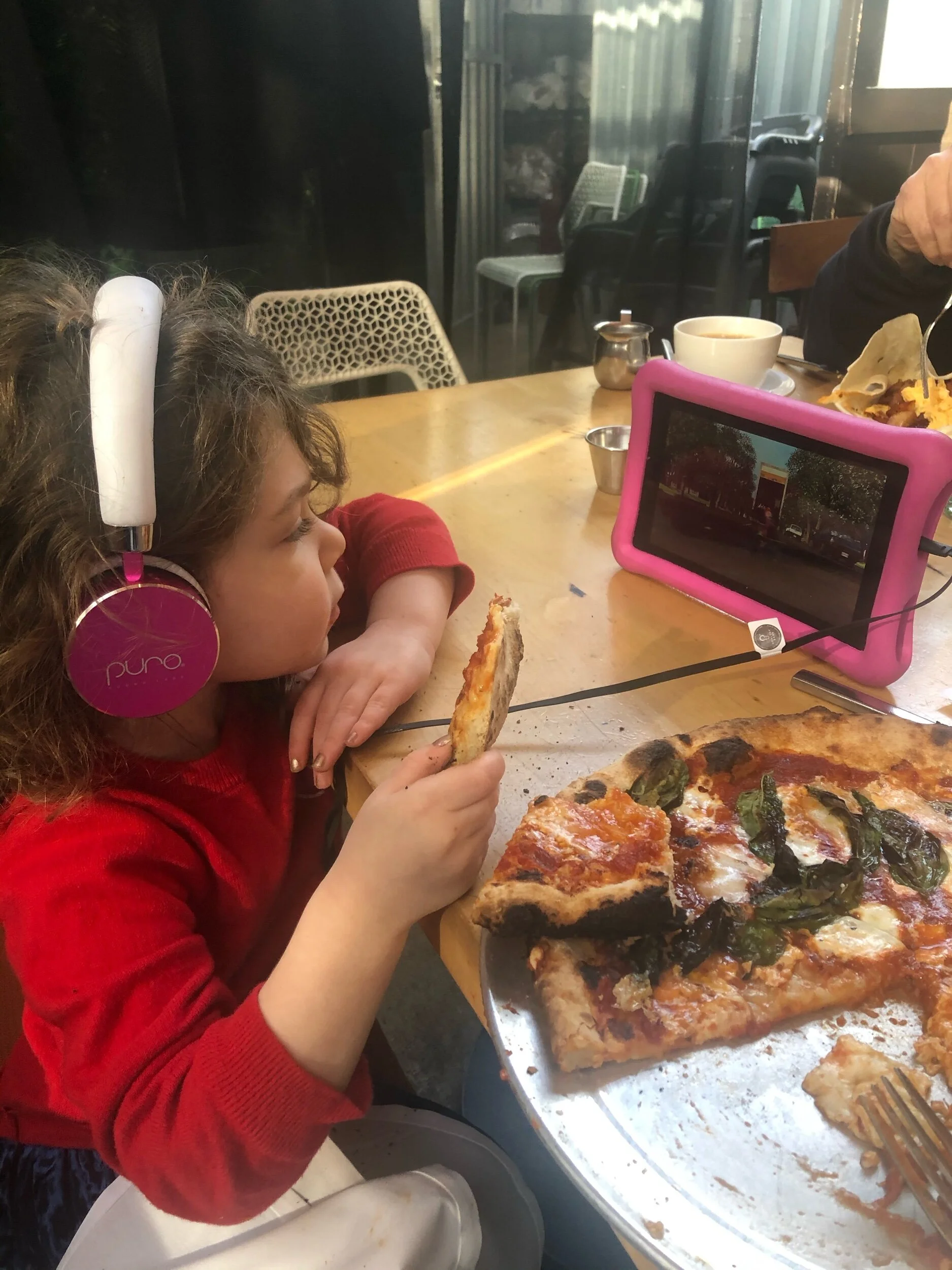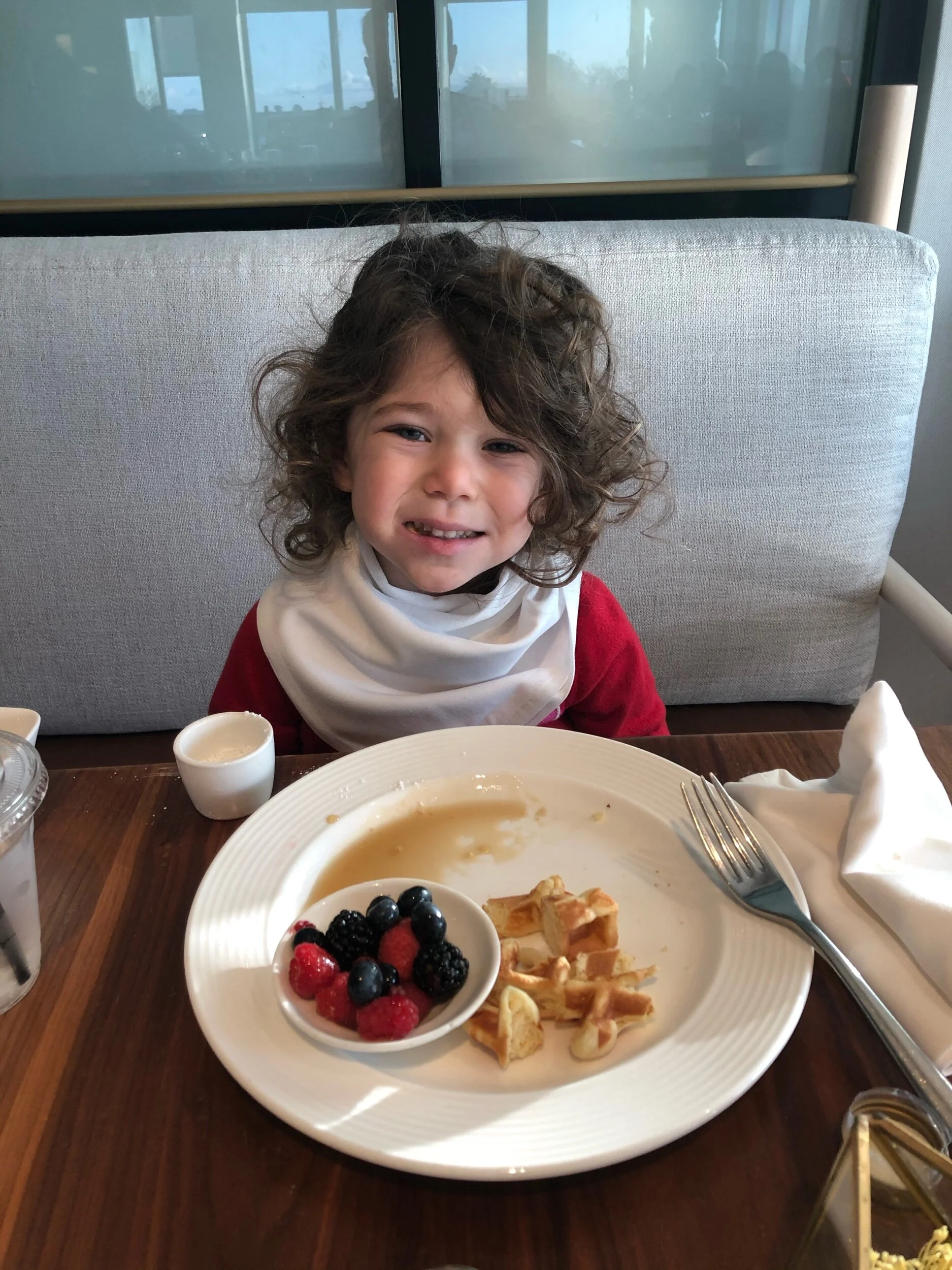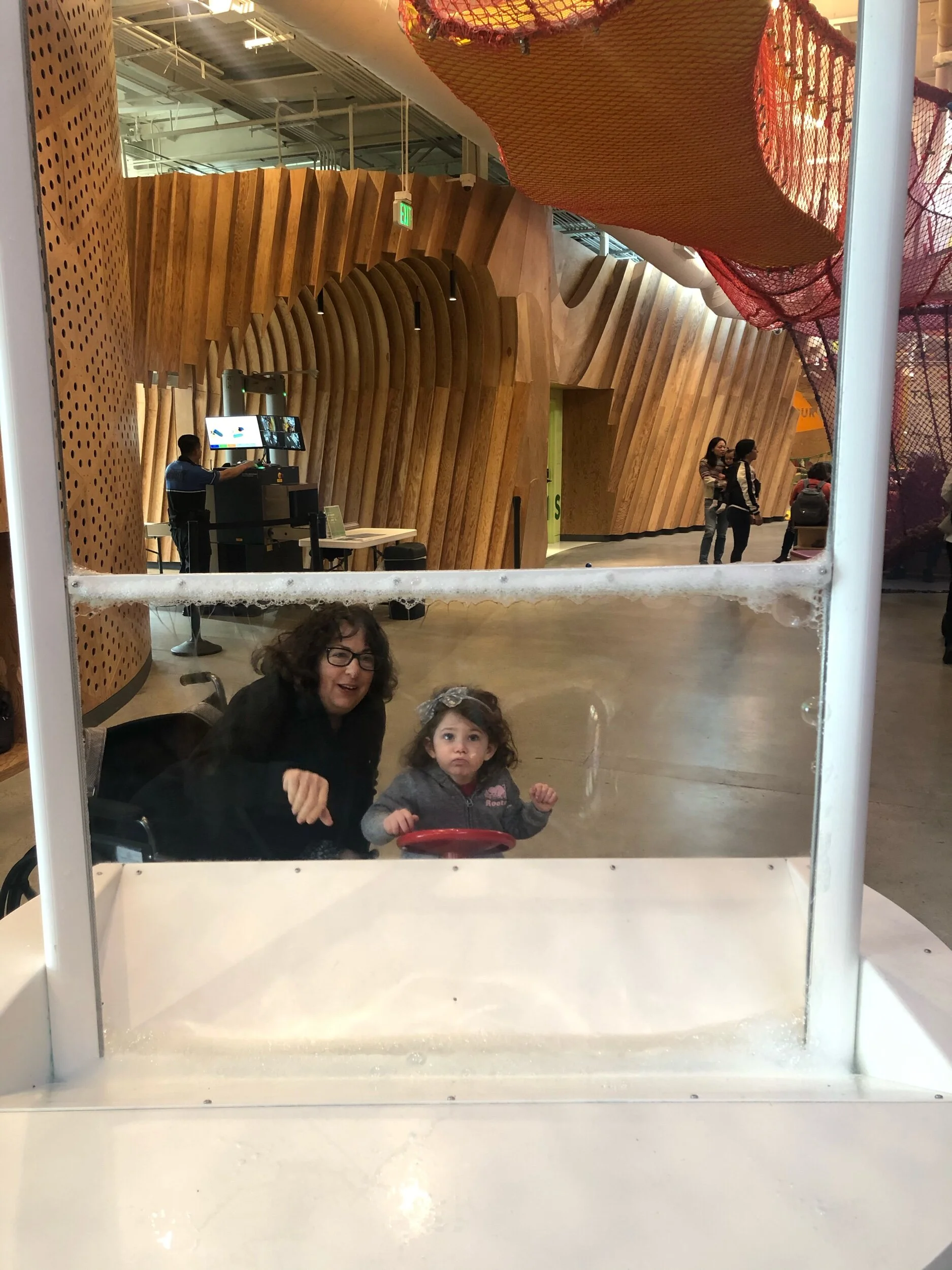 Under normal circumstances I probably would’ve had to spend a lot of the day doing work, but between dealing with Hallie and Steph I ended up screwing up enough stuff that they recognized I wasn’t capable of doing work and taking care of my family, so they graciously let me off the hook with the work. Hallie and I had breakfast again in the lobby (Hallie had a waffle) and then hung out at the hotel until my parents picked us up. We drove to Santa Monica and spent the morning at the Cayton Children’s Museum, which is a huge play space for kids. Hallie had a blast. She loved the ball pit and spent a while painting a sheet of paper completely green. After playing we drove to Venice and had lunch at the Rose Café. The weather was great so we sat outside. I needed a break from Hallie so I let her watch Toy Story during lunch. She ate almost a whole pizza (which was incredibly delicious) and I had a fantastic salmon salad. I also brought a box of pastries back for Steph, which were all tasty.