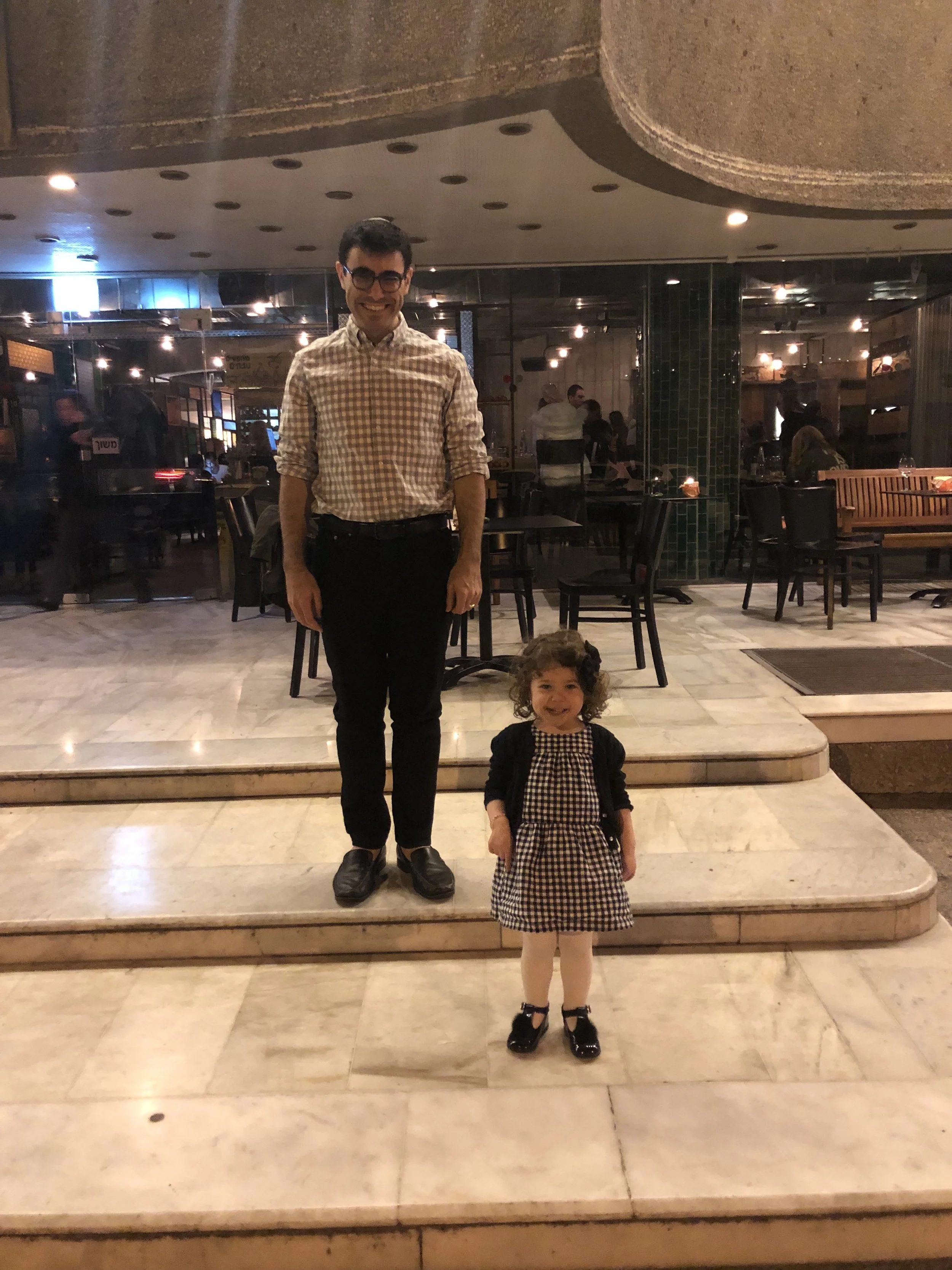 Tzvi and I met back in the room at 4:45 and got ready for dinner. We made it out around 6 and drove a half hour to Tel Aviv. We tried to find parking near the restaurant but there was no street parking, so Tzvi dropped us off and decided to drive around one more time before going in a lot. As soon as he passed the restaurant and turned left the waze said he was ten minutes away. So much for going around the block. Luckily when he got back to the street where the restaurant was he found a free street spot right there.
