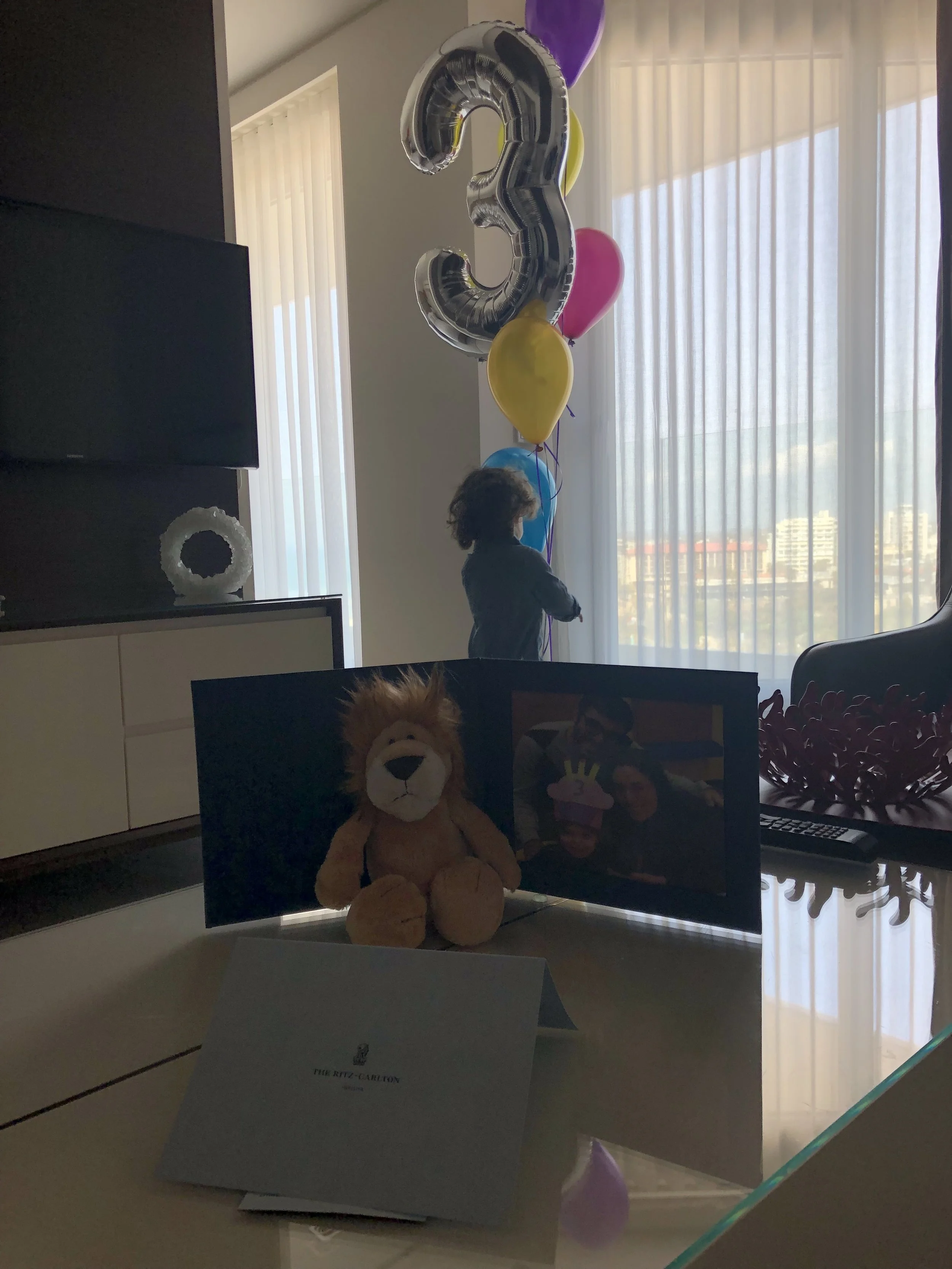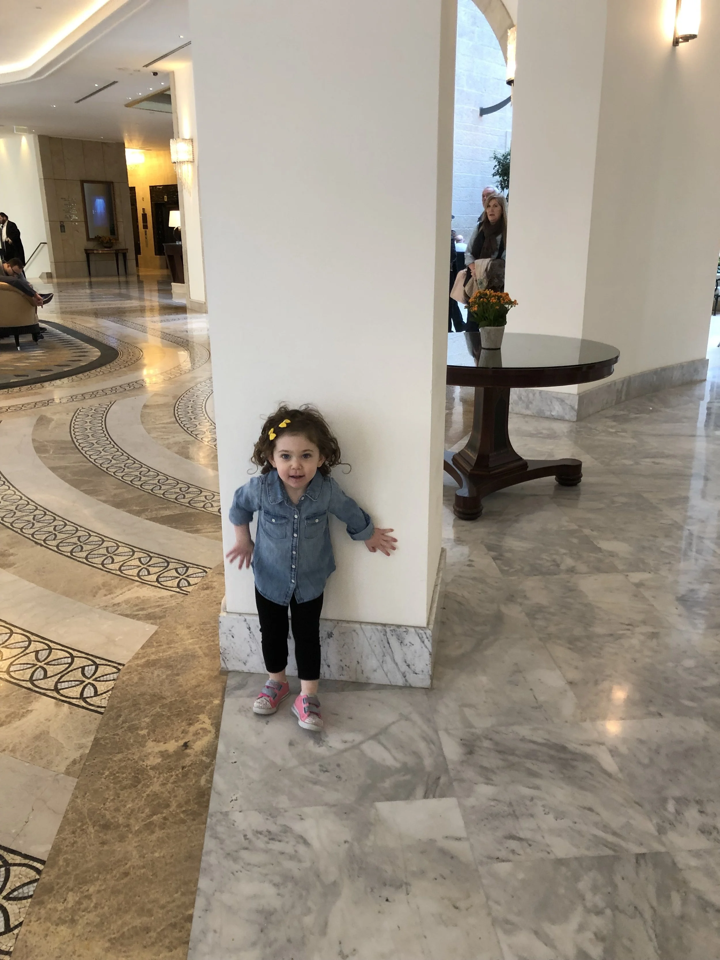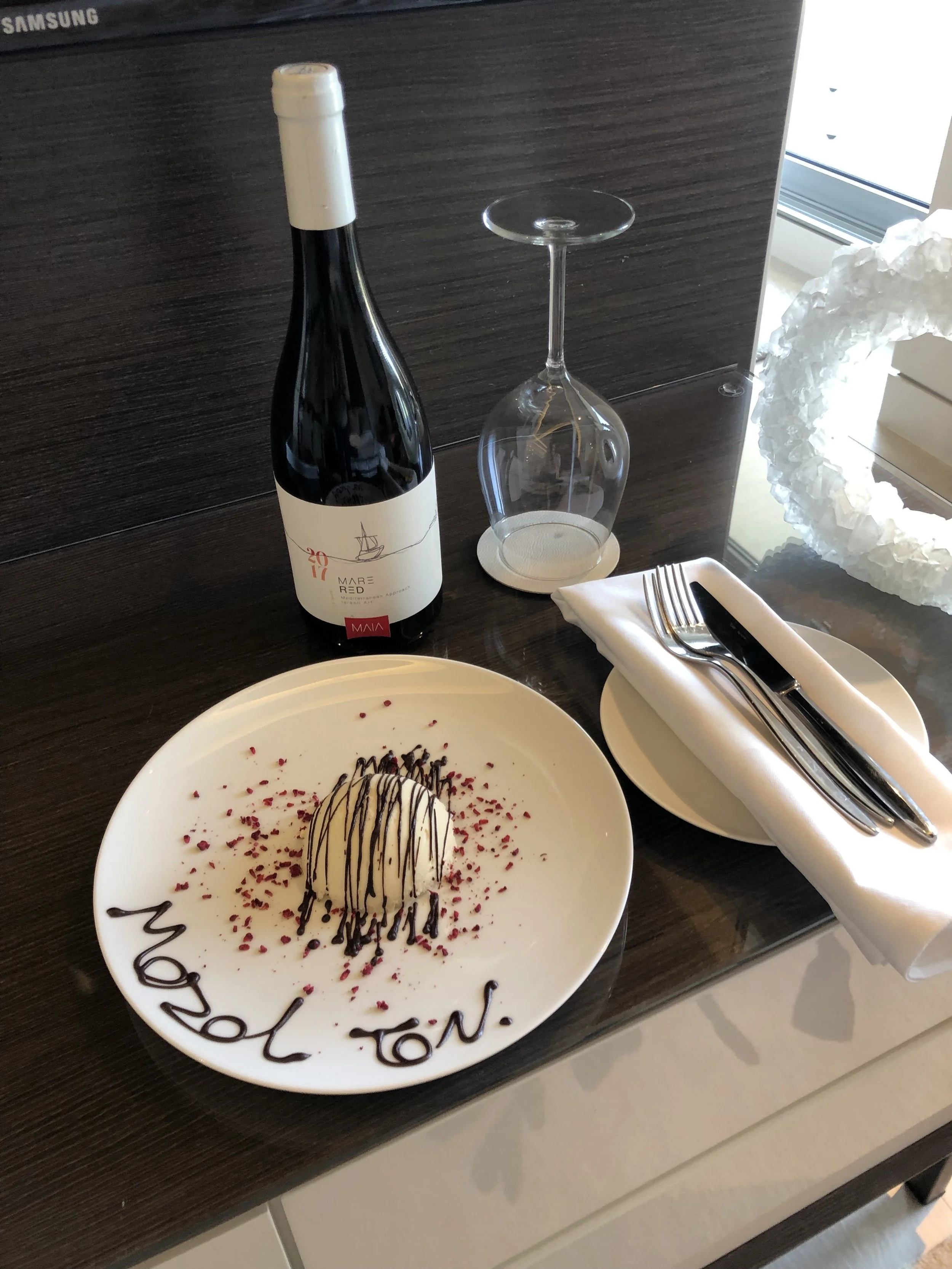 We drove the hour to Herzliya and checked in at the Ritz Carlton. The hotel is on the marina/beach. My parents actually stayed here for a couple of nights at the beginning of their trip and told the guest relations manager, Katie, that we were coming for Hallie’s birthday. Katie met us in the lobby with balloons and told us there were more surprises for Hallie in the room. A bellhop led us to our room on the 10th floor, and just as he was opening the door, Tzvi turned to me and said, “we got upgraded.” At check in they told Tzvi that we got an upgrade because of our Marriott status, but he kept it a surprise until we got to the room.