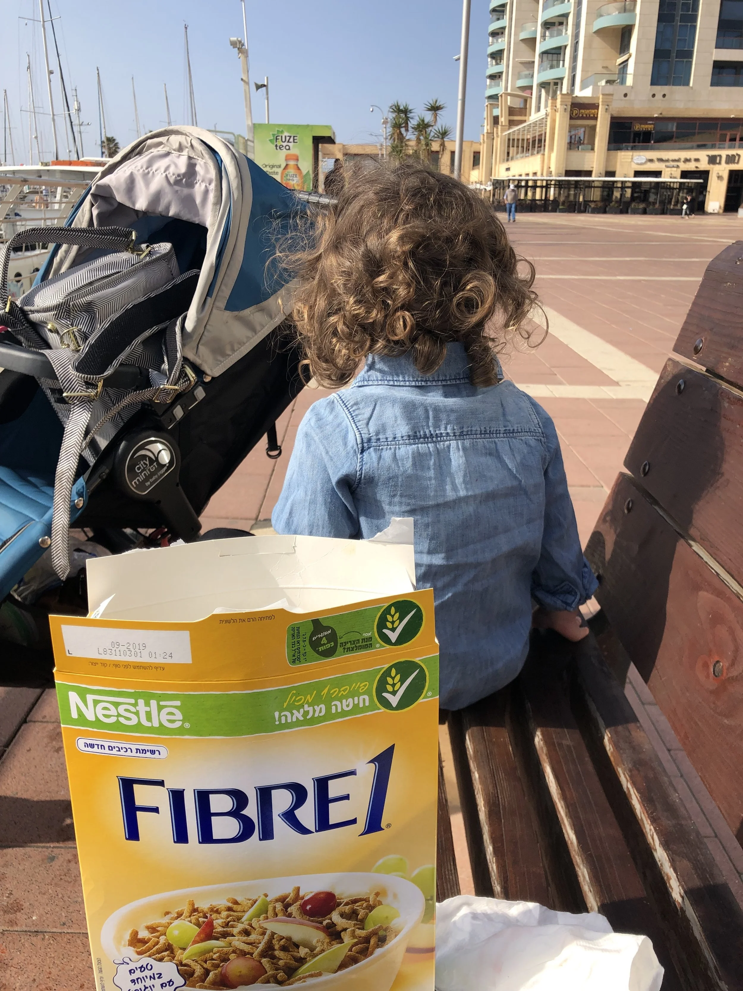 Steph: While Tzvi was at his massage I took Hallie around the Marina. There’s a little mall next to the hotel so we walked through looking for food. I ended up getting Hallie some strawberry Dannon yogurt and Fiber 1. Good lunch. She sat outside and ate it looking at the water. I tried to get her to go to sleep but that never happened. Finally it was time to switch.