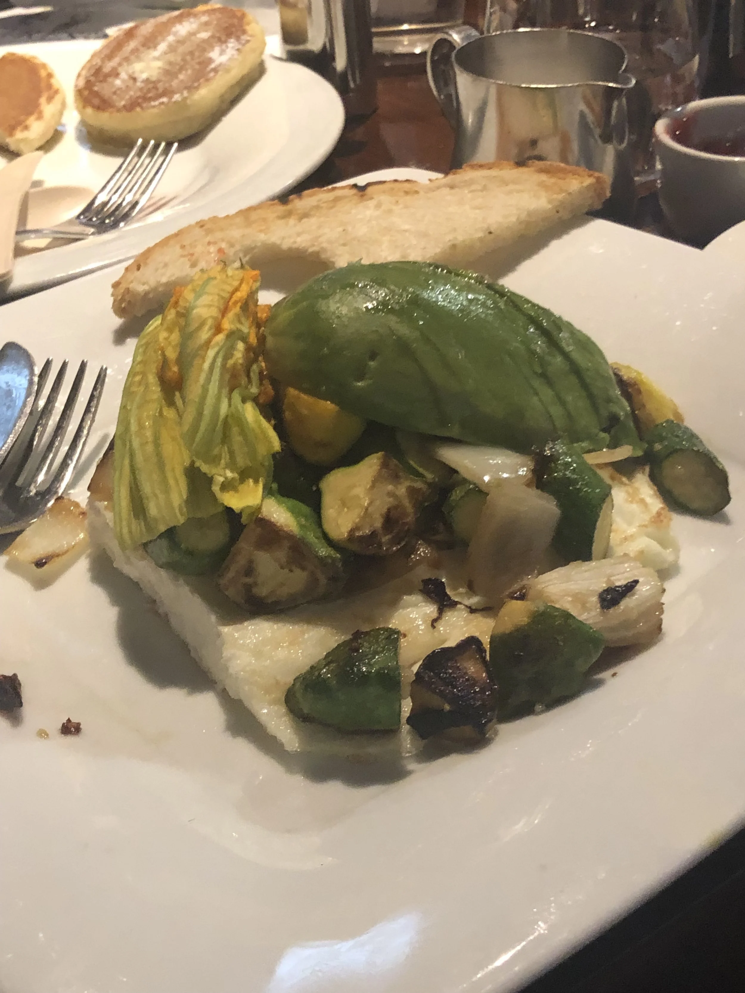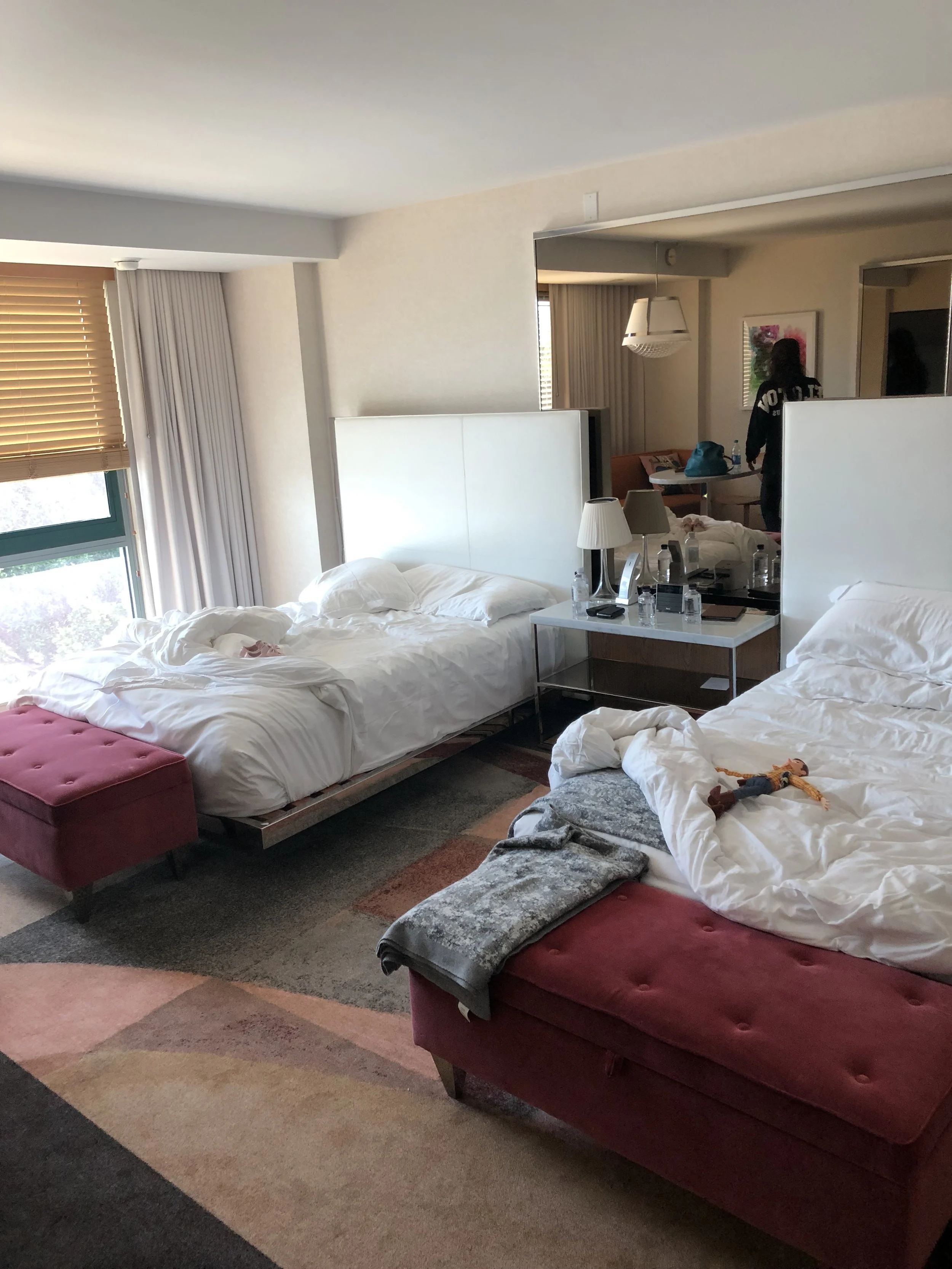 Sherry and Mark came to join us for a last breakfast at the SLS. Instead of the buffet we ordered a la carte this time, which was a wise choice because everything was delicious. Hallie had pancakes again, and got so excited when they arrived that she started singing Happy Birthday to herself. The waiter said he had four daughters and must have found it cute because he brought her a muffin with a candle in it “for her pretend birthday.”