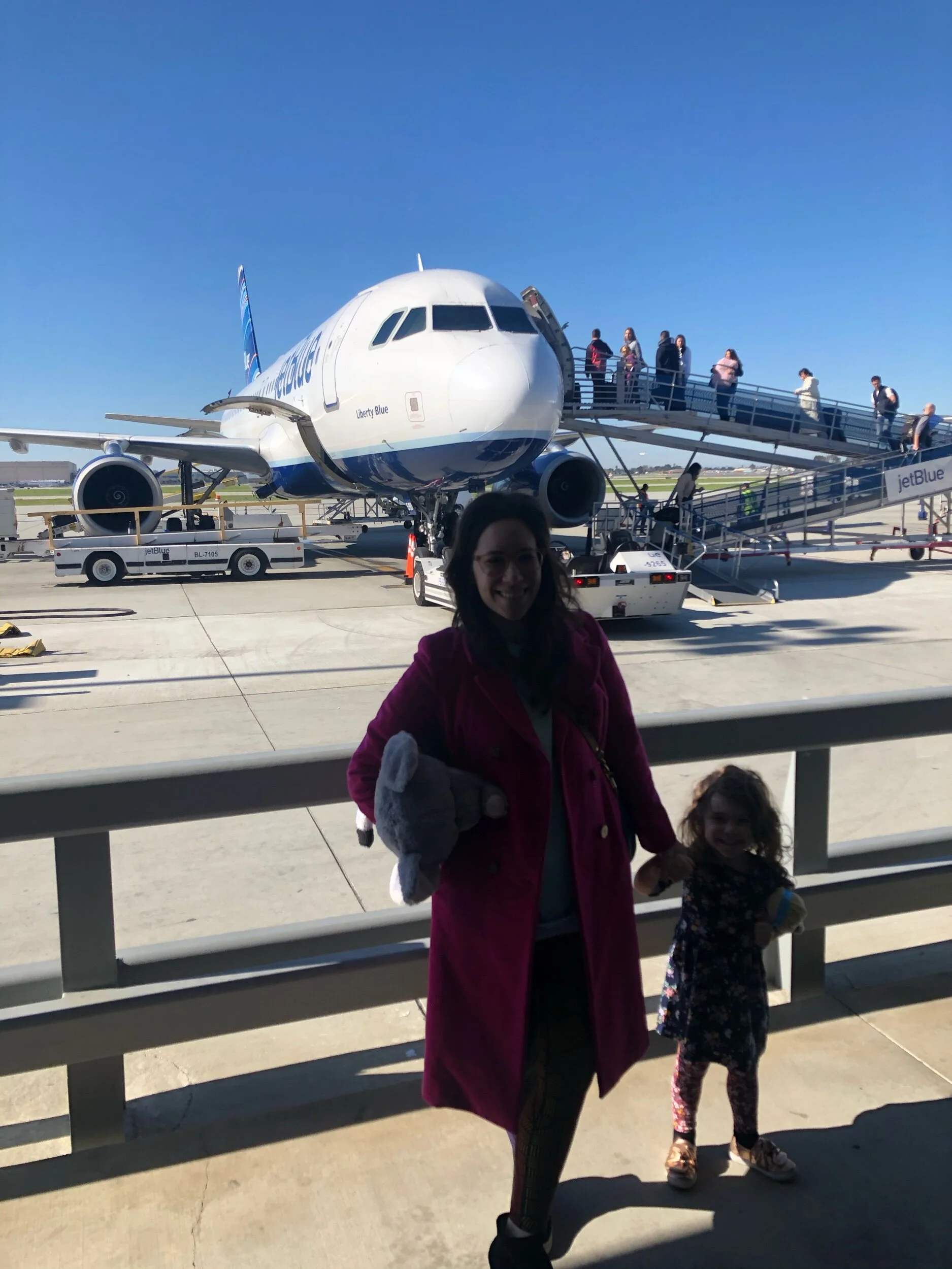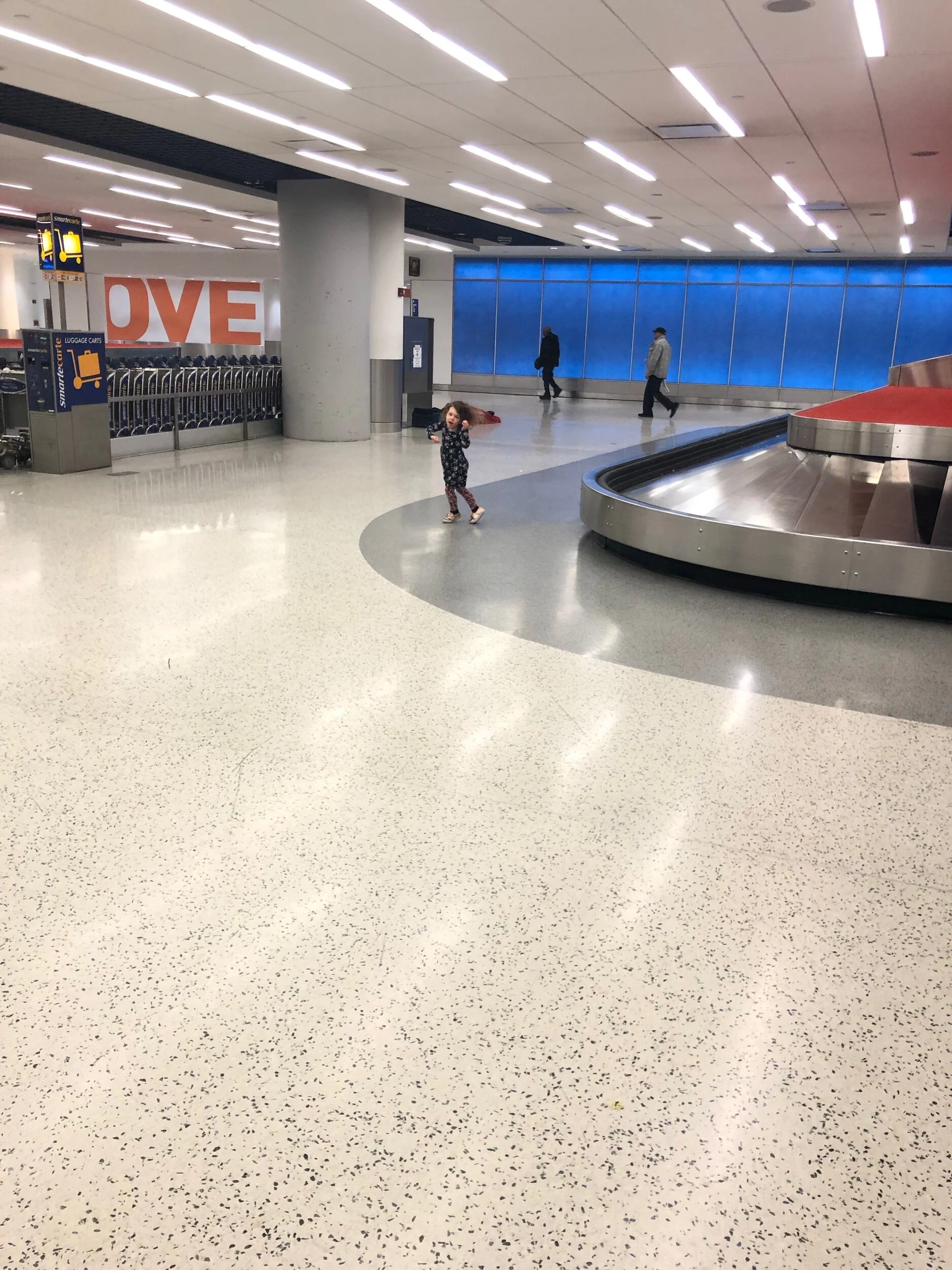 By the way, I should mention that we chose to fly out of Long Beach, while my parents were taking a flight at the same time from LAX, because we wanted to save my parents $300, and we figured we’d be fine alone because wed’ have Ofek… Well, the flight was fine - a little turbulent - and Hallie slept for a nice chunk of it. We made it to JFK and found my parents and Babi at baggage claim, where we heard that Babi kept getting up to go to the bathroom during the heavy turbulence.