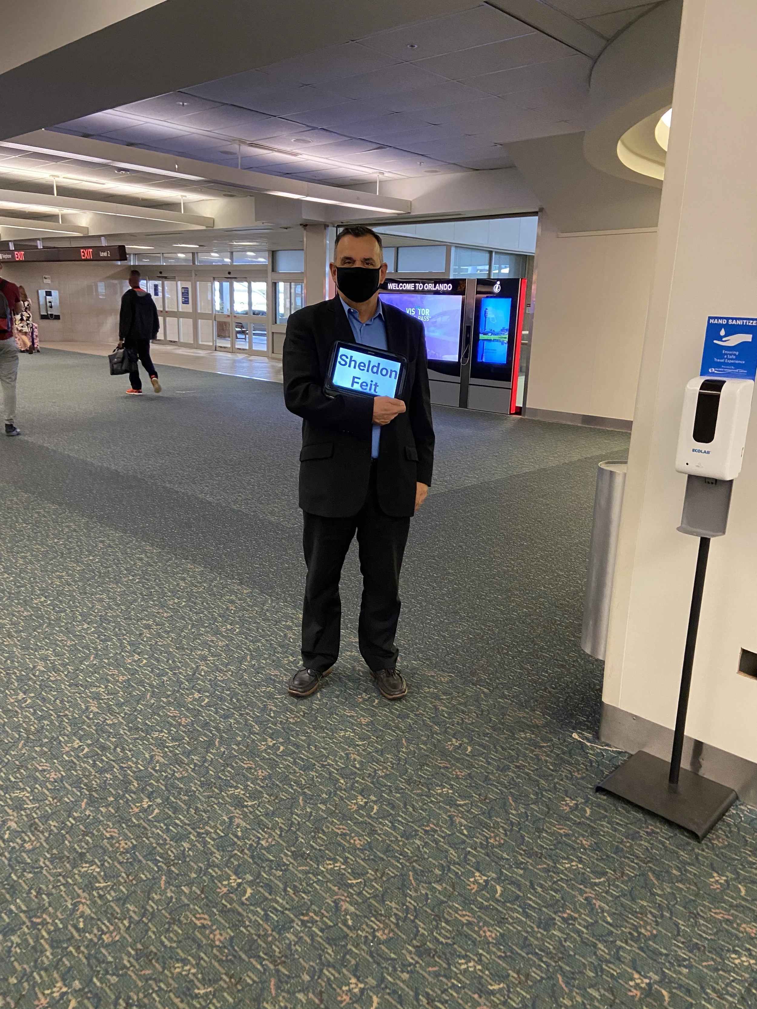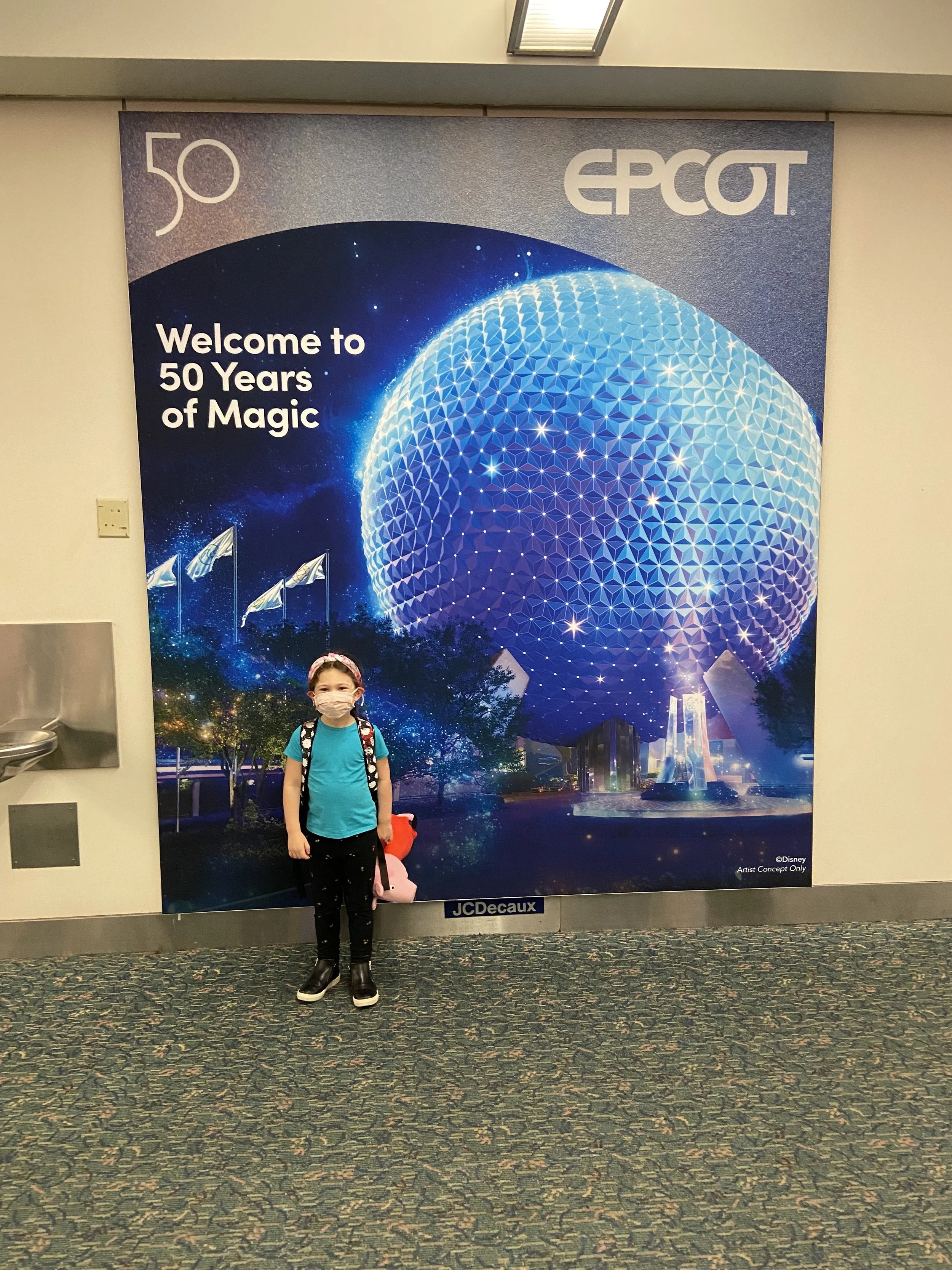 Walking through the airport felt like we never left. We headed to the train to baggage claim and saw the 50th anniversary décor. Very exciting! At baggage claim a man was waiting for us with a sign that said Sheldon Feit. We had to wait a while for the luggage, and then it was pouring rain when we got outside. The driver had been prearranged with the hotel and he brought a Mercedes Sprinter Van. Thankfully Madeleine fell right asleep, and the ride was about 40 minutes.