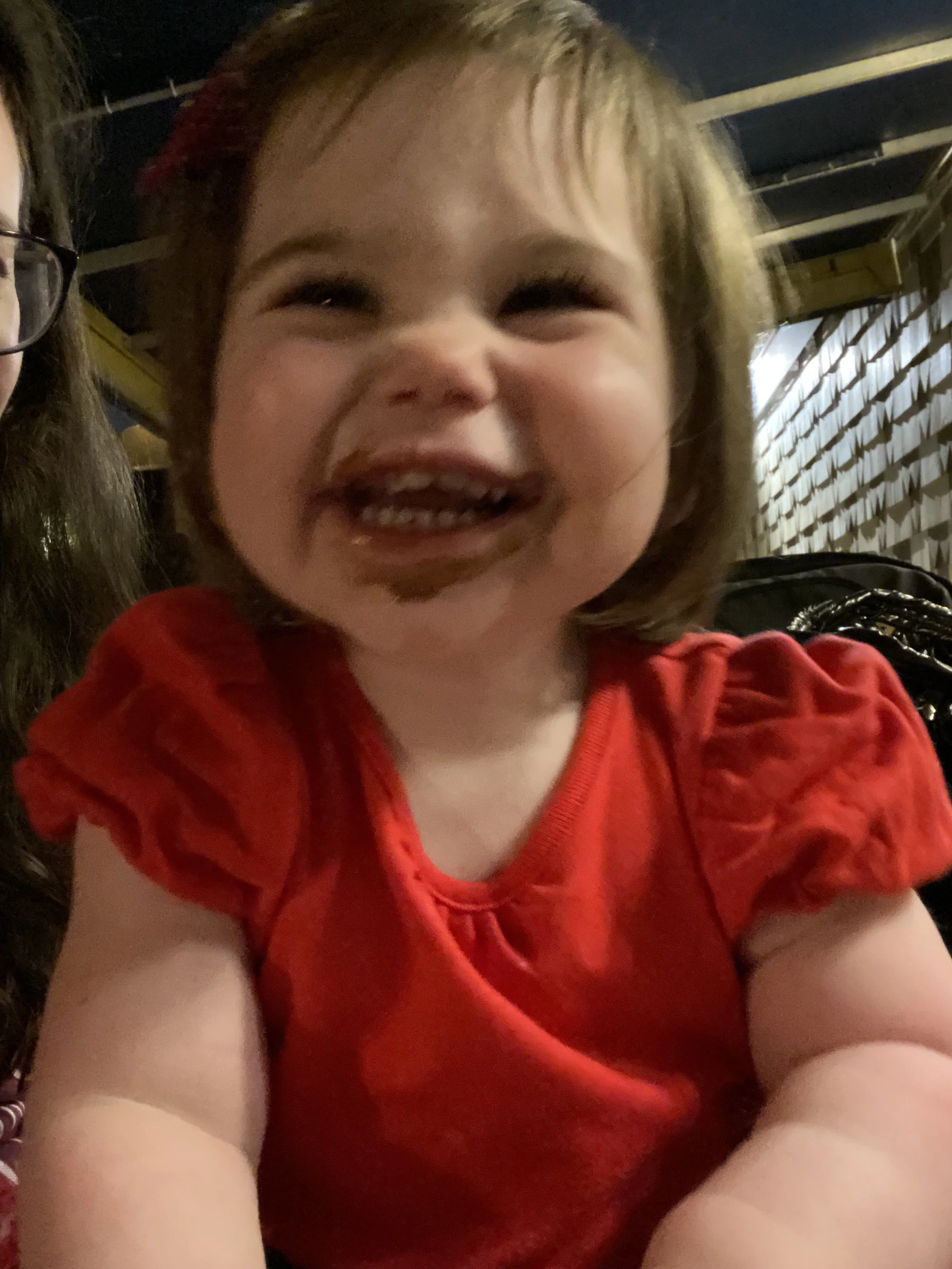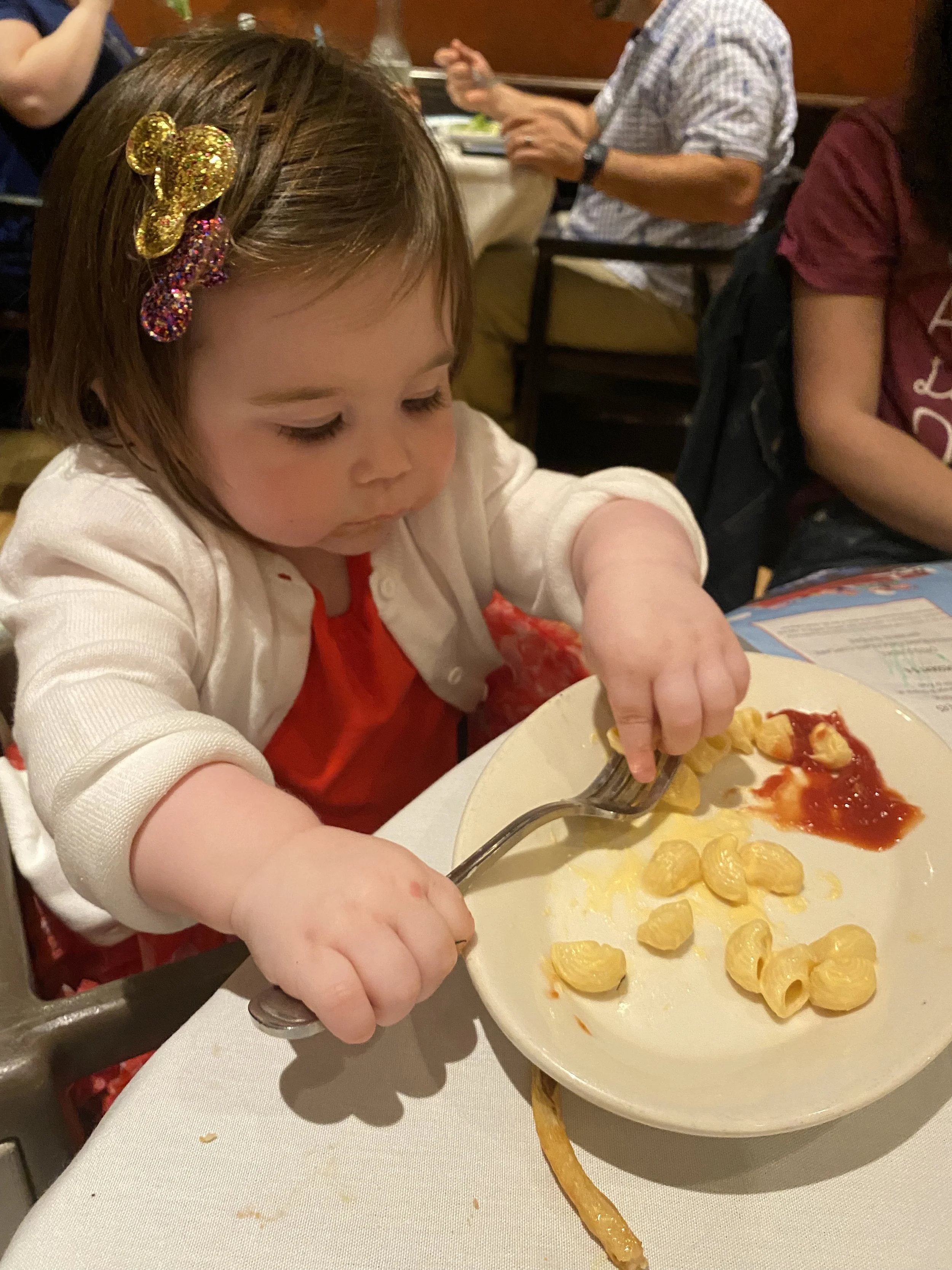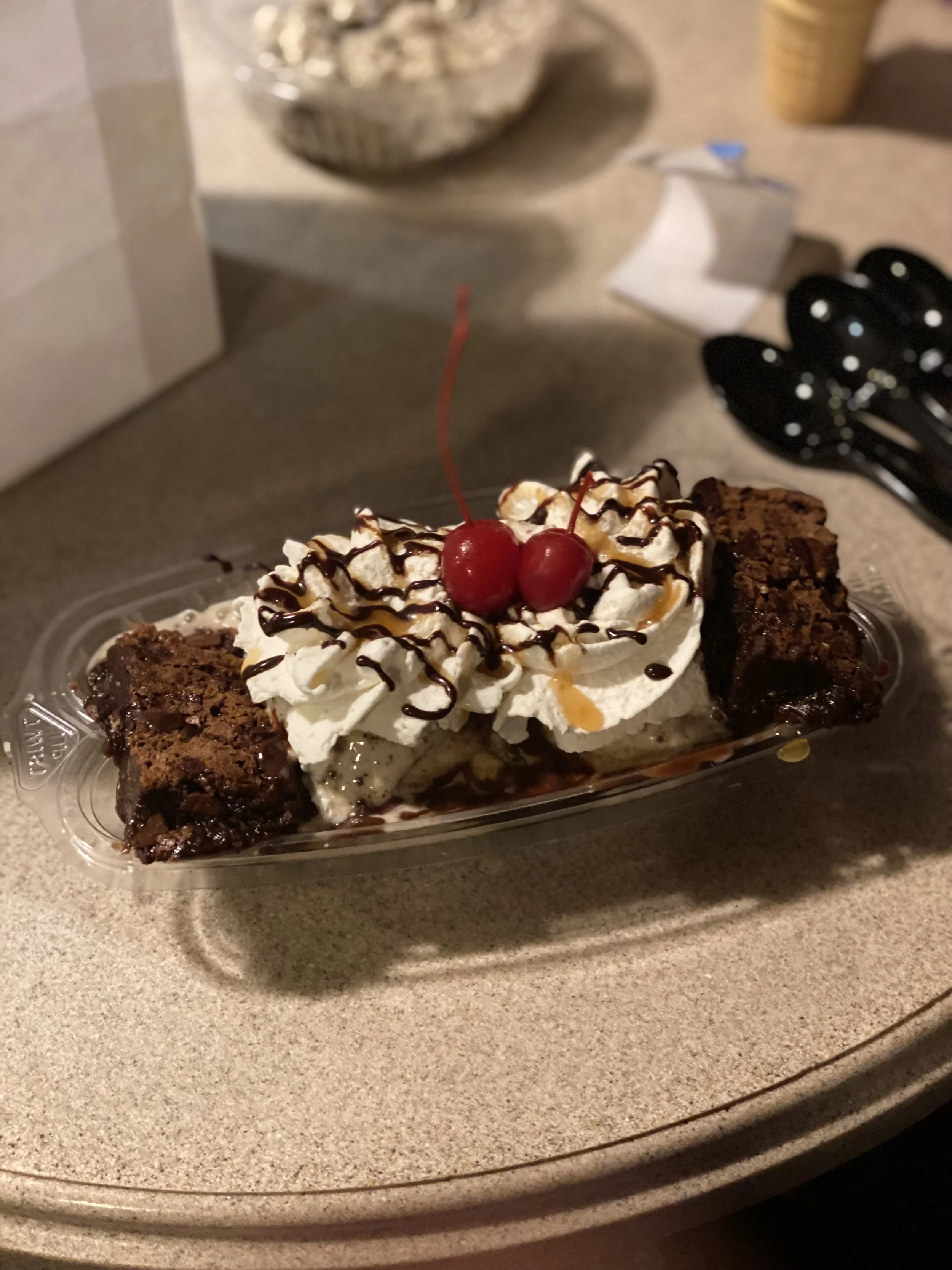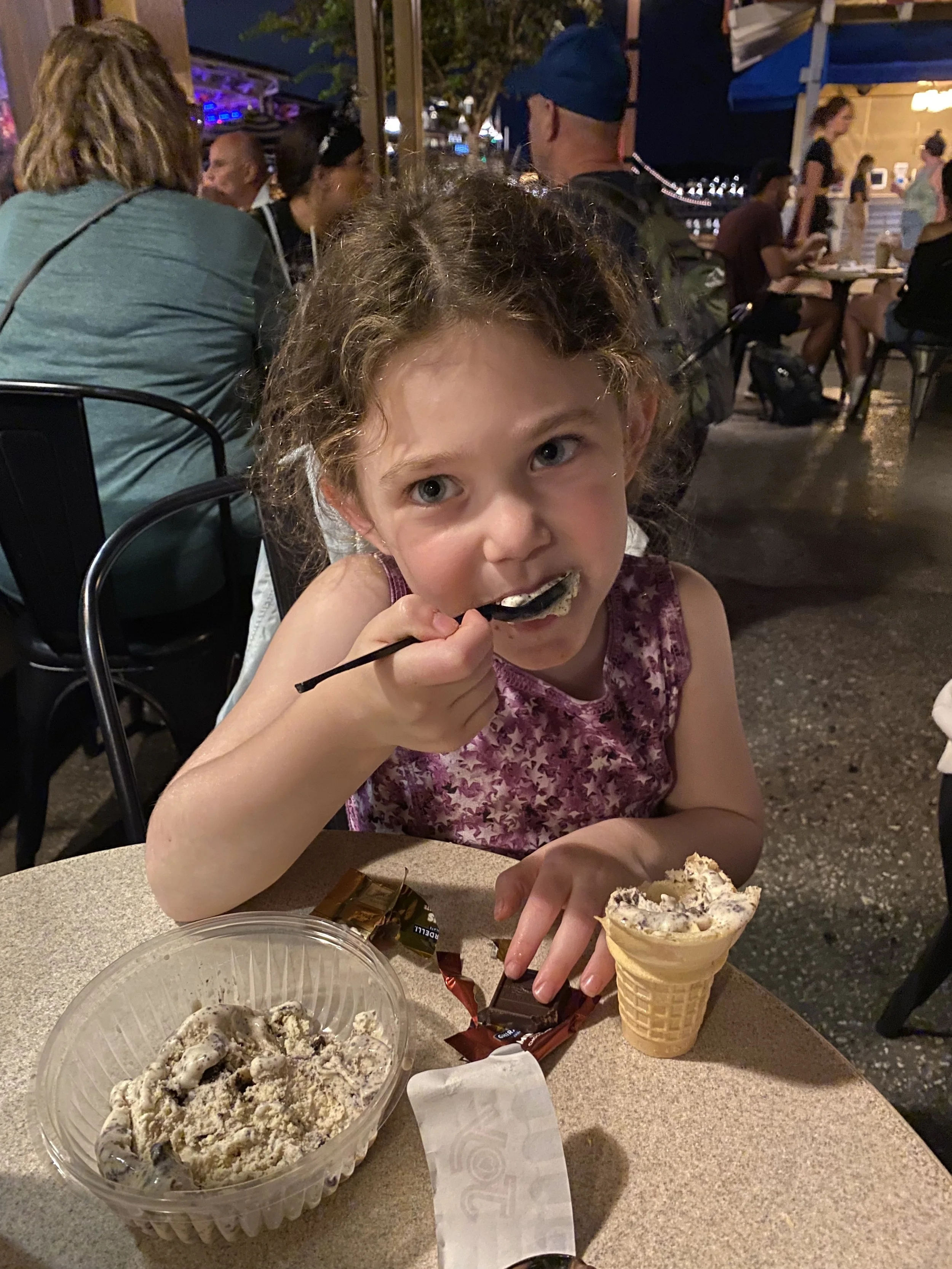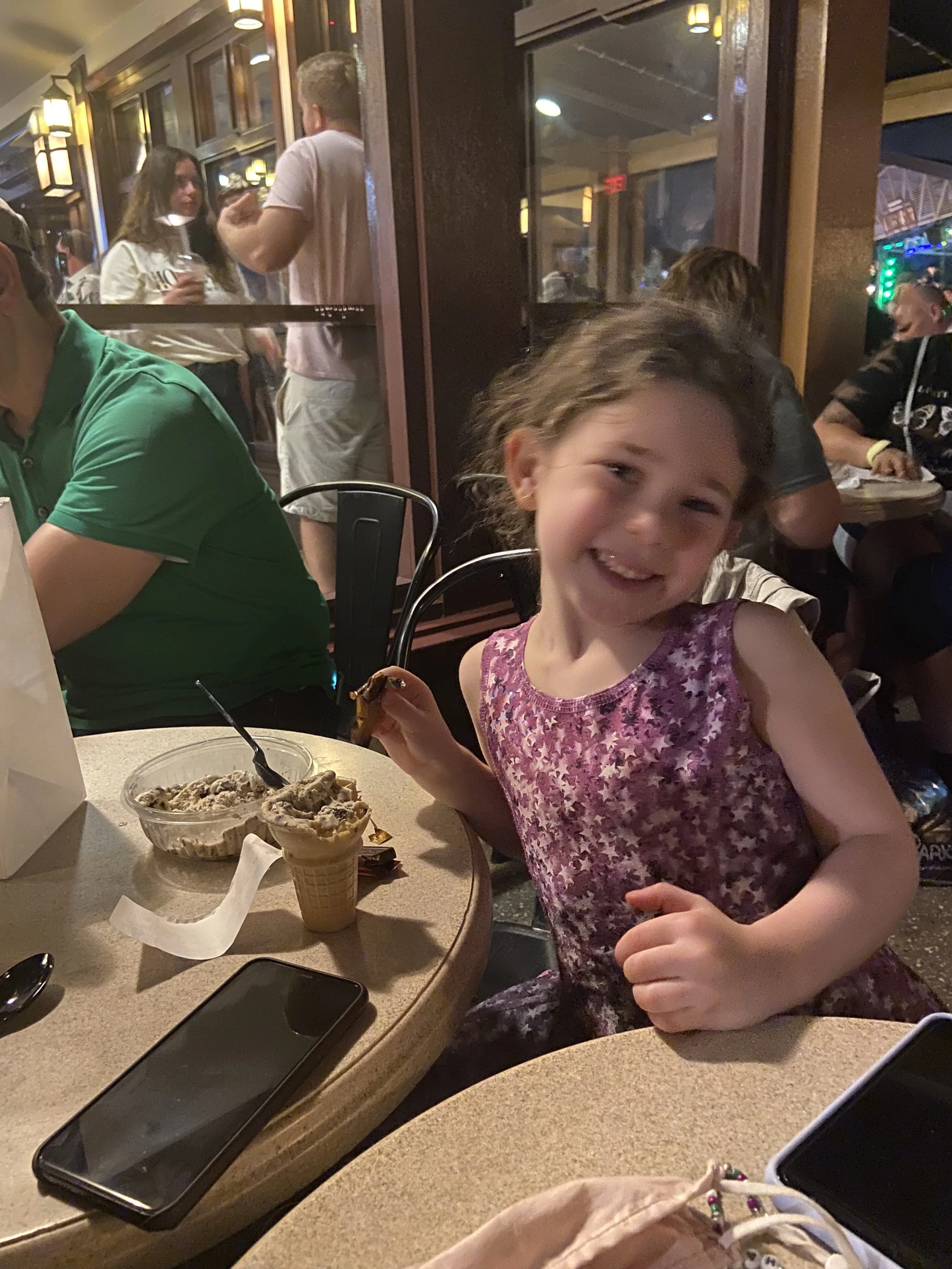 After that we walked around Disney Springs. We stopped by Gideons Bakehouse and got on the virtual queue, which was 2 hours and 40 minutes long (that’s right, 2 hours and 40 minutes to go inside and buy a cookie). The guy I gave my name to was from Valley Stream and he said he would cut the wait to 2 hours because I was from Long Island. Problem was there was no way we were waiting that long. We’ll go back another day. We did, however, go to Ghirardelli for ice cream! Tzvi and I shared a Brownie Sundae. It was delicious. Hallie had cookies and cream in a cone. It was so late, but everyone was in a good mood.