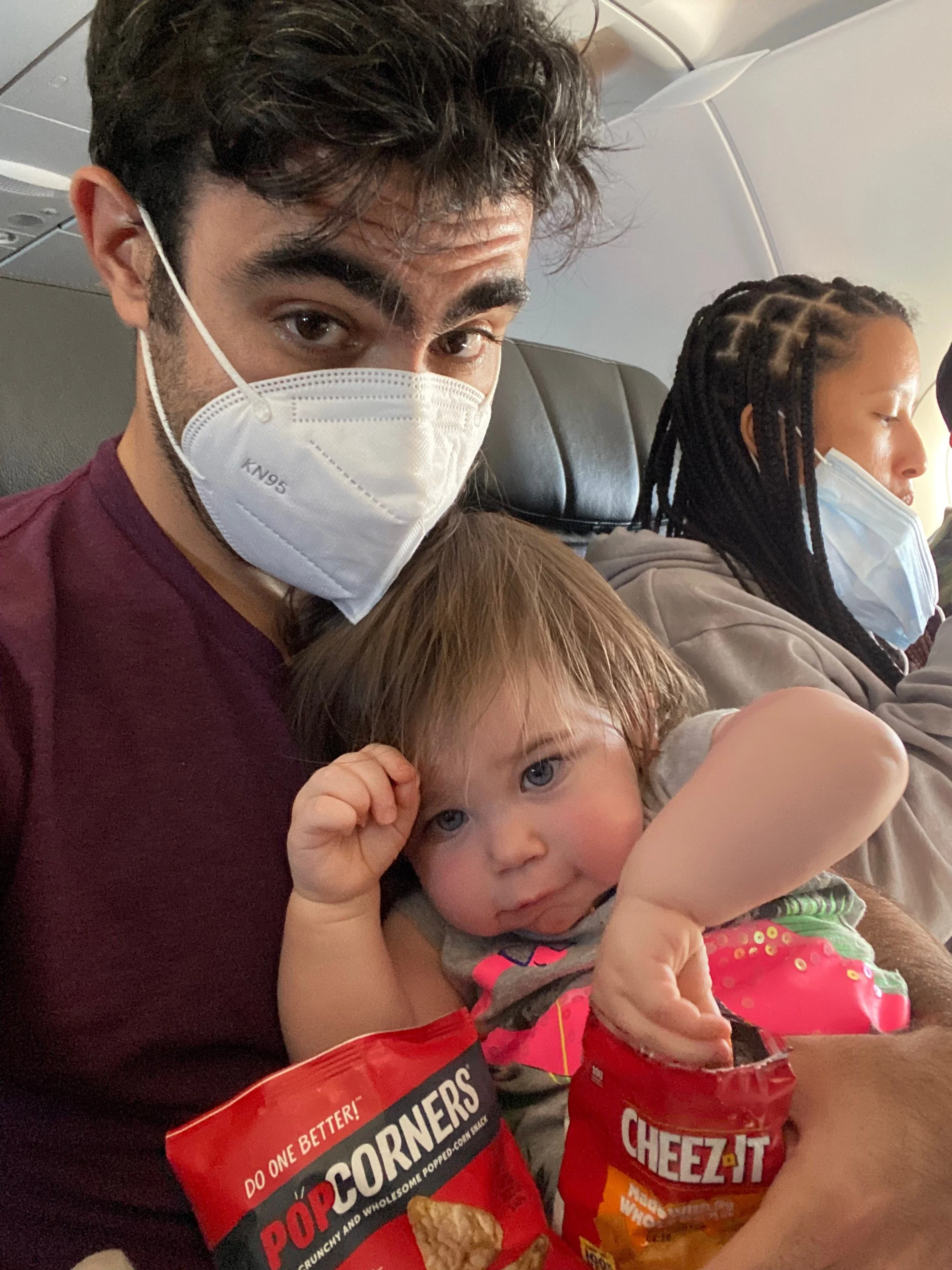 Anyway, Madeleine didn’t chill out the entire flight, which was fun. The TVs weren’t working for the first half, and once they started working she didn’t really want to sit and watch. It was long. At one point Madeleine sat feeding Tzvi Cheeze-Its.