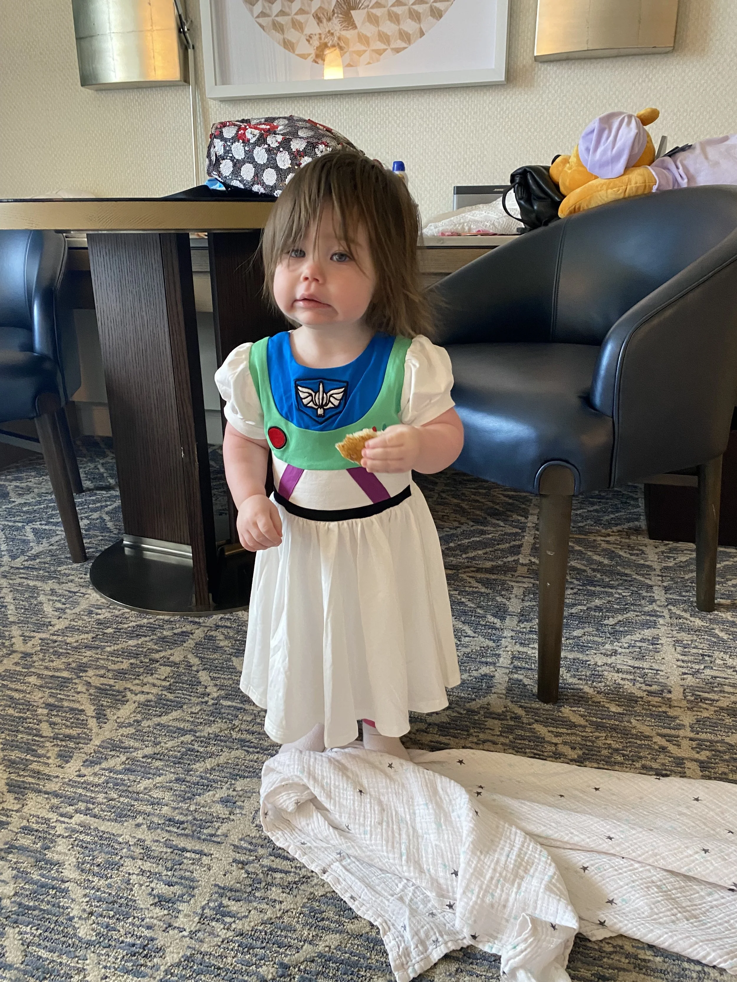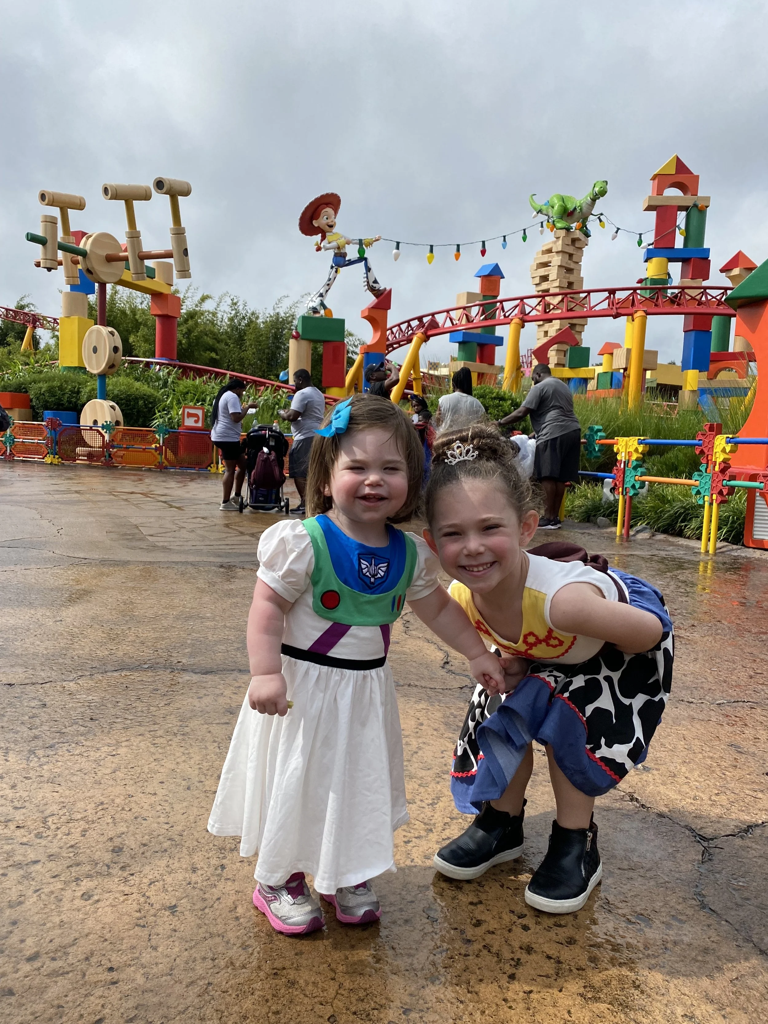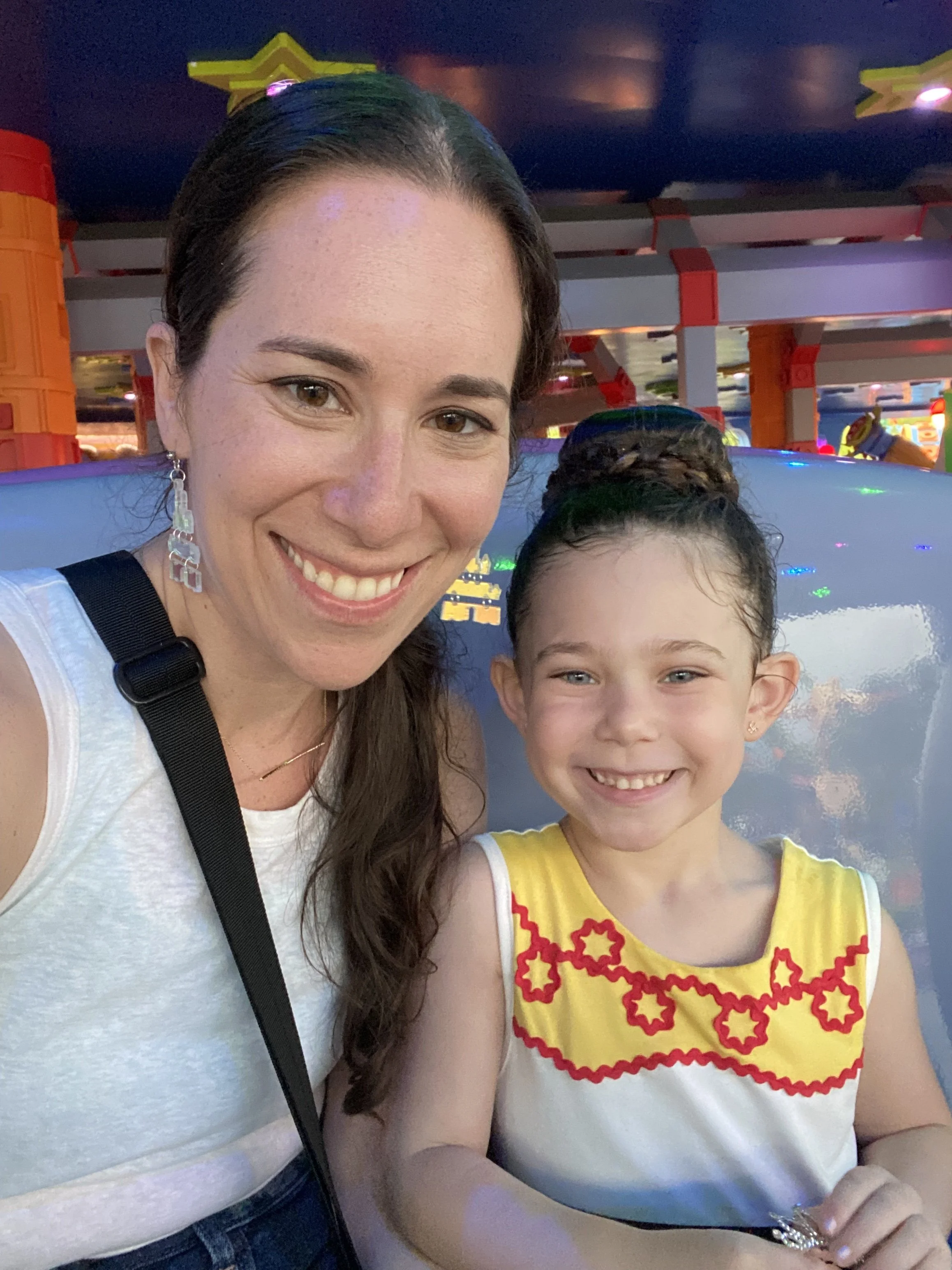 From there we walked to Tower of Terror. Tzvi, Robyn and I rode first. Then we came back and my parents rode. We left them and of course it started to rain. Hallie was also still in a mood. We were just sitting under an umbrella when Hallie came to me and said she needed some “mommy time” without anyone else. She was right. Pretty self-aware. So she and I left everyone else and went to ride Toy Story and then the Alien Saucers in Toy Story Land.