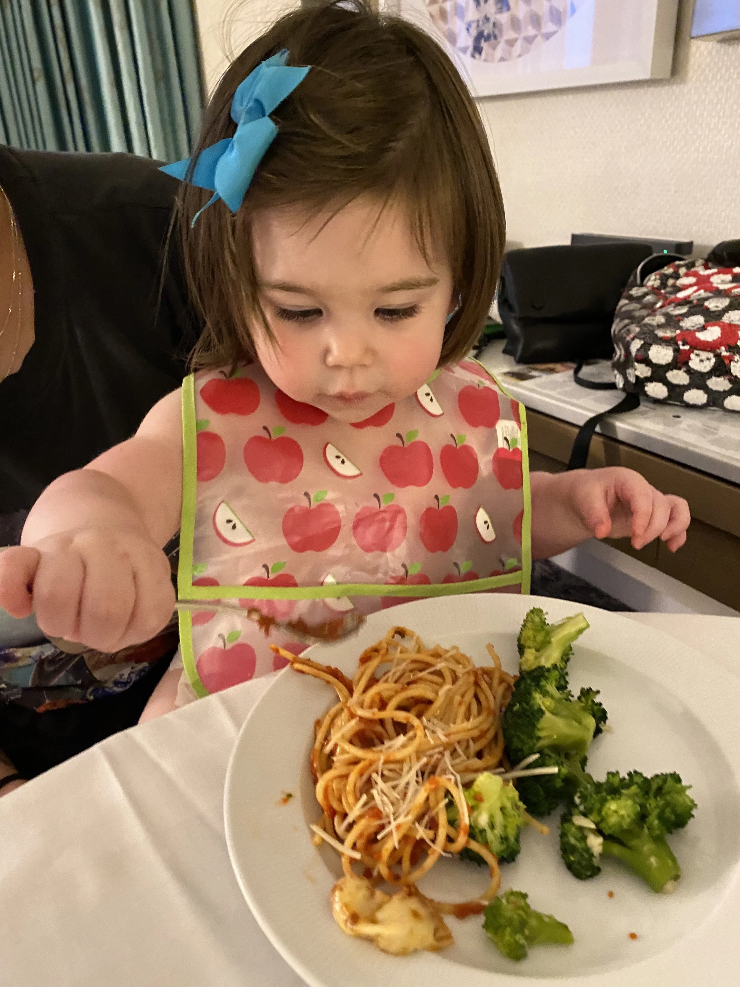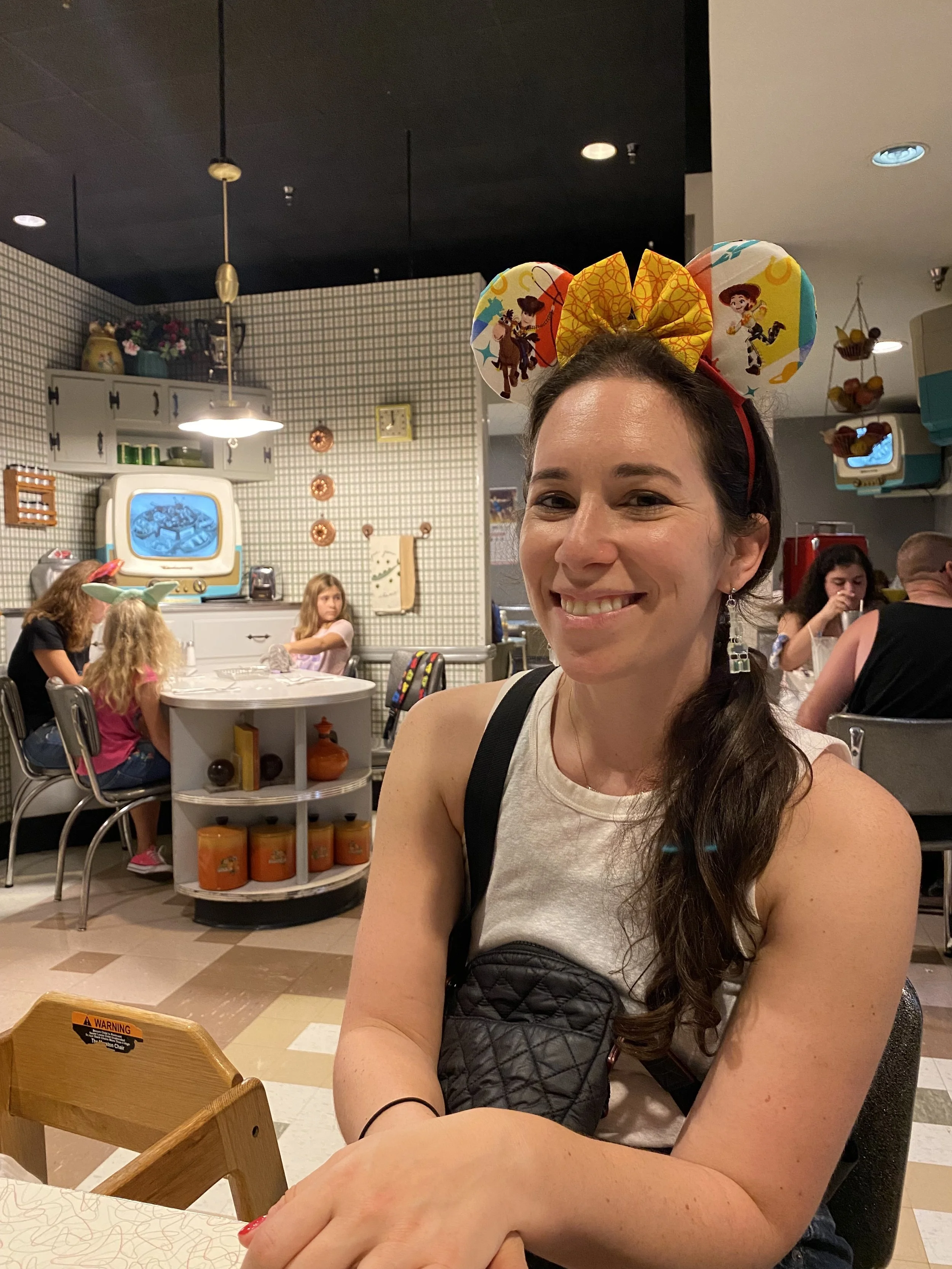 From there we were off to Toy Story Land, which is always great. I knew Madeleine wouldn’t enjoy Midway Mania so I sent everyone else on while she and I walked around, except it started raining again. We were also kind of late for our lunch reservation, so I started walking there with her, except the woman who directed me gave me horrible directions so I had to walk totally out of the way. The rest of the family met me at the restaurant only a few minutes behind.