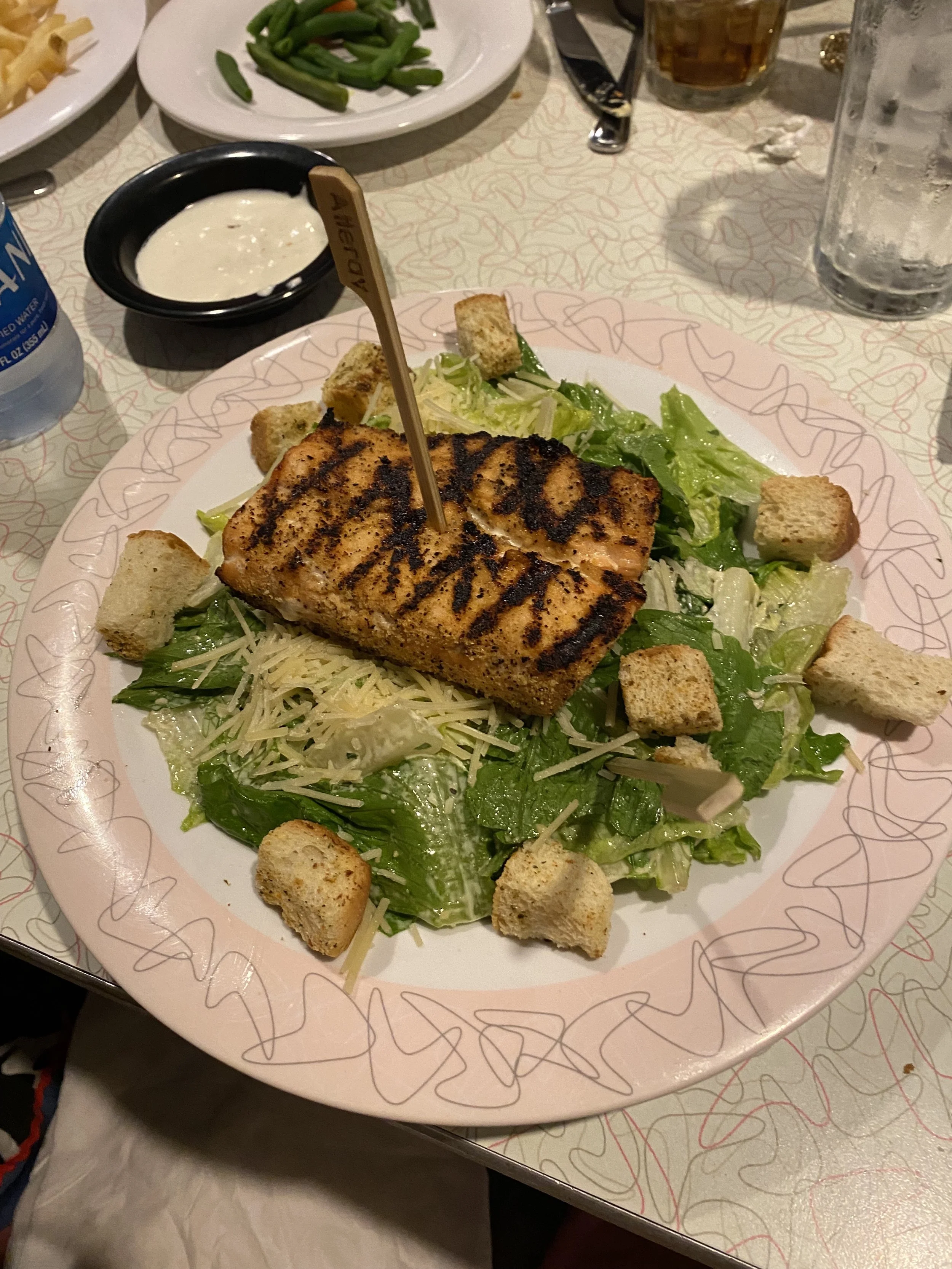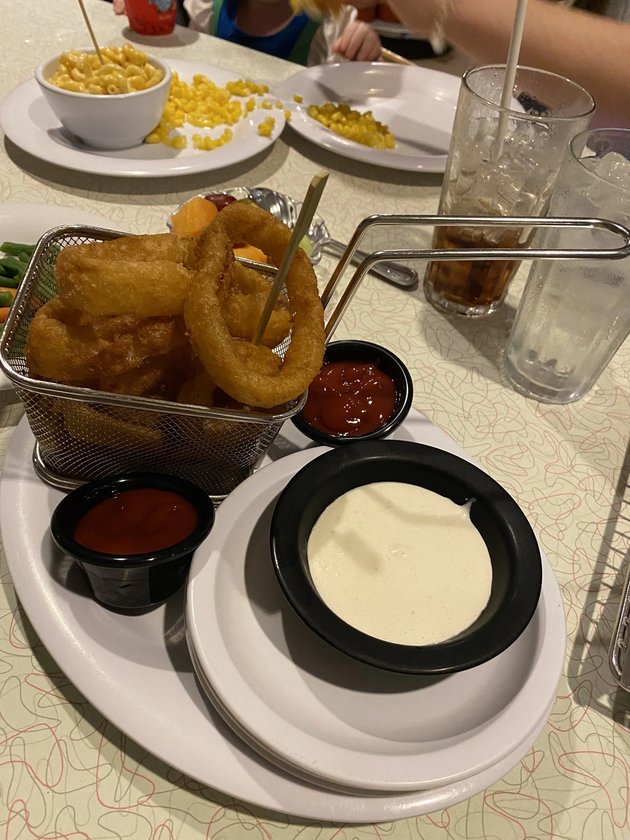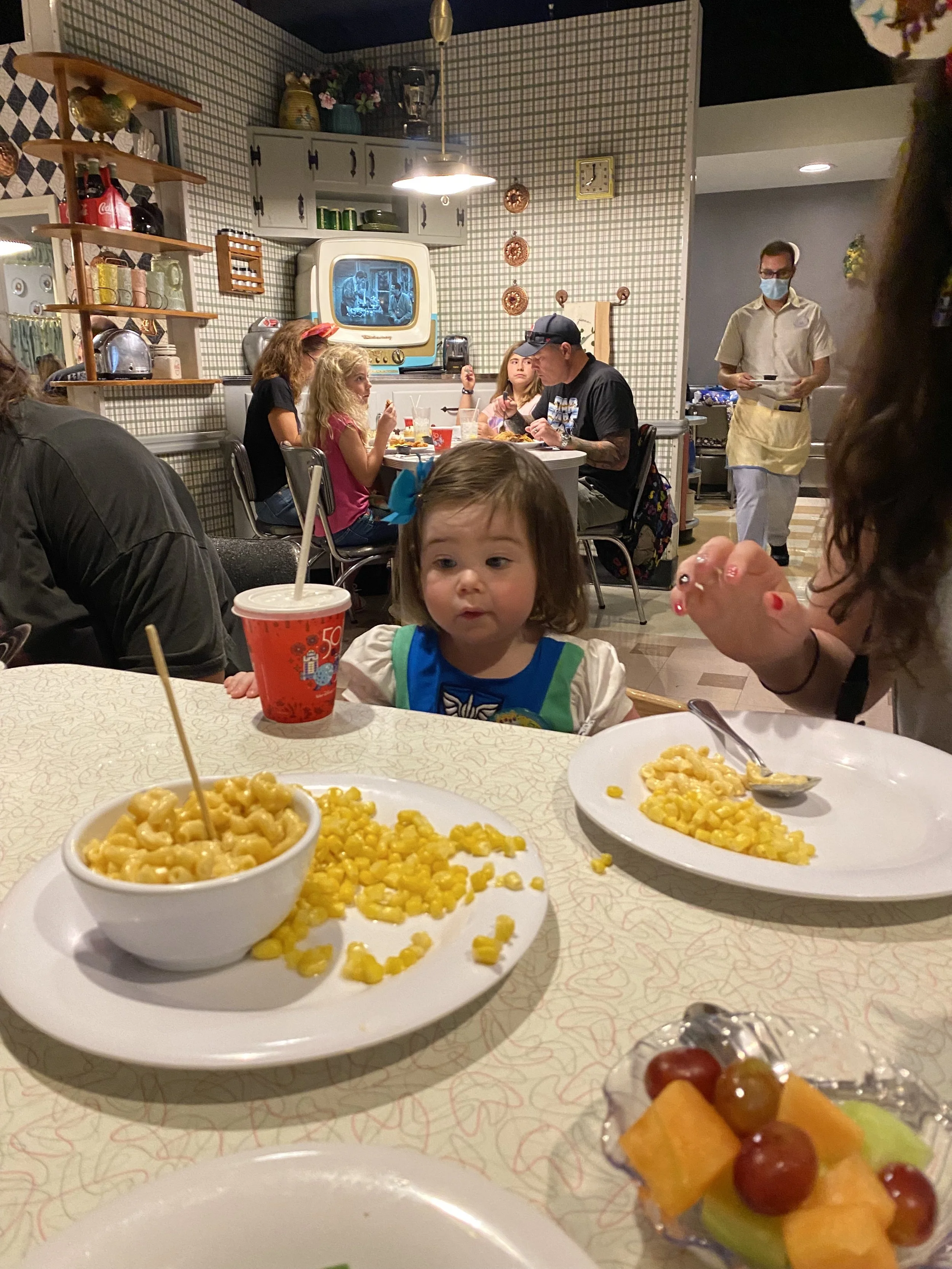 For lunch we ate at the 50s Prime Time Cafe. I think it’s supposed to be like you’re sitting in an old 1950s house and there are TVs everywhere showing 50s shows and the waiters are very in character, by which I mean they’re kind of rude to you. Anyway, I think we were all so hungry and cranky that we couldn’t really appreciate it. We all had Caesar Salad with salmon and we also shared an appetizer of onion rings (there wasn’t much on the menu for us). Madeliene didn’t eat her mac and cheese and Hallie just had French Fries. Balanced meals.