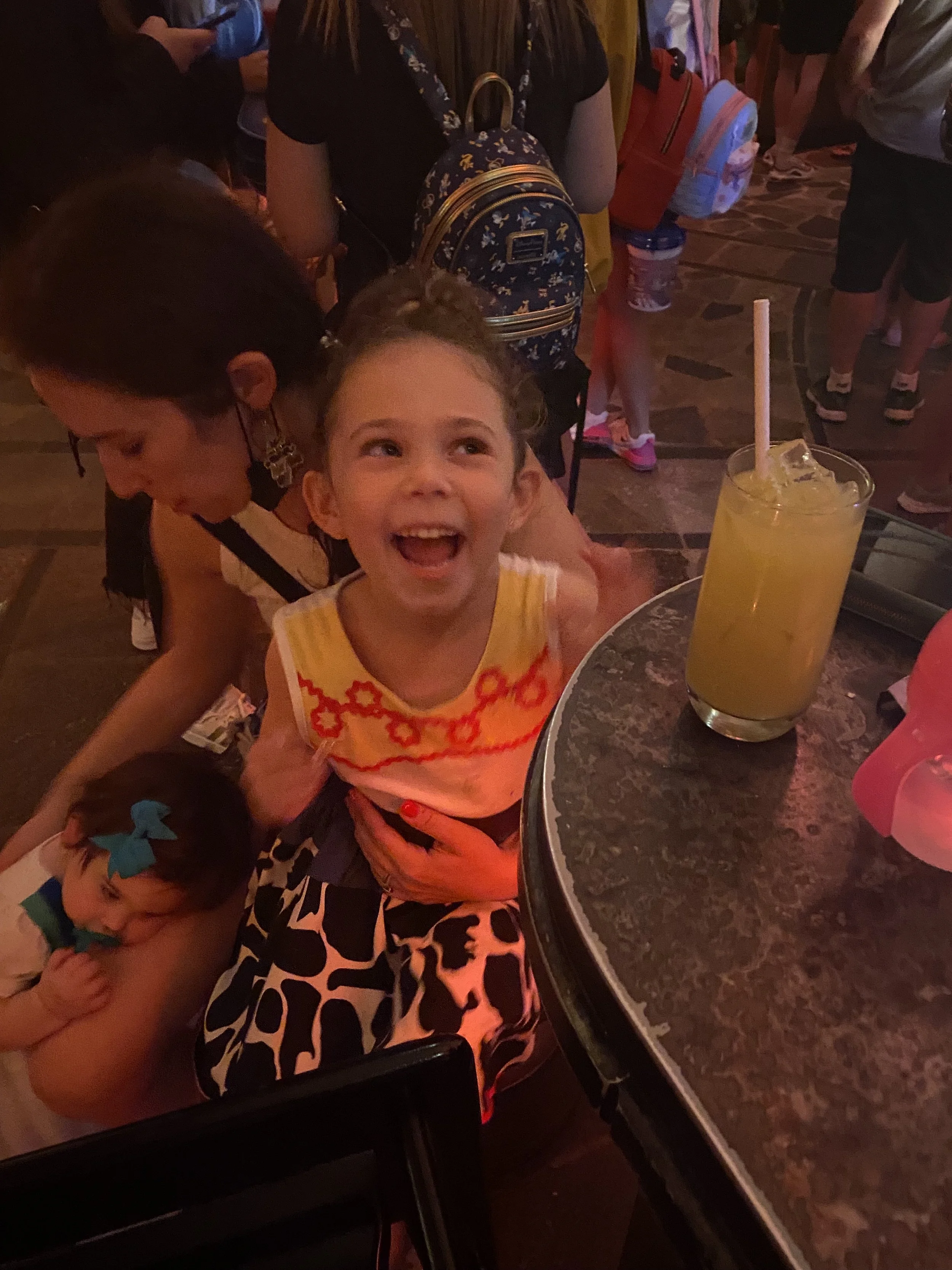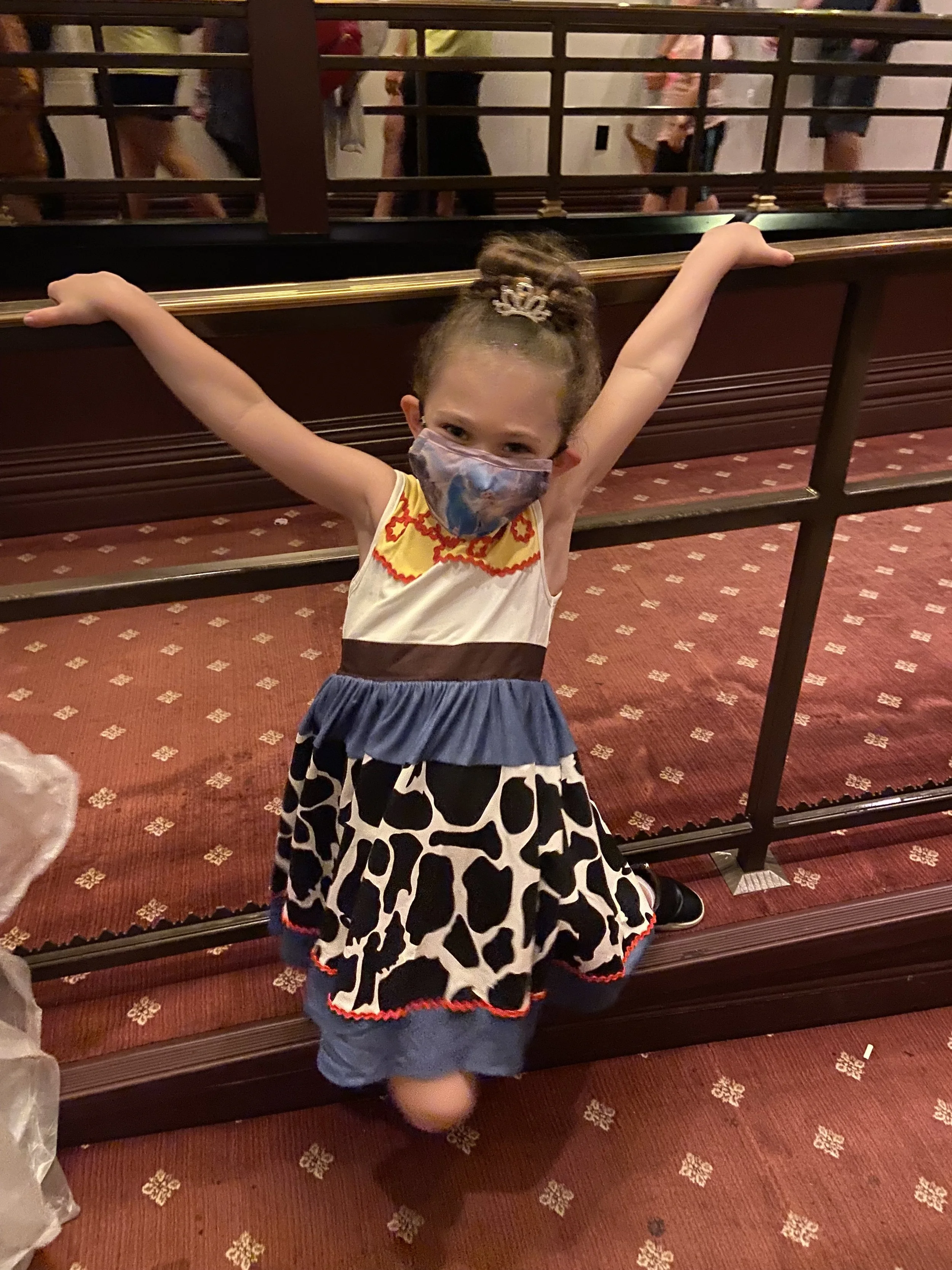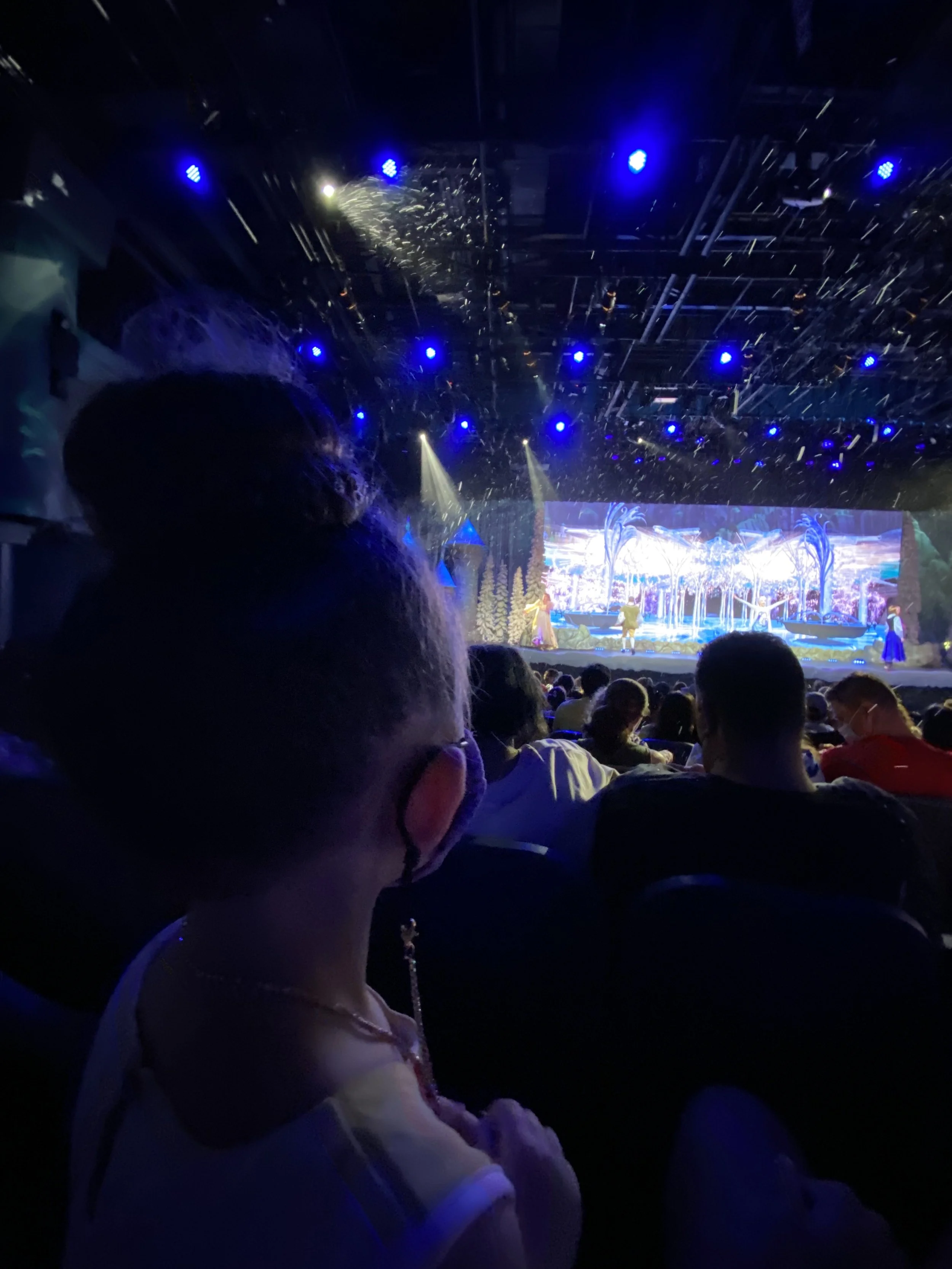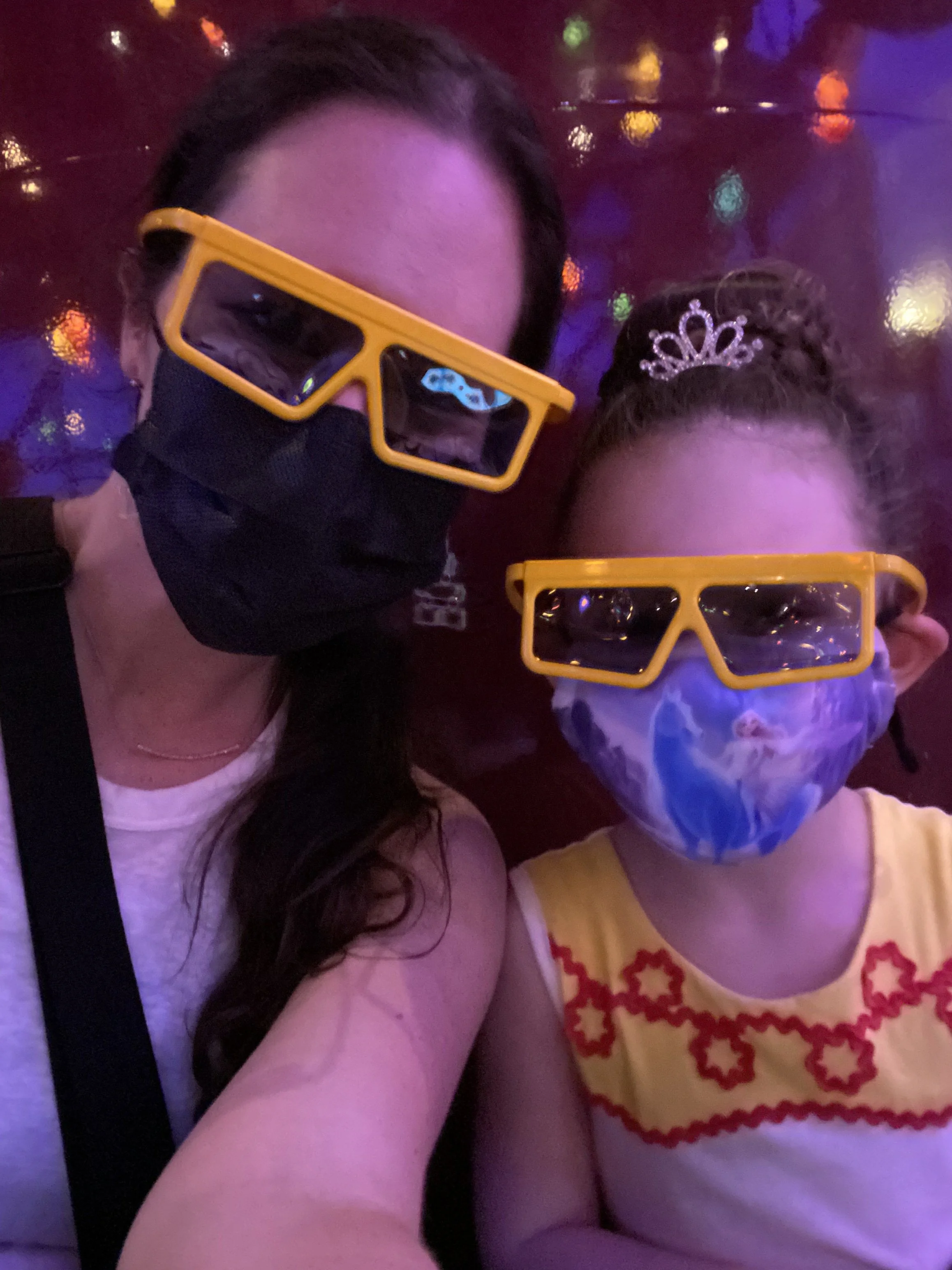 Well, we made it through security just in time for it to start raining! We scanned our tickets and made a dash for the stores. It was a little chaotic and Hallie kept whining that she needed to buy her Elsa doll right this minute. We said no, and headed over to the Frozen singalong. We had to wait for the first show, but at least you’re in a covered area. The show was good, a few updates from last time including multiple reminders to keep your “face coverings” on when singing.