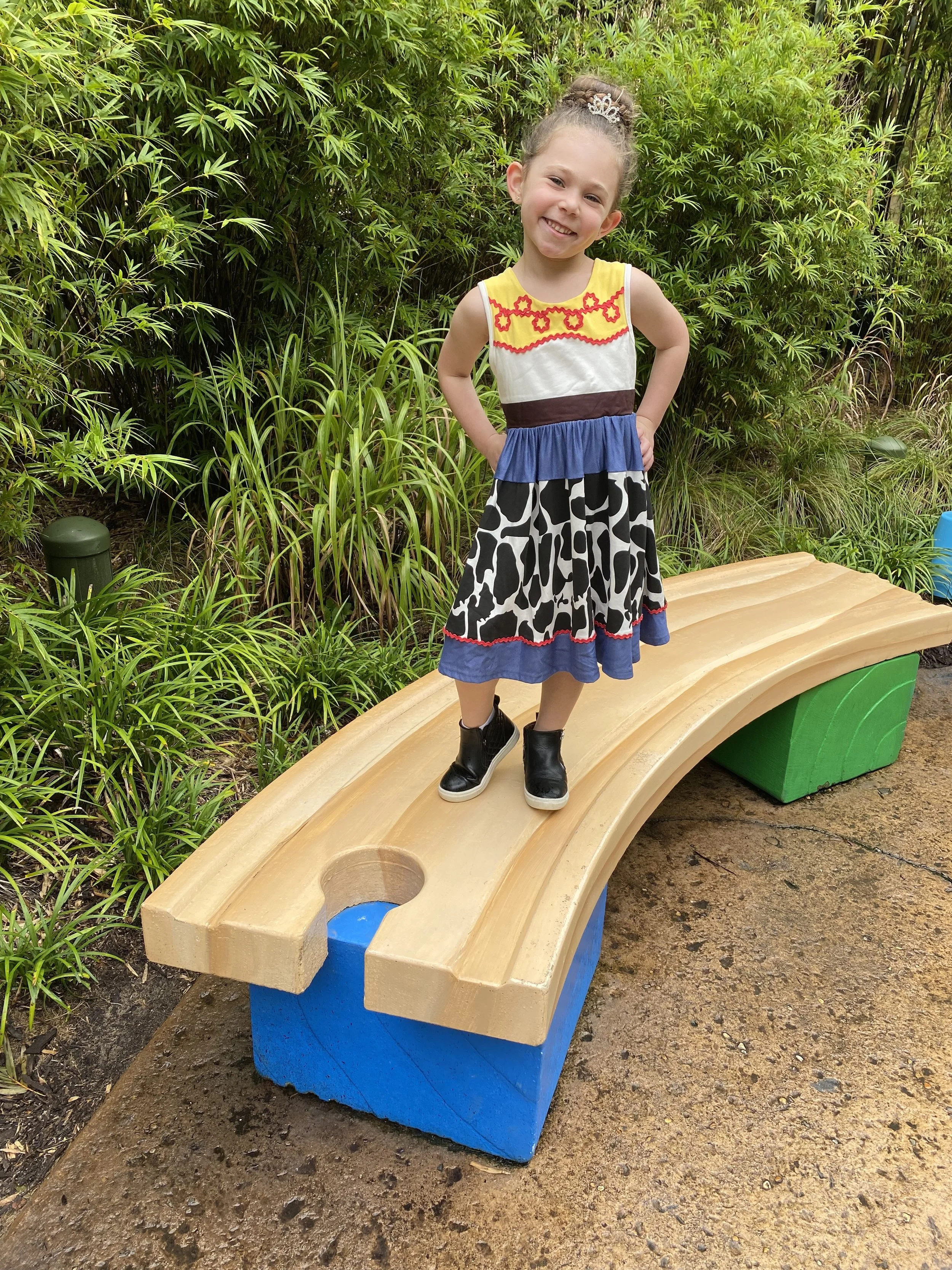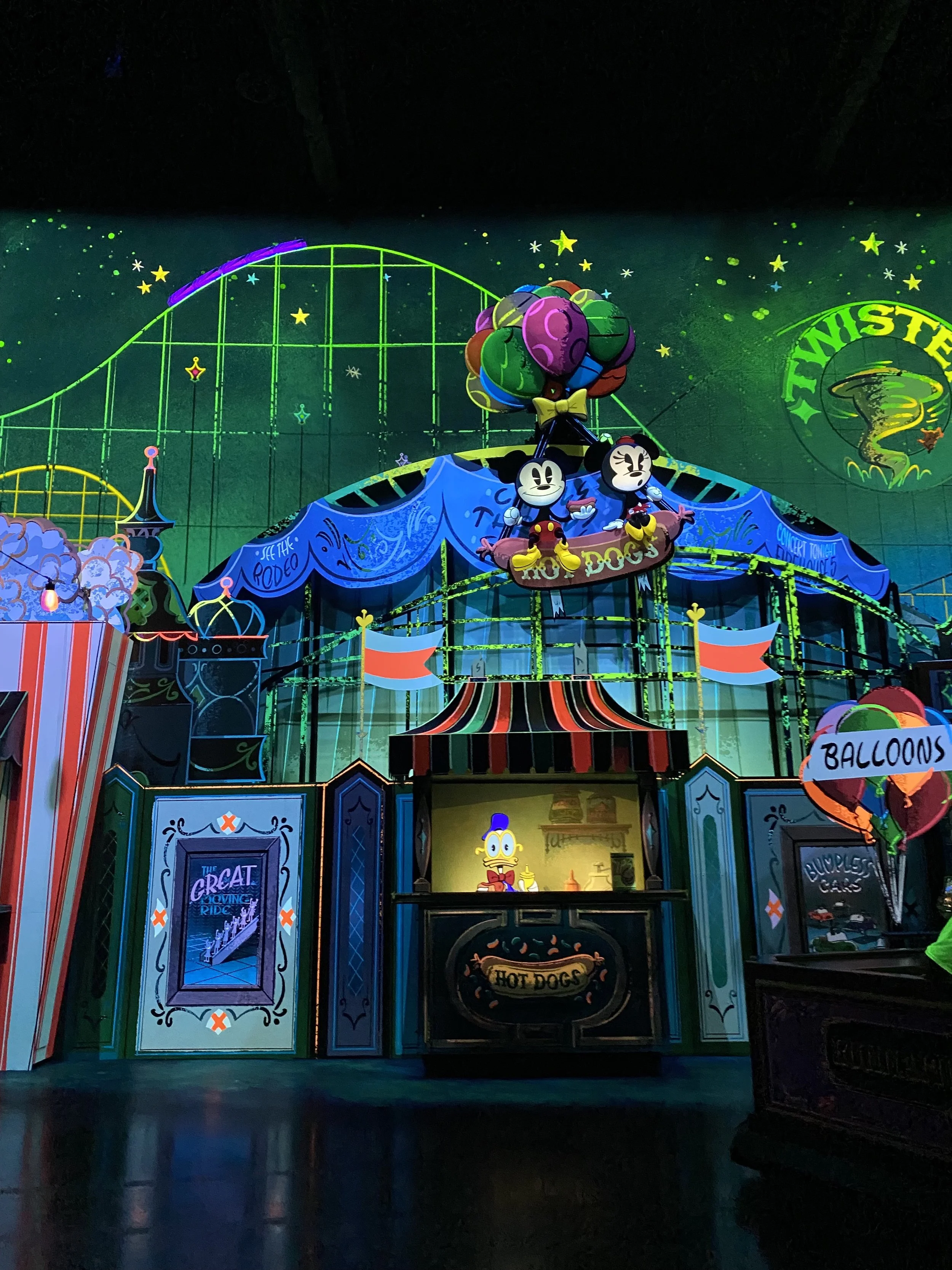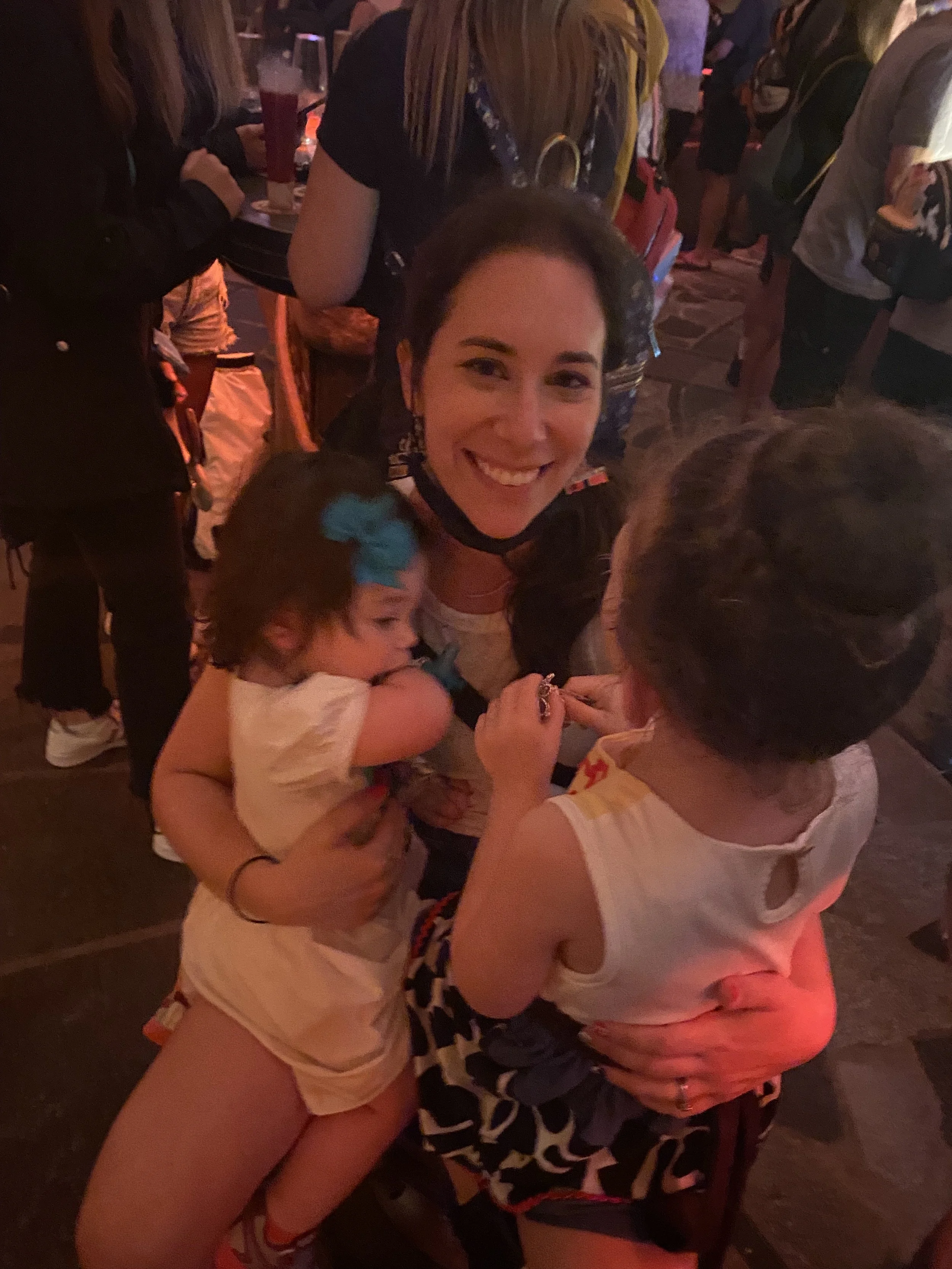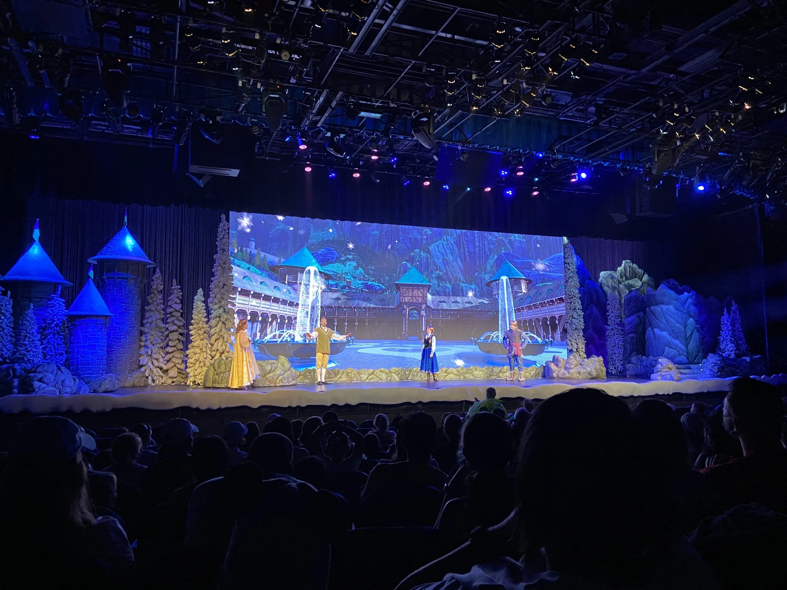 Well, we made it through security just in time for it to start raining! We scanned our tickets and made a dash for the stores. It was a little chaotic and Hallie kept whining that she needed to buy her Elsa doll right this minute. We said no, and headed over to the Frozen singalong. We had to wait for the first show, but at least you’re in a covered area. The show was good, a few updates from last time including multiple reminders to keep your “face coverings” on when singing.