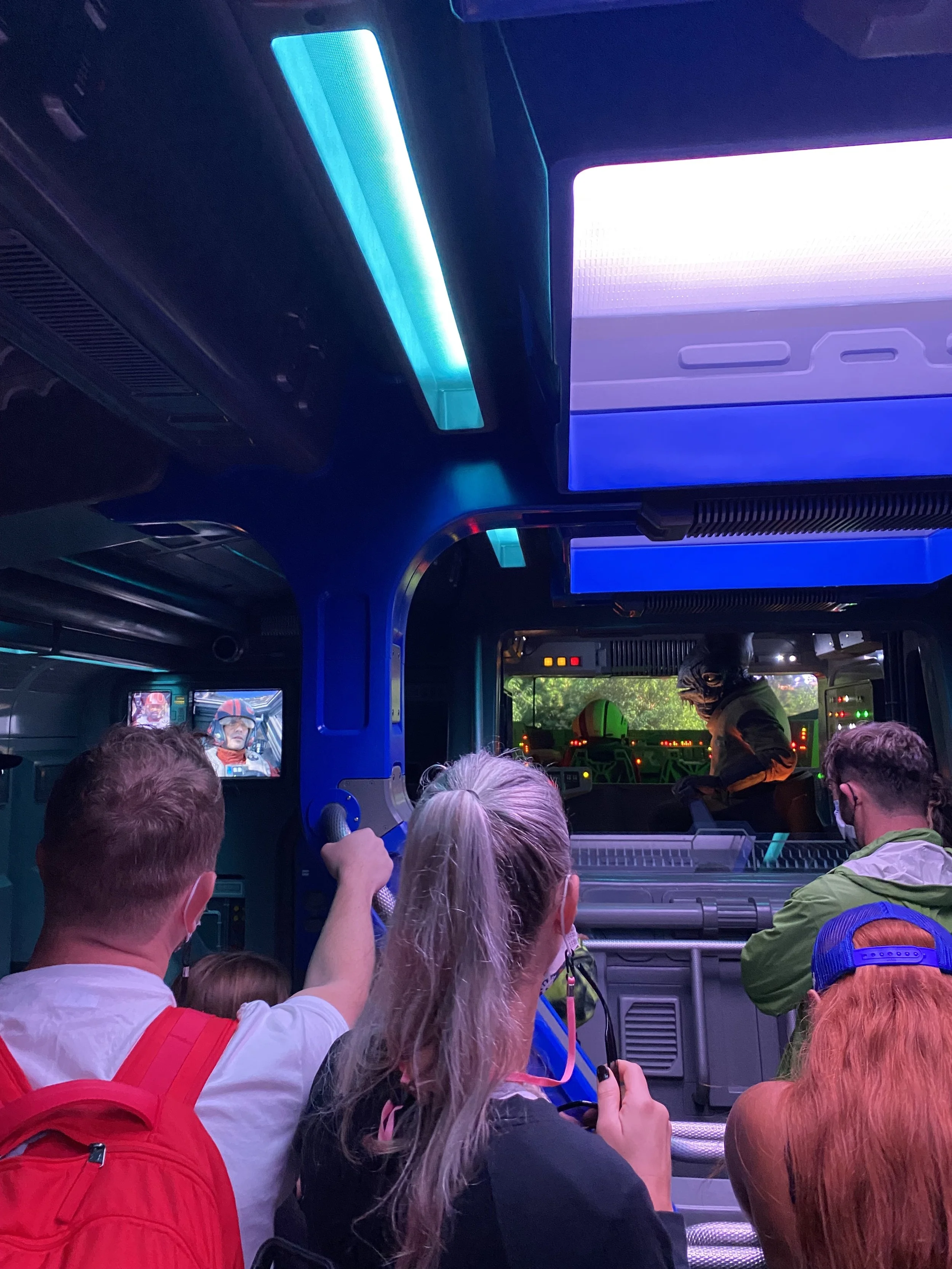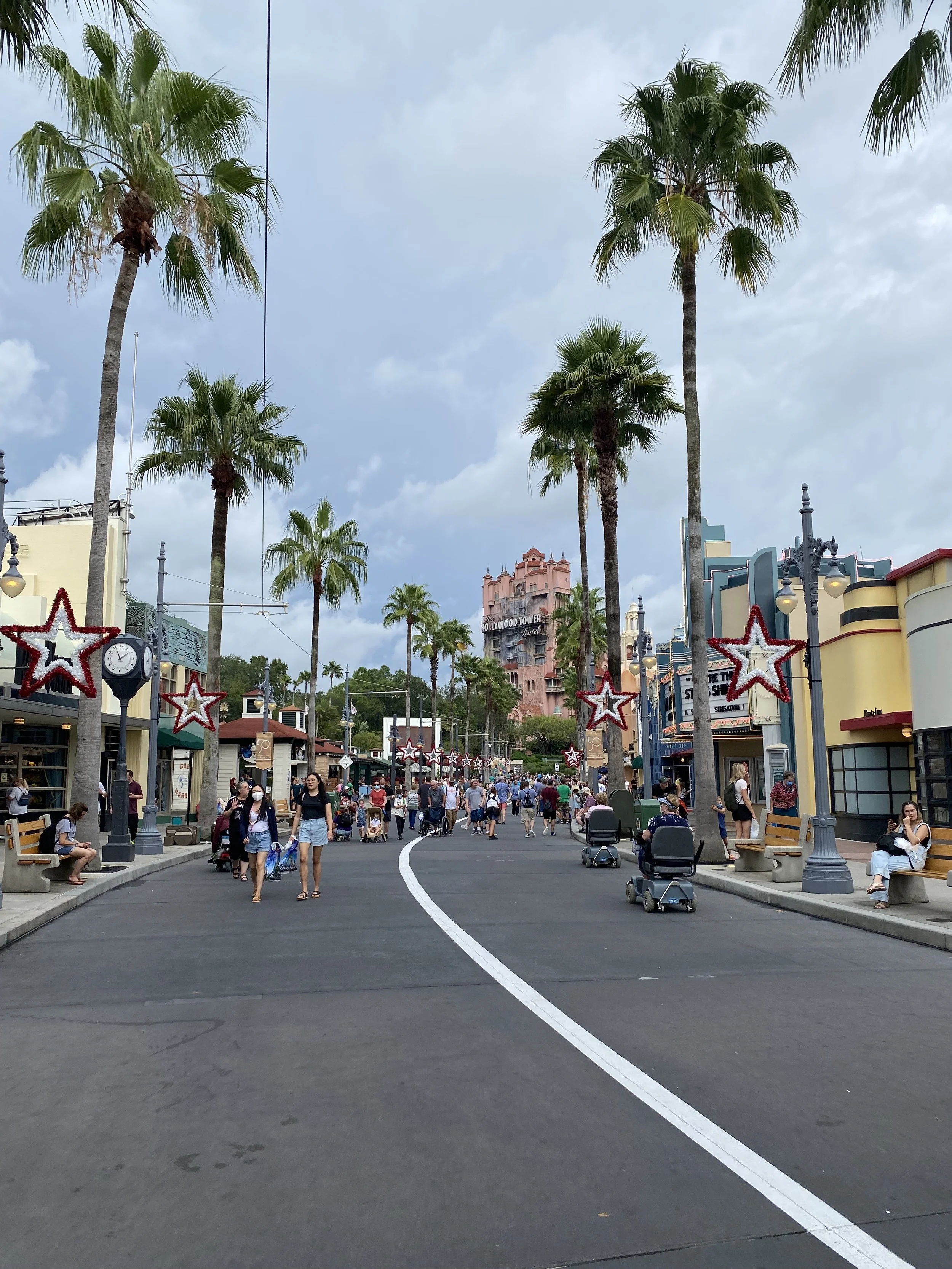 I was up early again to get a lightning lane, so I booked us all for Toy Story around 11:30am. At 9am sharp I booked Rise of the Resistance and even then the earliest time I could get was 3:45pm. Crazy. After another room service breakfast we headed out. The uber drop off is pretty far away, so it was a walk to get into the main entrance. As we walked in we passed the skyliner, which is a fairly new transportation system that takes you between Hollywood studios and Epcot and a few of the resorts. We’ve never ridden them and they don’t have air conditioning.