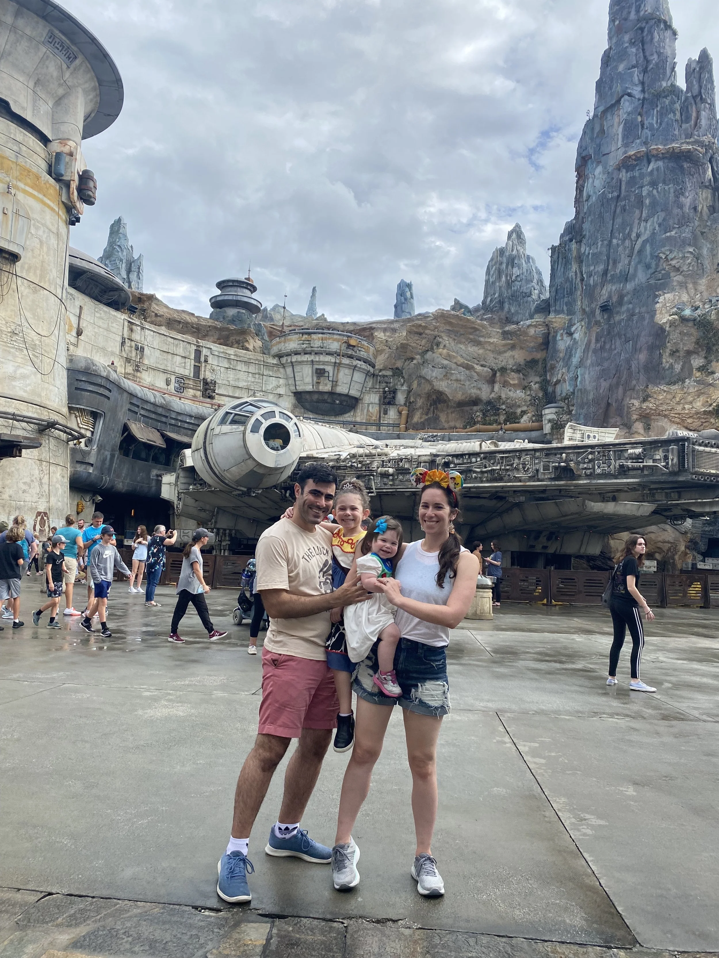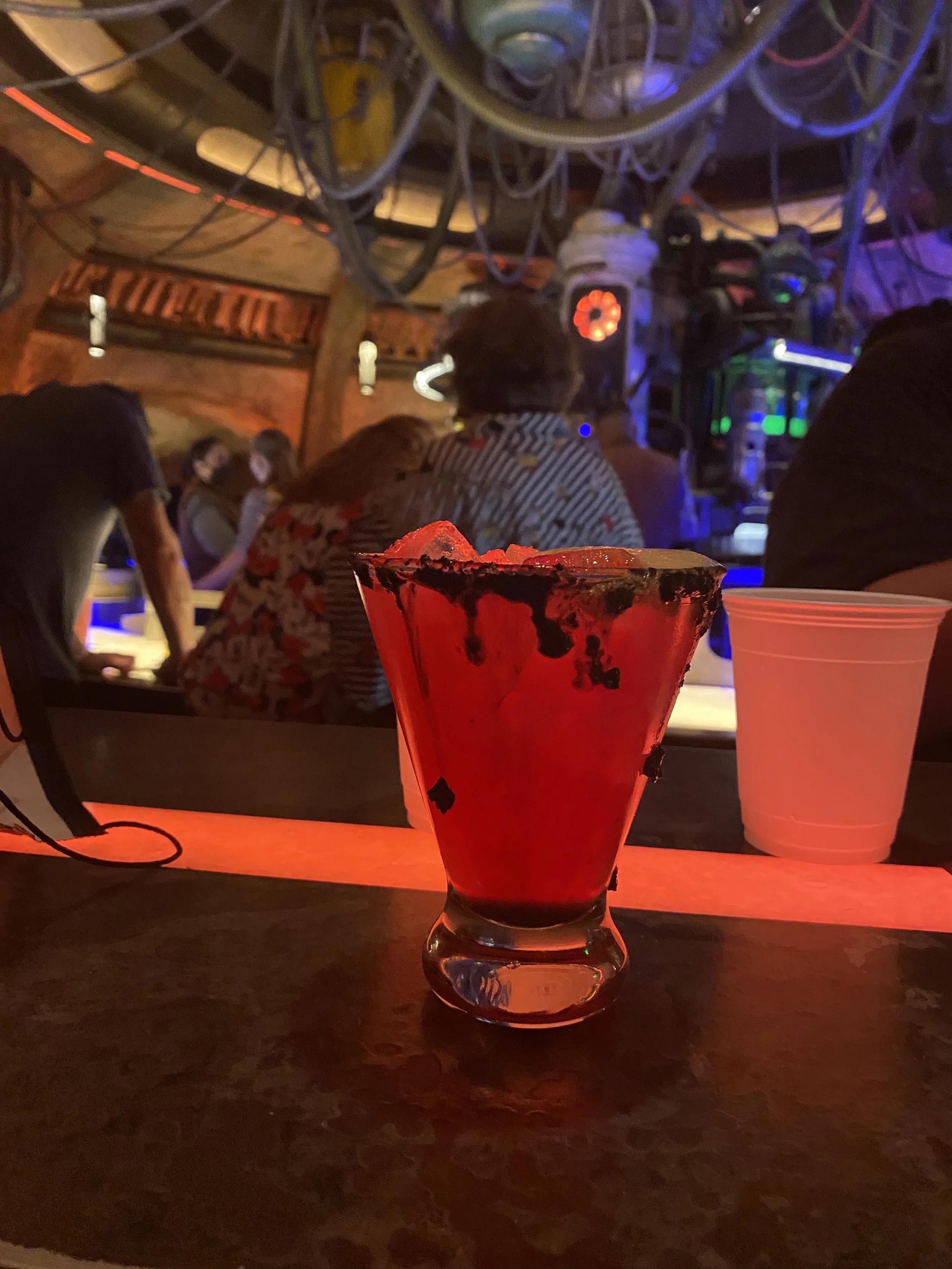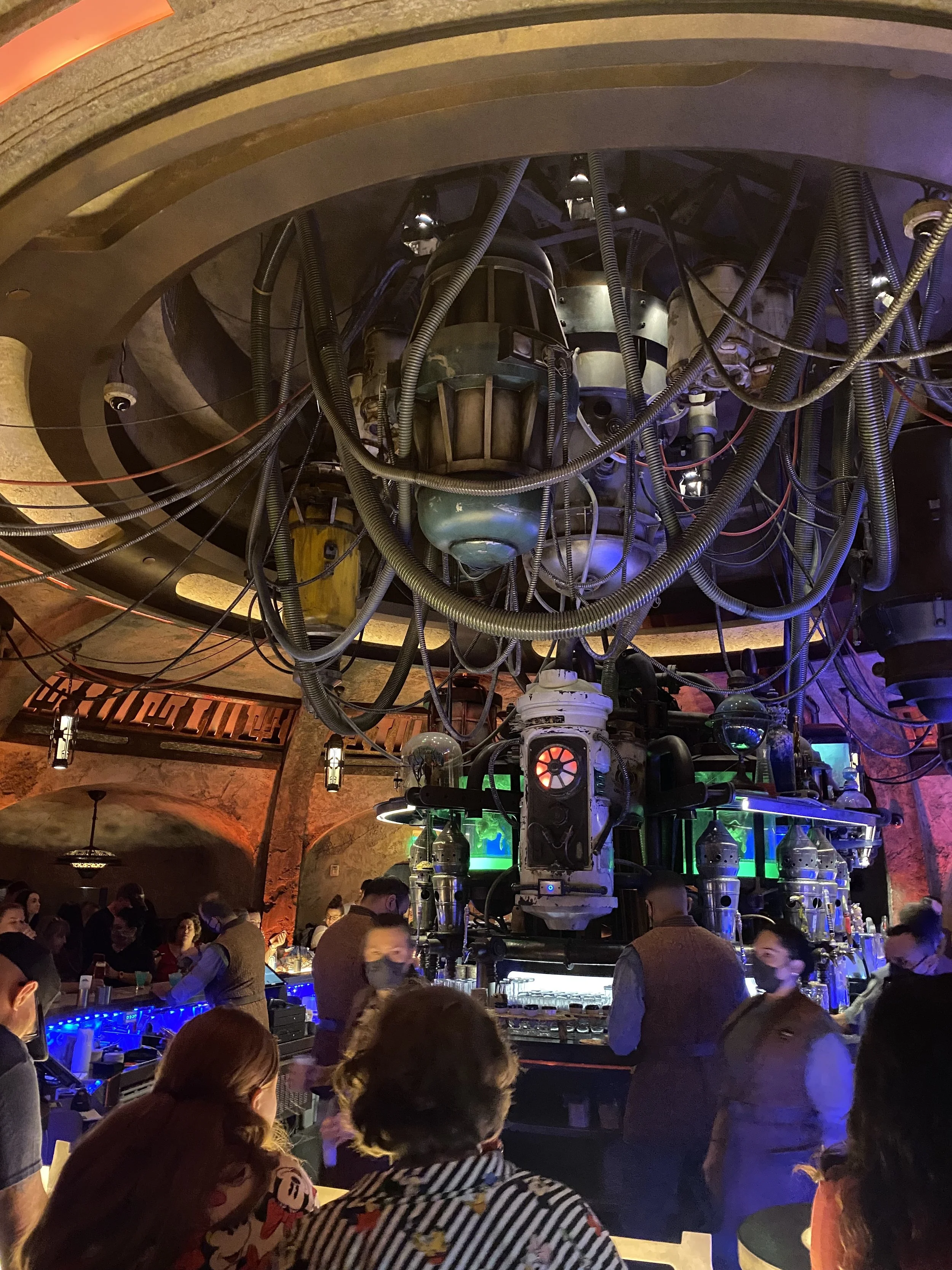 Tzvi and my parents and Madeleine went out to Galaxy’s Edge (Star Wars land). They were 45 minutes late for our reservation at Oga’s Cantina, the new bar that’s supposed to be like the bar in the Star Wars movies. They said they would need to wait a little because they were late, but the wait ended up being 45 minutes and by the time the table was ready Hallie and I were there to meet them. Well, the wait was not worth it. The bar is cool, but not 45 minutes wait cool. We had thought it would be really big and there would be multiple rooms to explore, but it was just one big room and we got a high-top without any stools, so we just had to stand there. The drinks were okay. Hallie had a good juice.