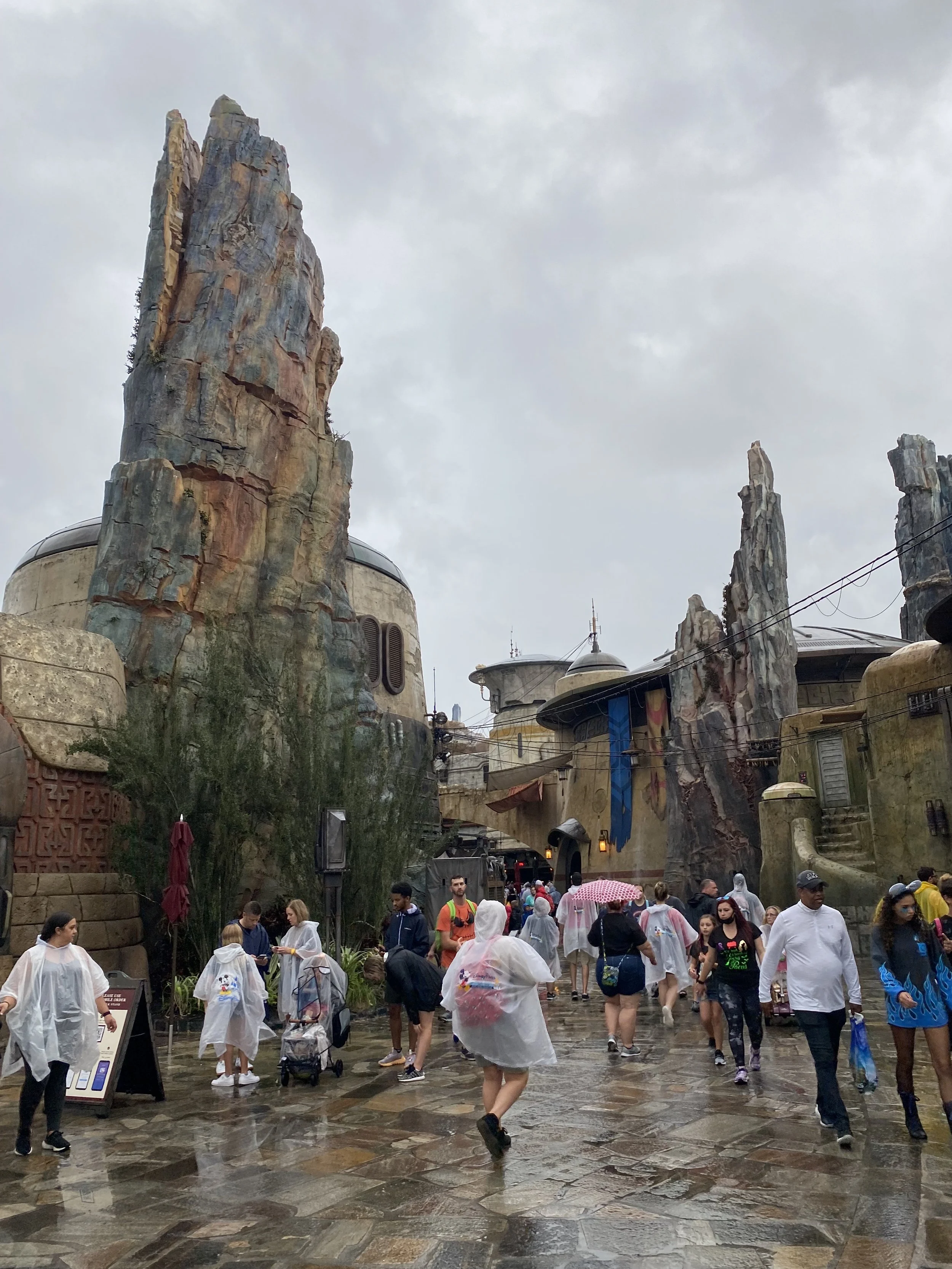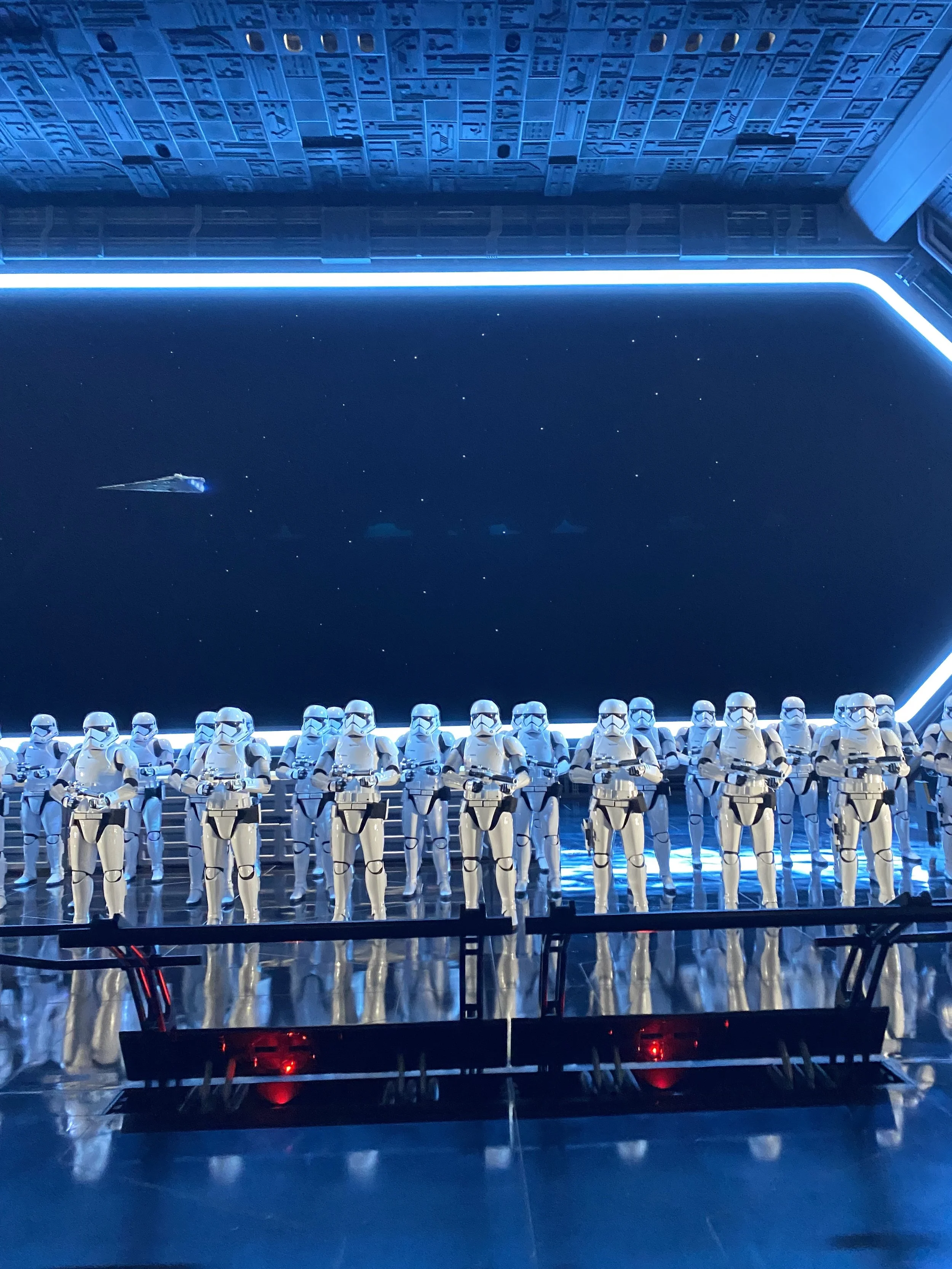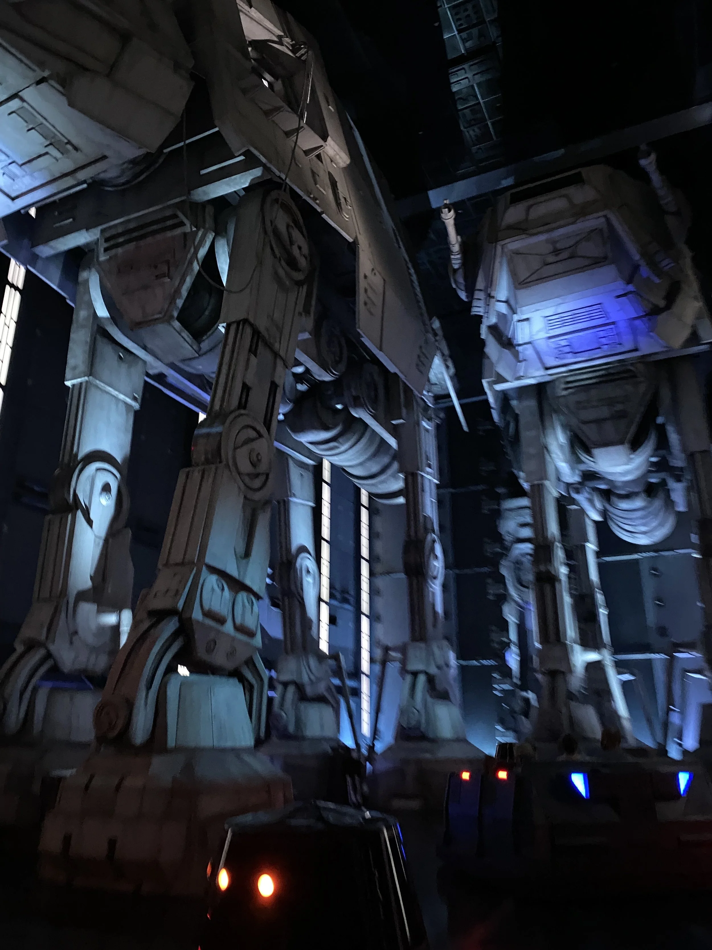 After that we went on Rise of the Resistance, the new Star Wars ride. I think that was probably the best ride of the whole trip. [Spoiler alert: If you don’t want the ride ruined for you and want to be surprised by it, skip the rest of this paragraph]. First, you go through an indoor part then are led back outside, where you’re loaded into a transport ship that’s supposed to be taking you to the rebel base (or something like that), except of course you get captured and stuck in a tractor beam. At first we were confused, because the ship is actually moving, but you’re not strapped in or anything – you’re just standing there. When the doors to the ship open, you find that you’re inside the hangar of an enemy First Order ship filled with stormtroopers (I guess the transport ship is an elevator?). From there you’re led into the next room, where you line up for the next part of the ride, but the cast members are totally in character and do a really great job. One came up to me and asked what was on my head (my Minnie Mouse ears). I said “ears.” She said “what kind of species has two sets of ears?” I said, “a Stephanie species.” She walked away and said “there is no such speices.” From there you’re led to a prison cell where the wall is then cut open and cast members who are rebel troops free you. Then the ride actually starts and you go through a whole trackless dark ride. I’d say it was the most immersive ride I’ve ever been on and was awesome.
