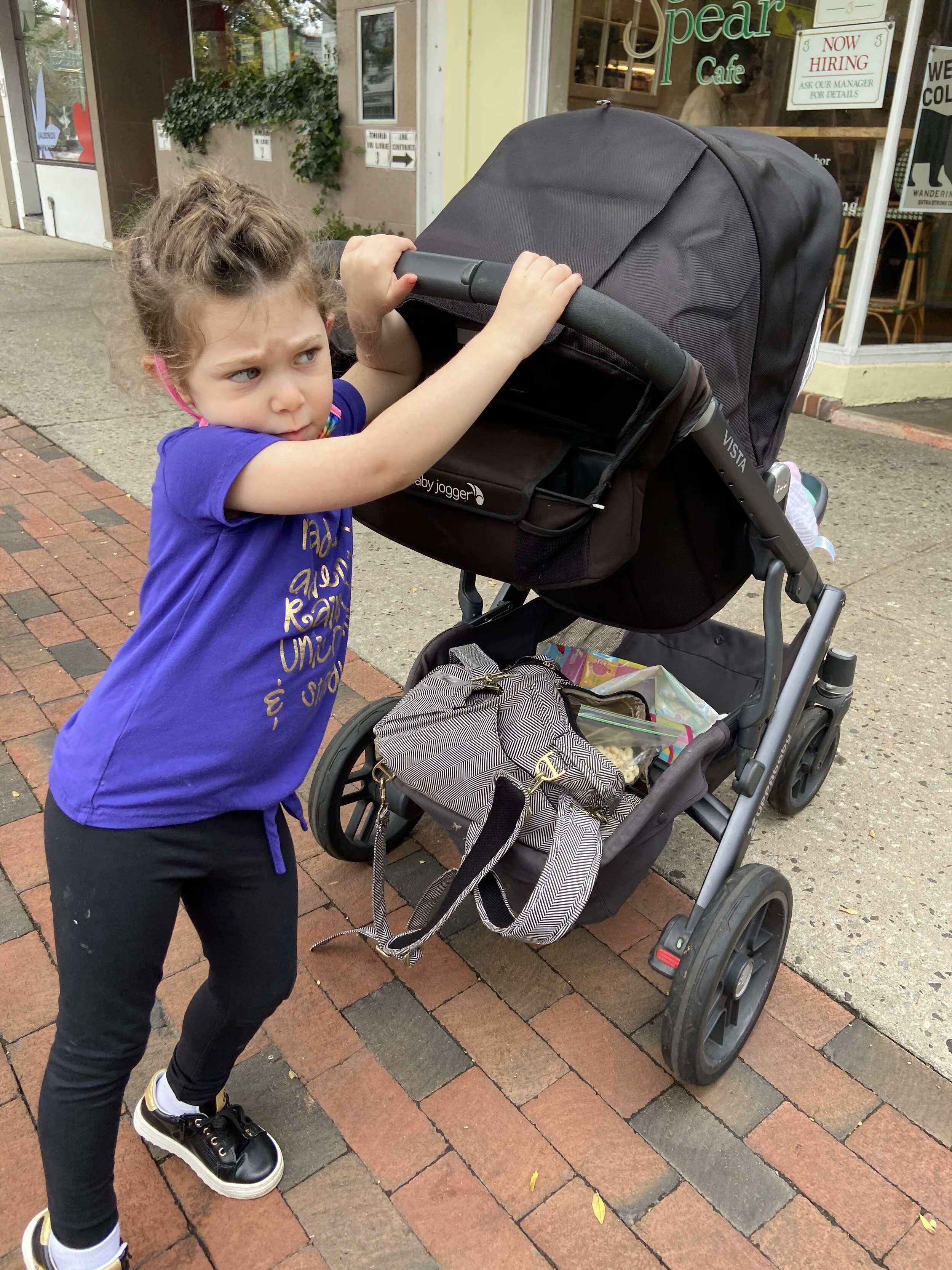 Before getting back on the highway we made a quick stop at a chain bagel store called Goldberg’s Bagels (which may as well have just been called “Jews Eat Bagels”) and got tuna bagels. Then we were back on the road. There was a bit of traffic, but Madeleine slept for a lot of it and Hallie watched Sesame Street on the iPad.