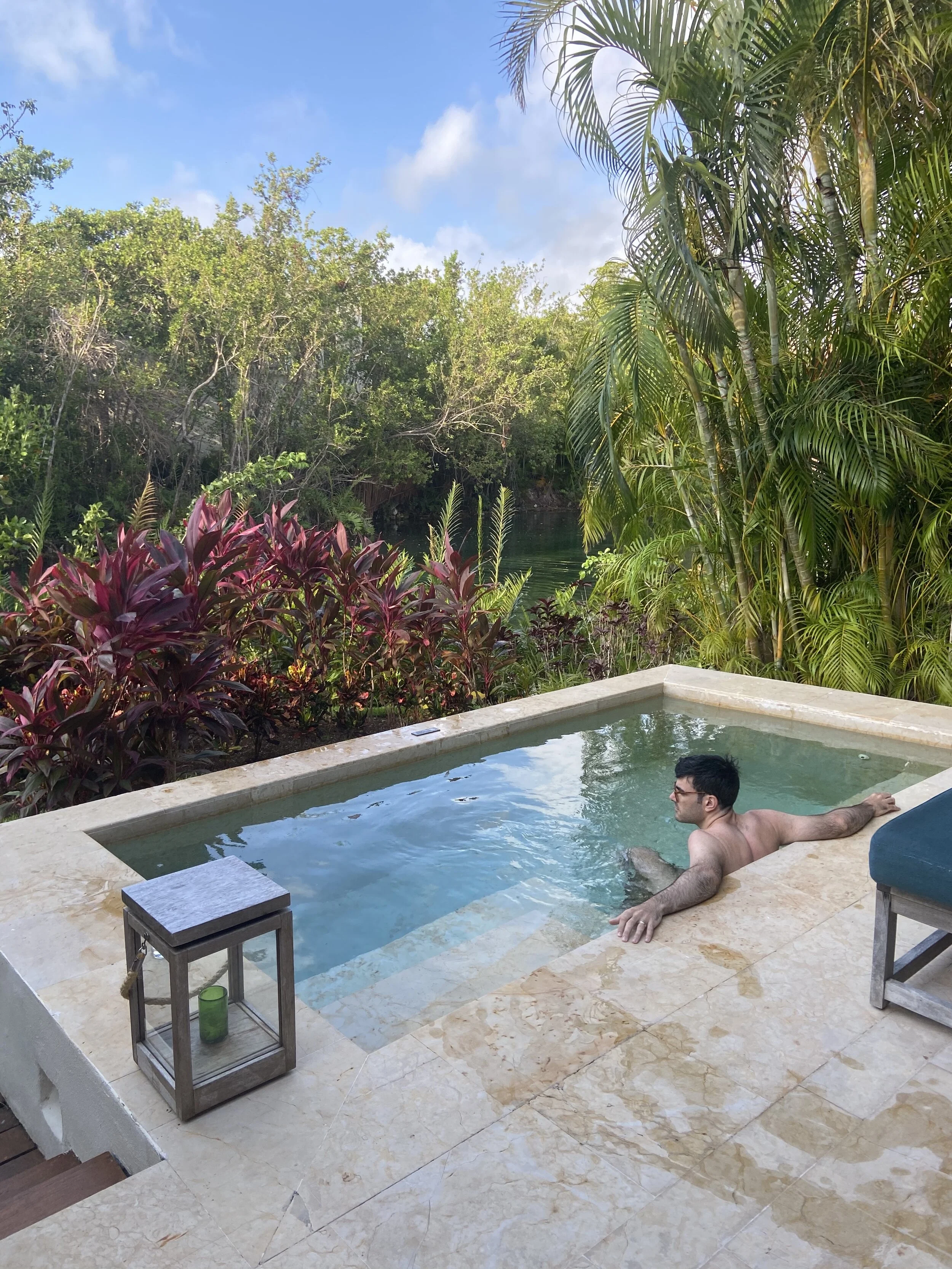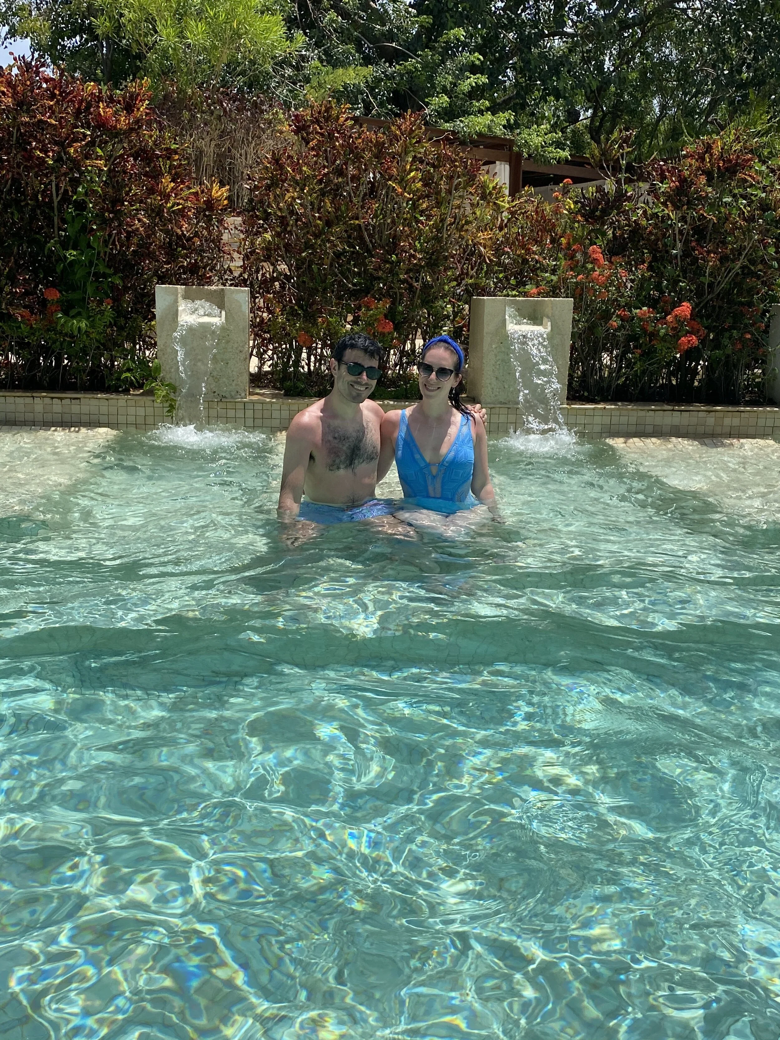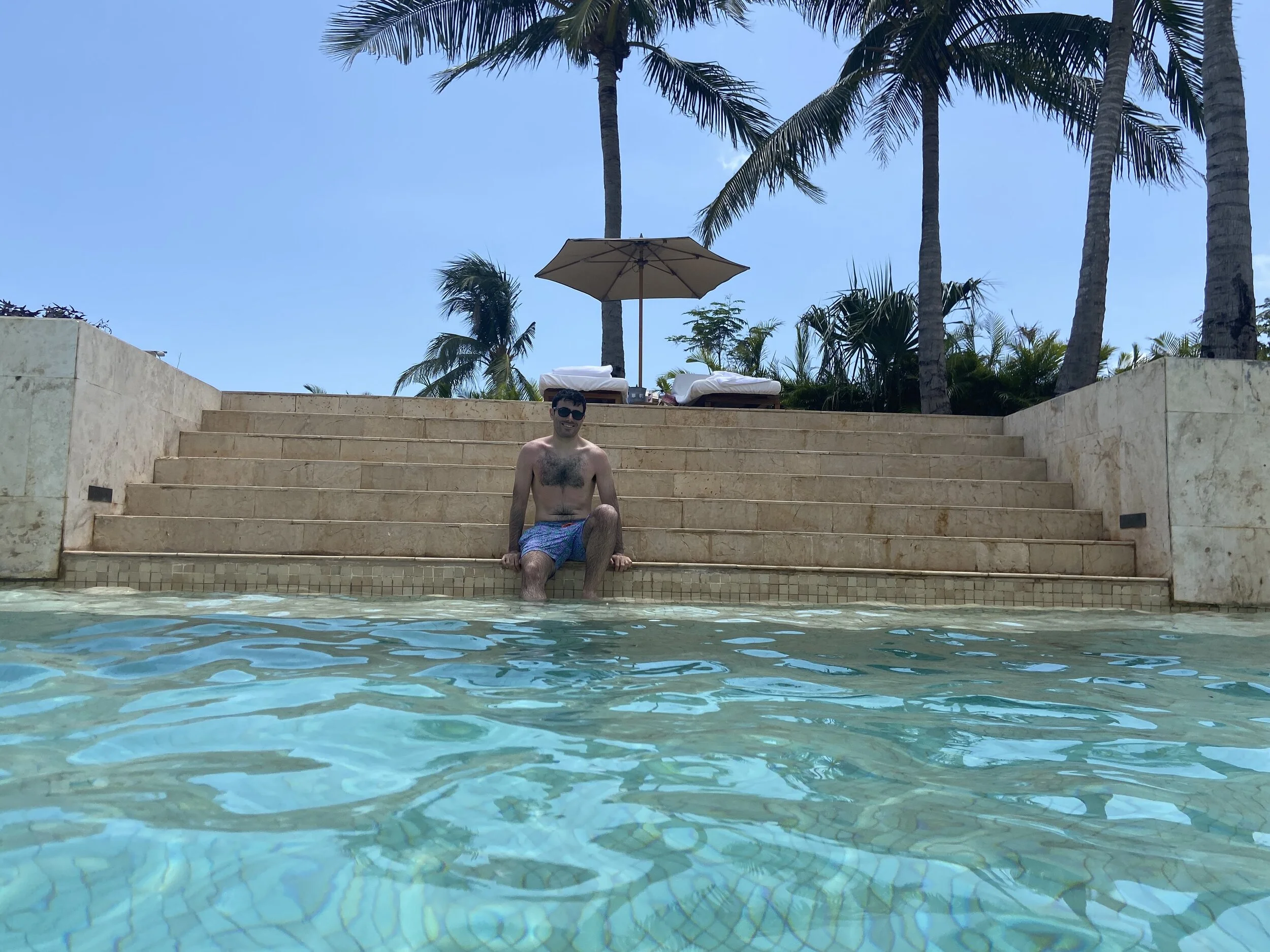 We woke up same time today. Early. Ready for our last full day. Before getting dressed we went for a pre-breakfast dip in our plunge pool. The water was kind of cold, but Tzvi enjoyed.