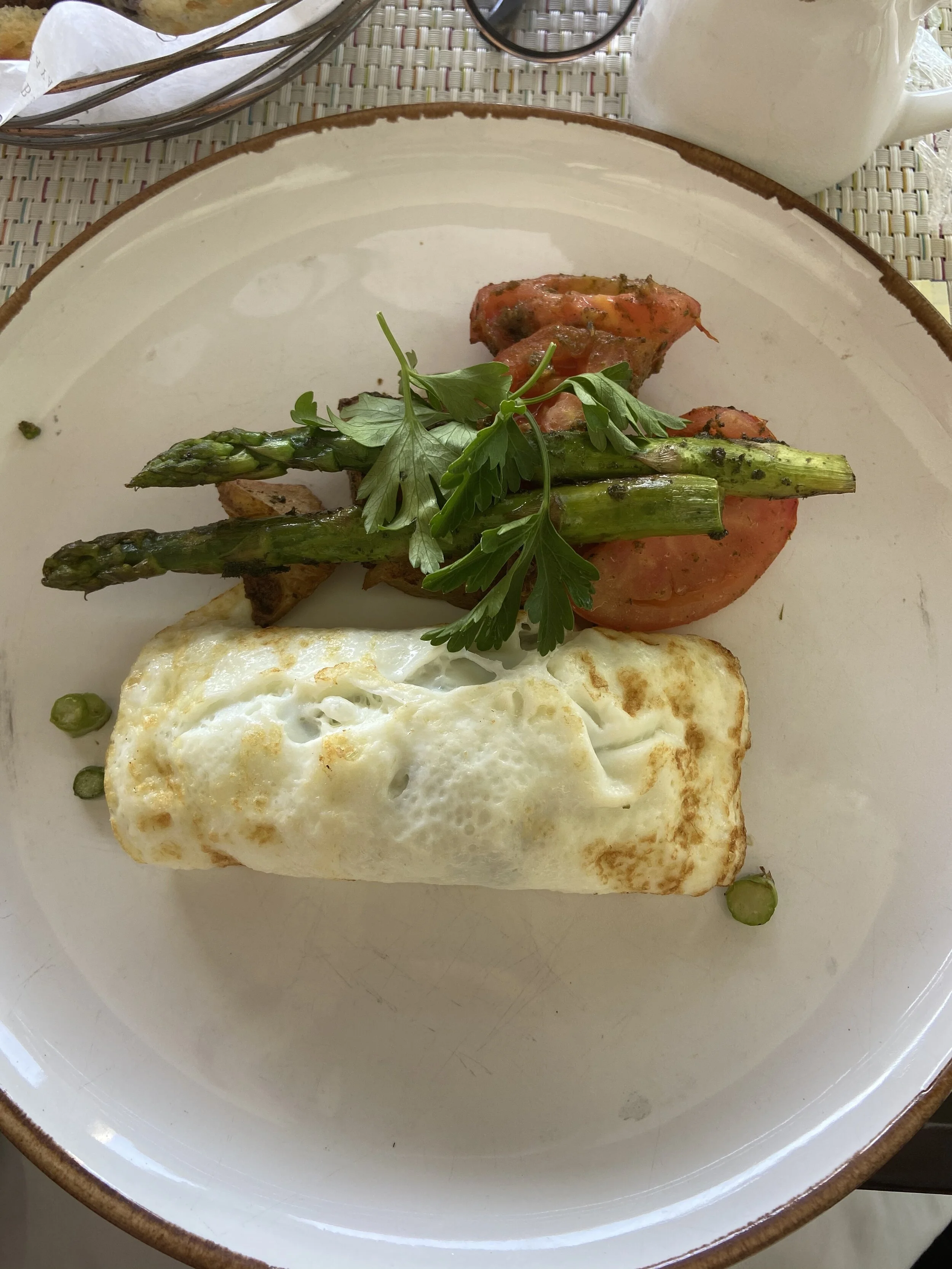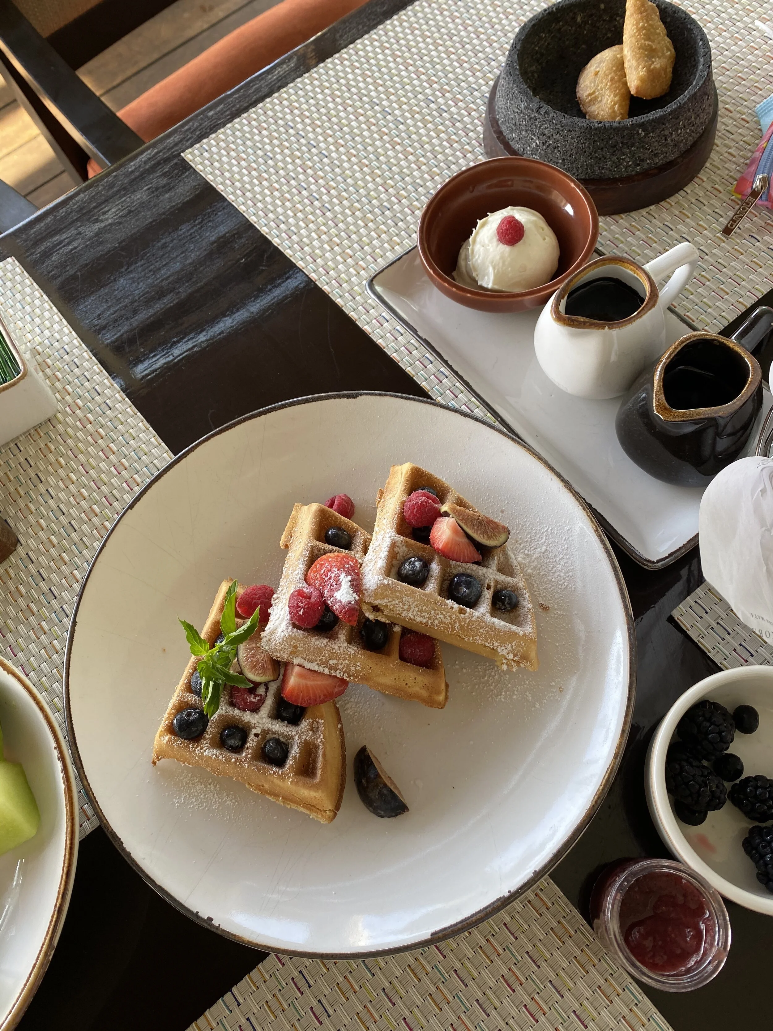 We made it to breakfast around 8:30 and this time we got a bigger table to hold all of our food. We started again with a pastry basket and fruit bowl. Today they also brought a black bean and cheese empanada that I didn’t touch but Tzvi said was good. Today we tried the Belgian waffle, which came with syrup, chocolate sauce, and maple syrup. How bad could that be? Tzvi got huevos rancheros and I got another omelet with asparagus. All delicious.
