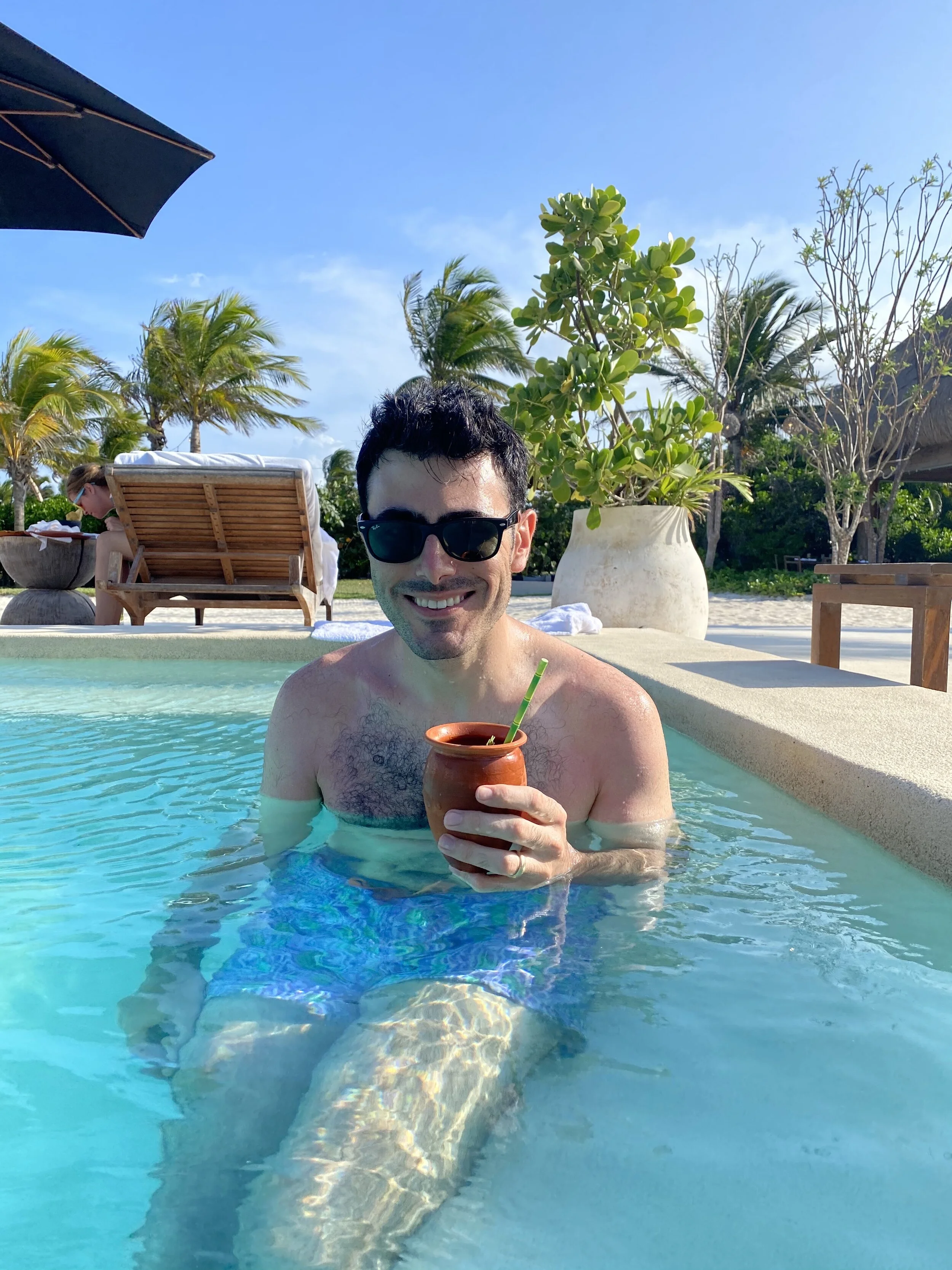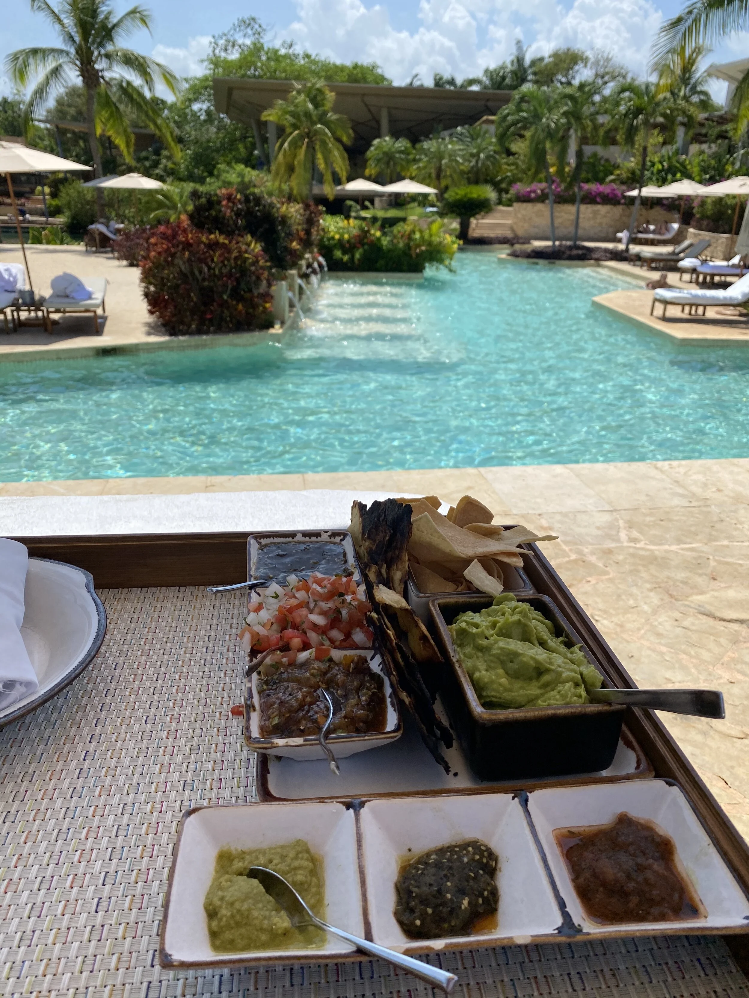 Around 3:00 PM we left the pool and took a golf cart to El Pueblito, which is the little village within the Mayakoba complex. The ride itself is an adventure because about every 50 feet there are stones instead of road and its so bumpy. The place is basically just a single town square with a bunch of shops and restaurants, a kids arcade and, for some reason, a church. They do a temperature check when you arrive, which I’m sure is super accurate. There were only a few people walking around. We got souvenirs for the girls and I got cookies at the Rosewood bakery. Then we rode back.