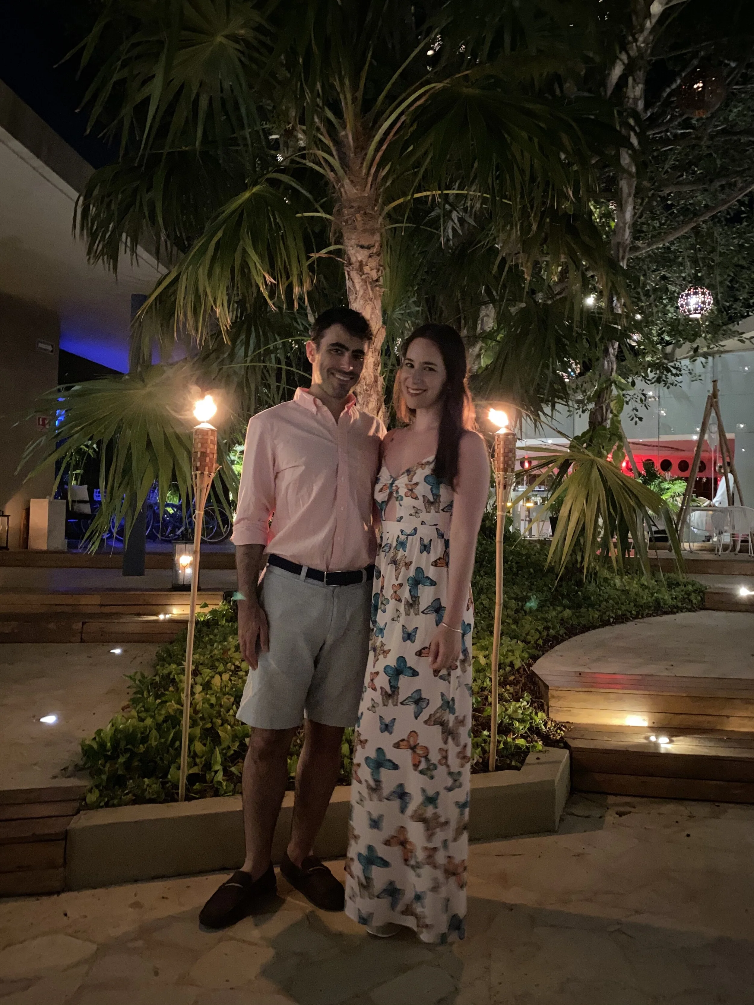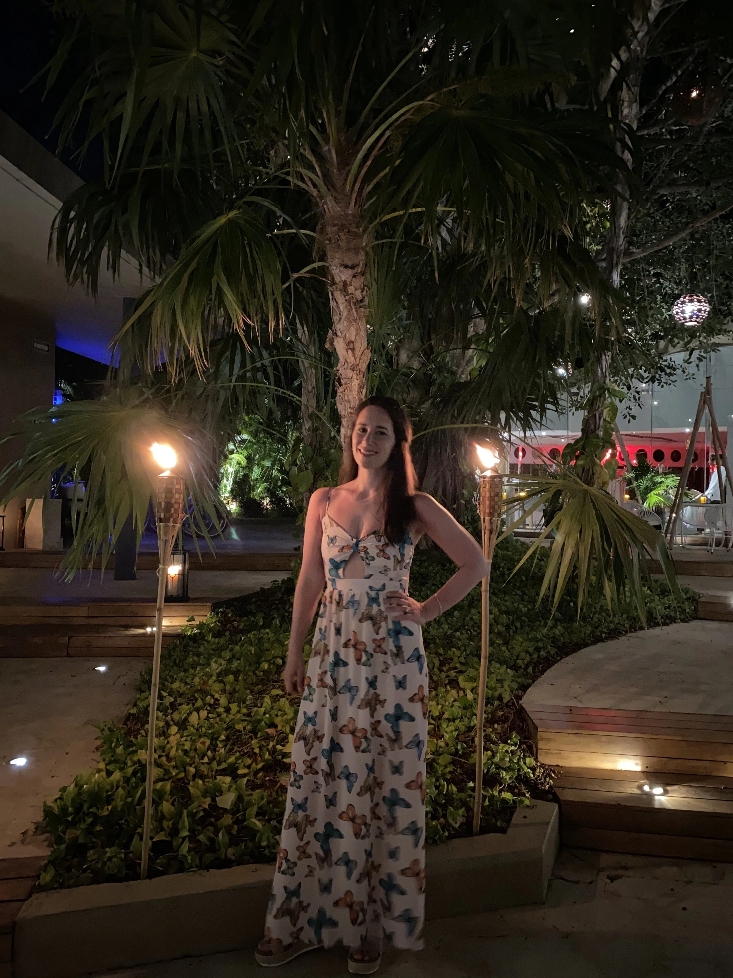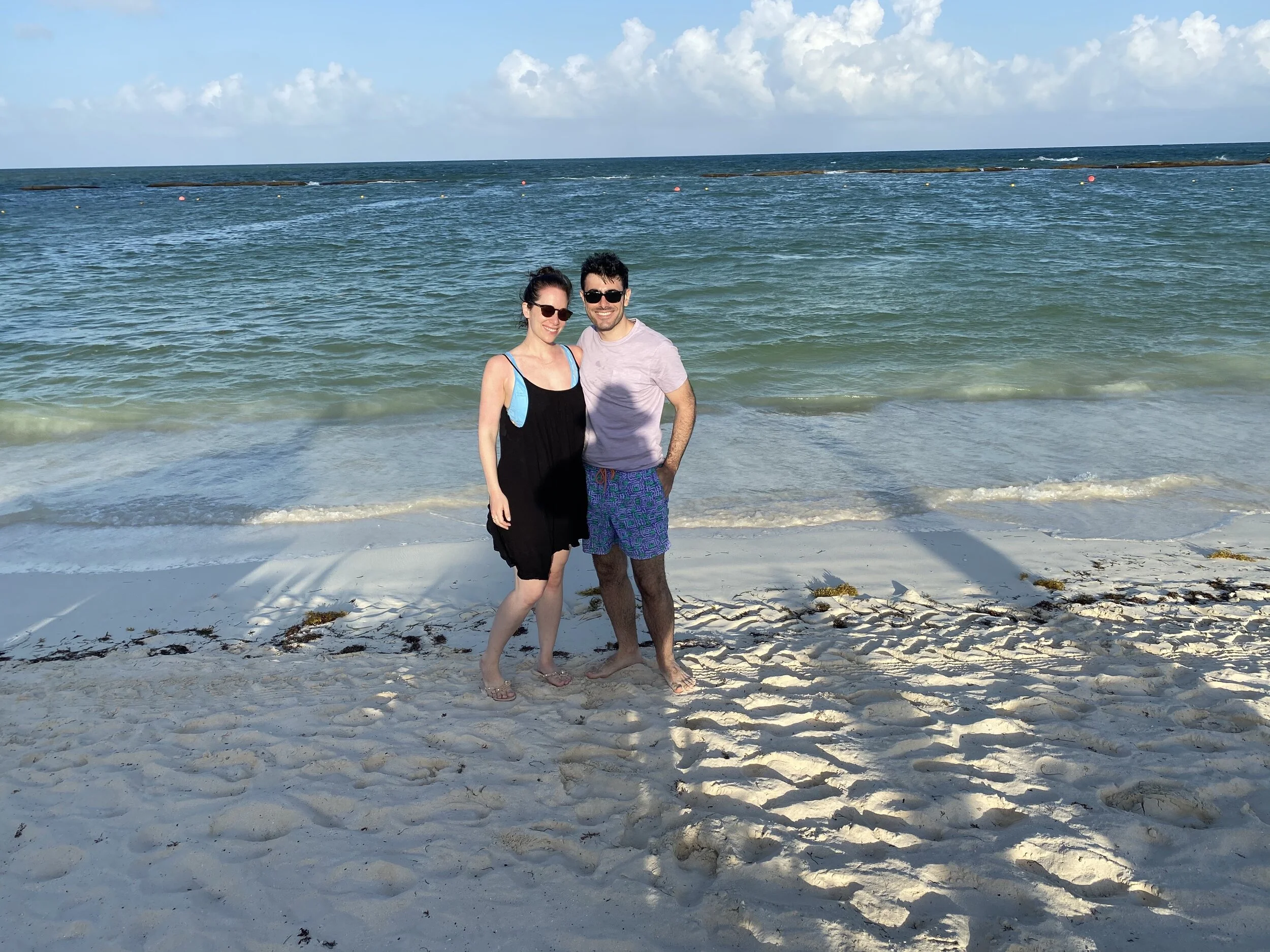 We decided to spend the rest of the afternoon at the beach pool, but when we got to the beach we were shocked to find that all of the seaweed was gone! It was totally clear. Actually, that’s a bit of an overstatement – the water was still pretty green, but at least it wasn’t full of seaweed. We ended up getting two seats in the sand and ordered cocktails (I got another mudslide). We spent a few minutes in the ocean, but the ground was pretty rocky and painful to walk on, but I get credit for a dunk in the ocean. Then we spent a little while in the adult pool. We laid at the beach until 6:00 PM and both finished the books we had started on Monday, and then went back to the room to pack and get ready for dinner. Pretty good that we both were able to start and finish a book on vacation. I read The Guest List by Lucy Foley and Tzvi read Recursion by Blake Crouch. We each recommend our books.
