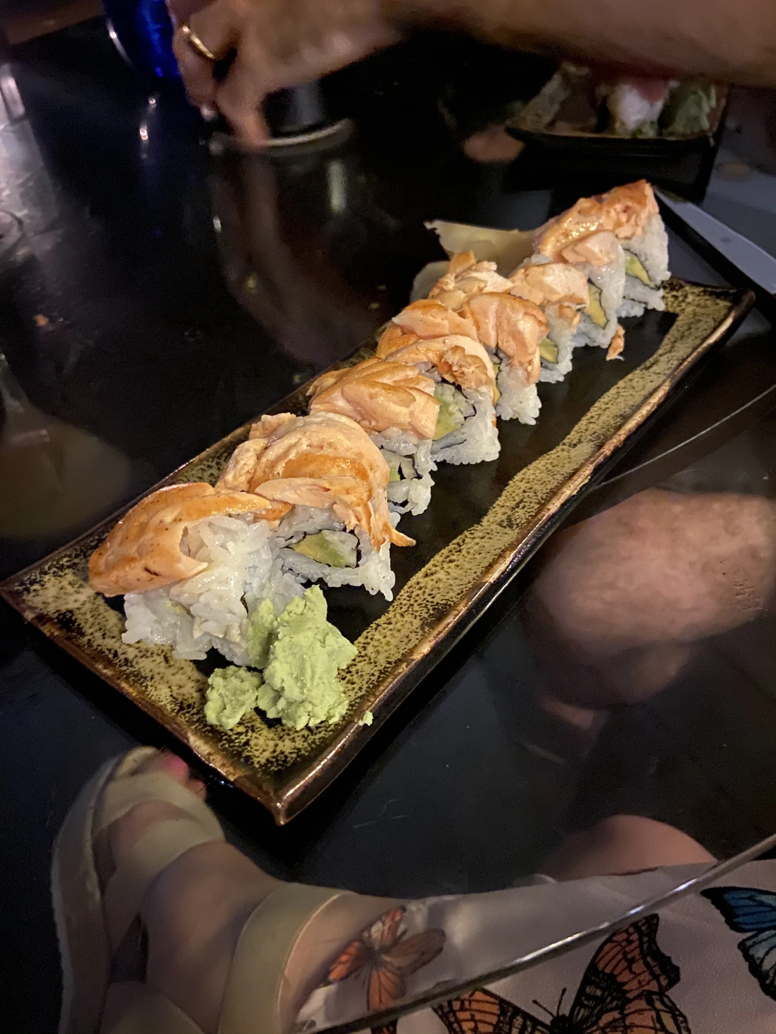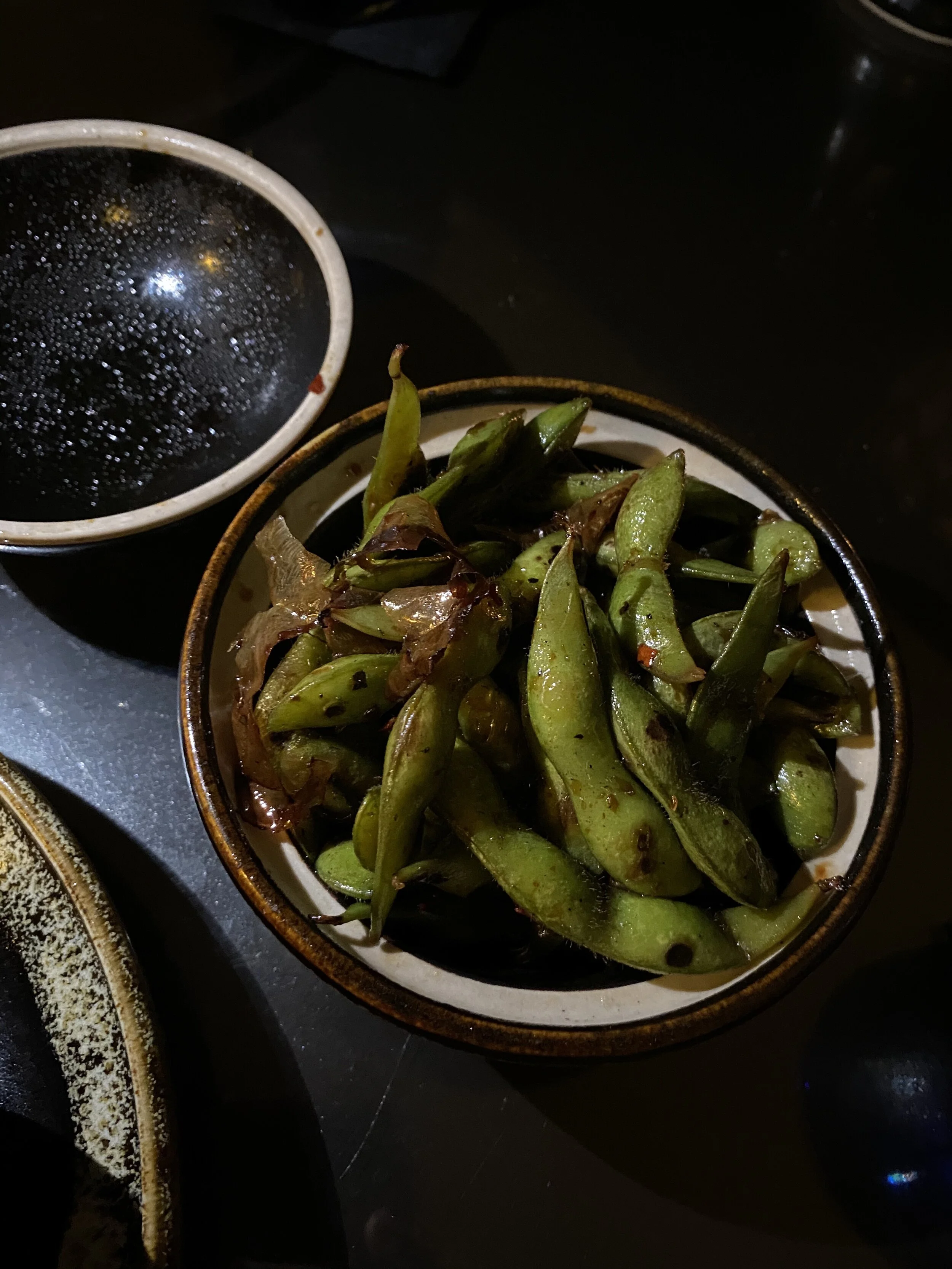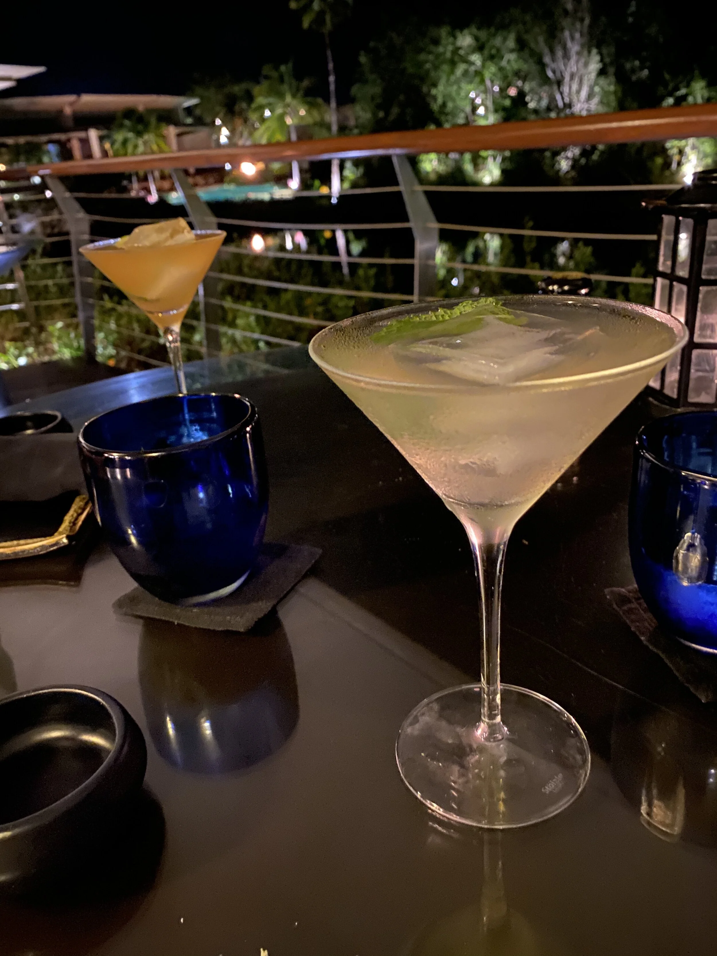 Around 8:15 PM we left to go to dinner at Agave Azul, which is the sushi restaurant here at the hotel. We both got cocktails that had yuzu because I guess that’s Japanese. They brought me a chair for my bag. We shared “edamame loco,” which were like grilled edamame with chili flakes, and “cauliflower al wok,” which was spicy curried cauliflower. Both were really delicious. Then I had a cooked salmon and avocado sushi roll, and Tzvi had a raw tuna sushi roll. For dessert we had a yuzu cake that was shaped like a sushi roll (though we didn’t realize that until we looked at the photos later) and a chocolate mouse with caramel and espresso namelaka, whatever that is.