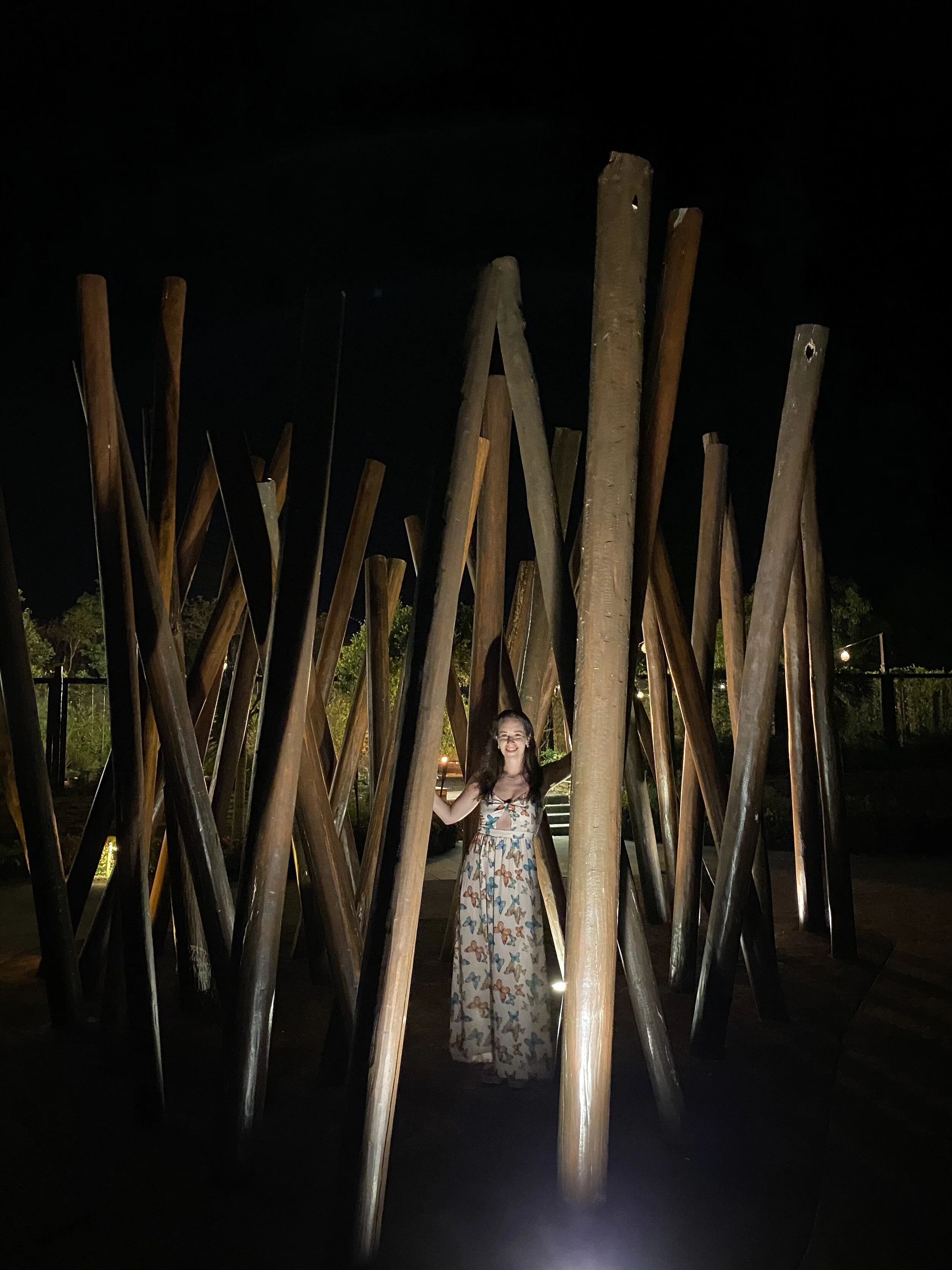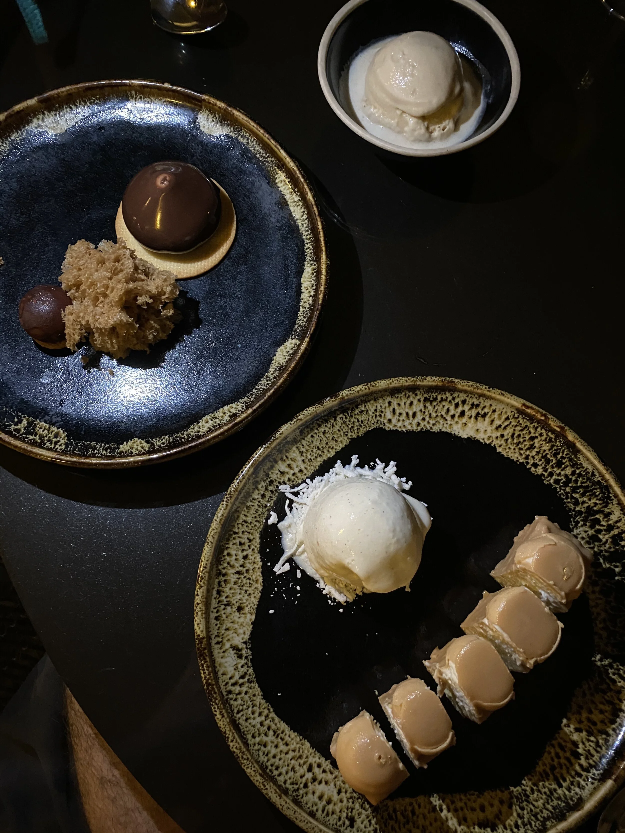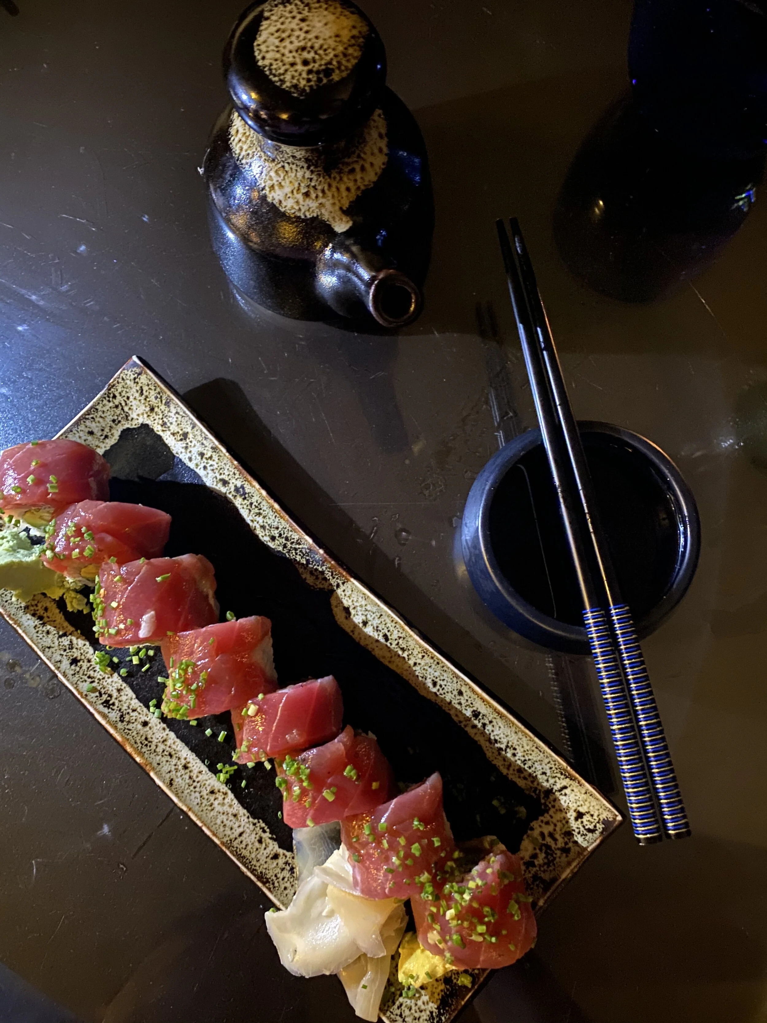 Around 8:15 PM we left to go to dinner at Agave Azul, which is the sushi restaurant here at the hotel. We both got cocktails that had yuzu because I guess that’s Japanese. They brought me a chair for my bag. We shared “edamame loco,” which were like grilled edamame with chili flakes, and “cauliflower al wok,” which was spicy curried cauliflower. Both were really delicious. Then I had a cooked salmon and avocado sushi roll, and Tzvi had a raw tuna sushi roll. For dessert we had a yuzu cake that was shaped like a sushi roll (though we didn’t realize that until we looked at the photos later) and a chocolate mouse with caramel and espresso namelaka, whatever that is.