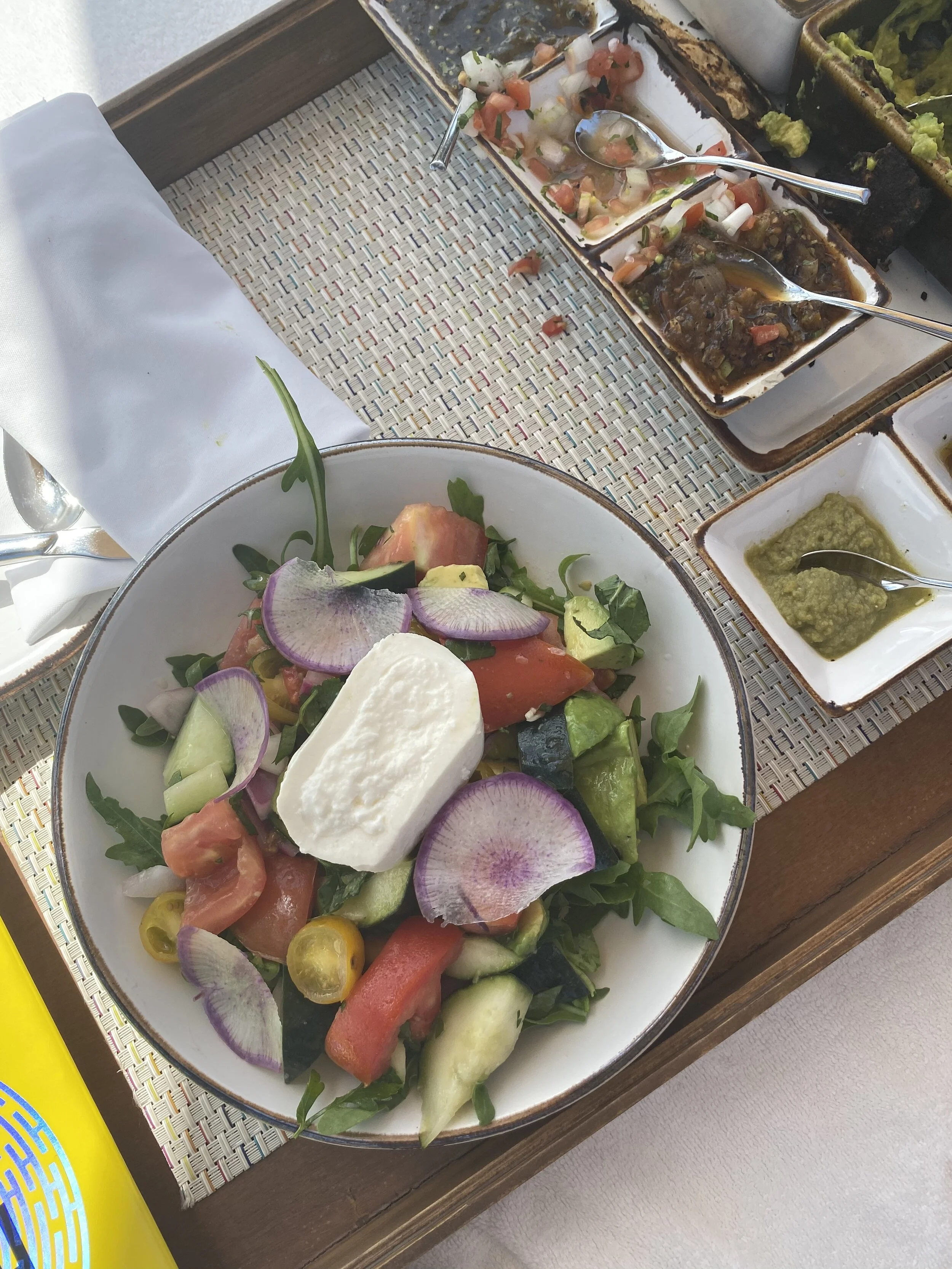 Finally around 130ish we ordered lunch. Today we got chips and guac again, because, you know, we haven’t been eating enough avocado. I got the kids pasta again (still delicious) and Tzvi got the La Ceiba salad with vegetables and burrata cheese, which he loved.