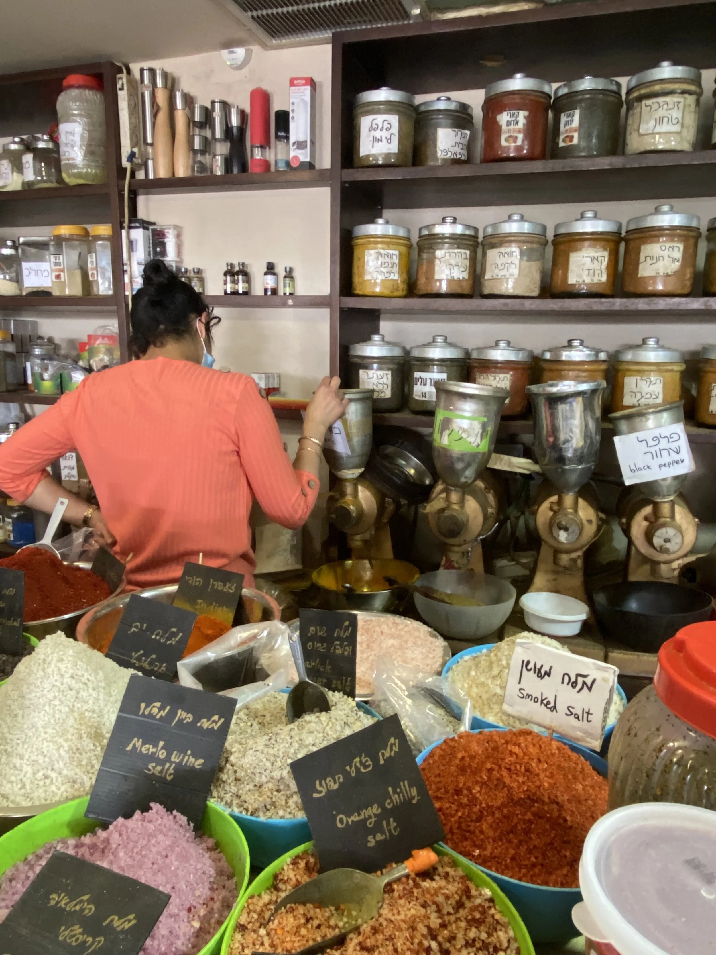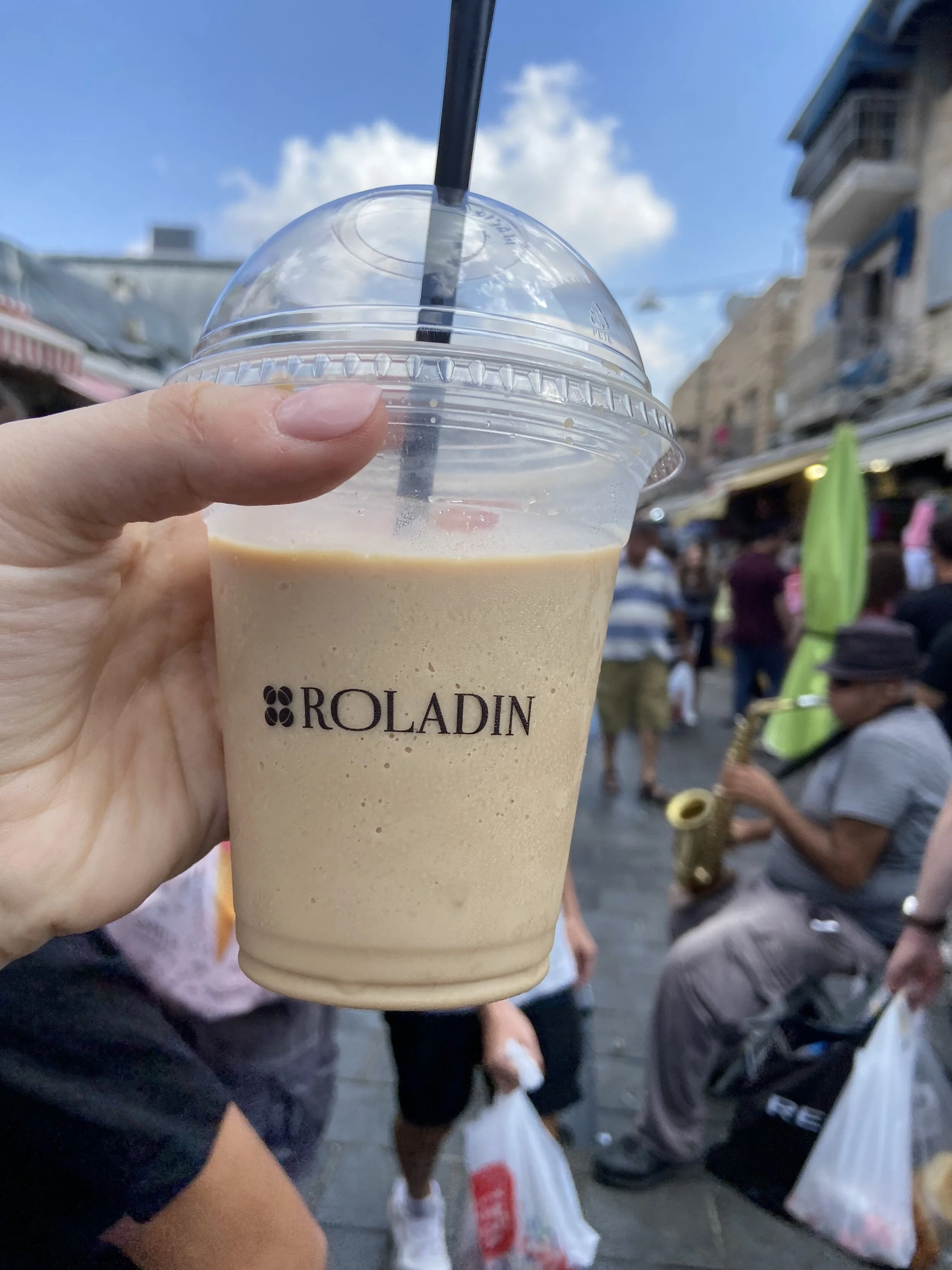 People were so anxious to get to Machane Yehuda. Finally, we found the bus, after about 10 people got lost, and headed to the shuk. I was so efficient I even surprised myself. I got marzipan rugelach, dried fruit from Rosemary, a bageleh, candy and chocolate, spices, and dried fruit. I walked into the spice store and asked “are you Oshrat” and her response was “Peas love and carrots?” Yep. Then I got an ice coffee from Roladin and called it a day.
