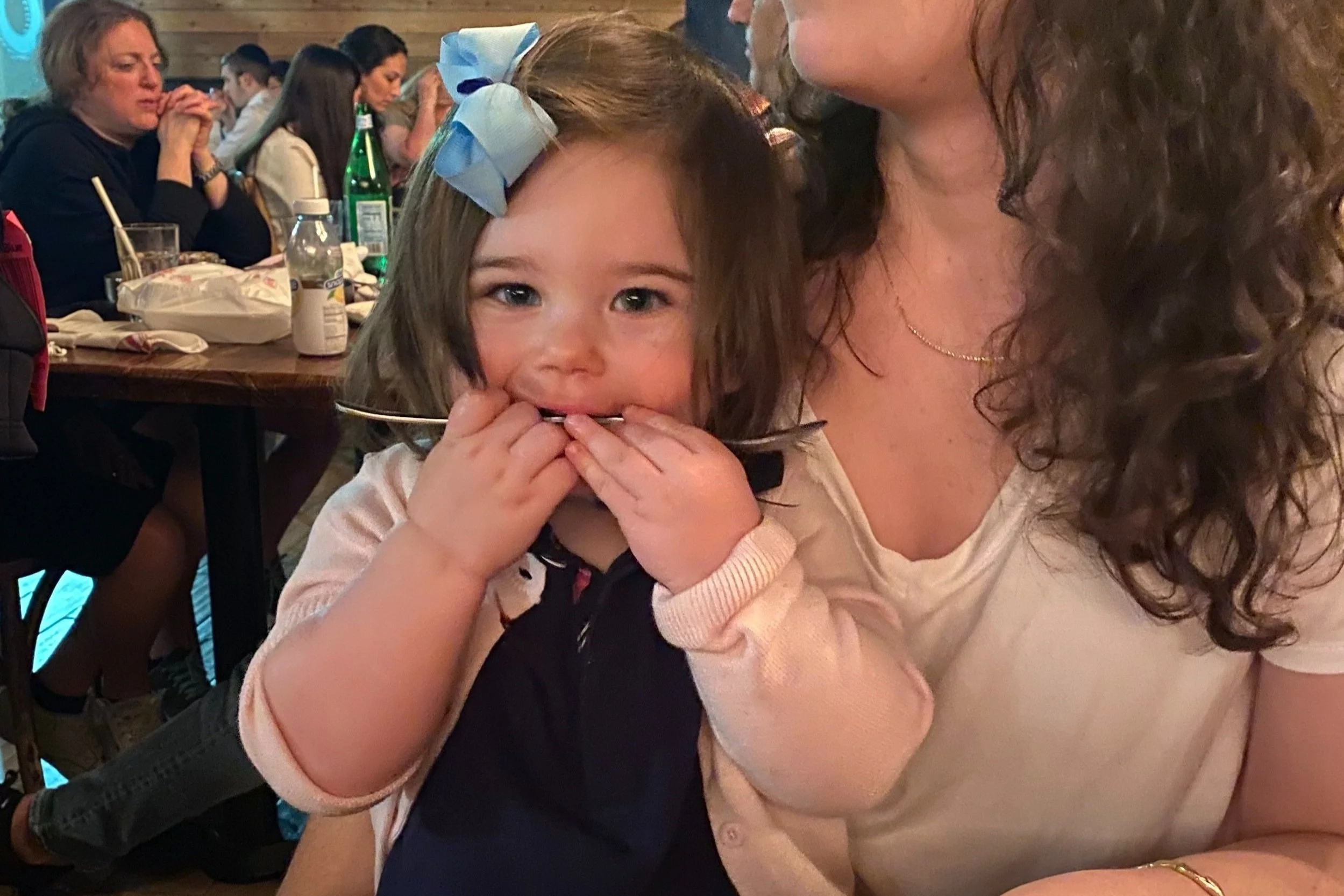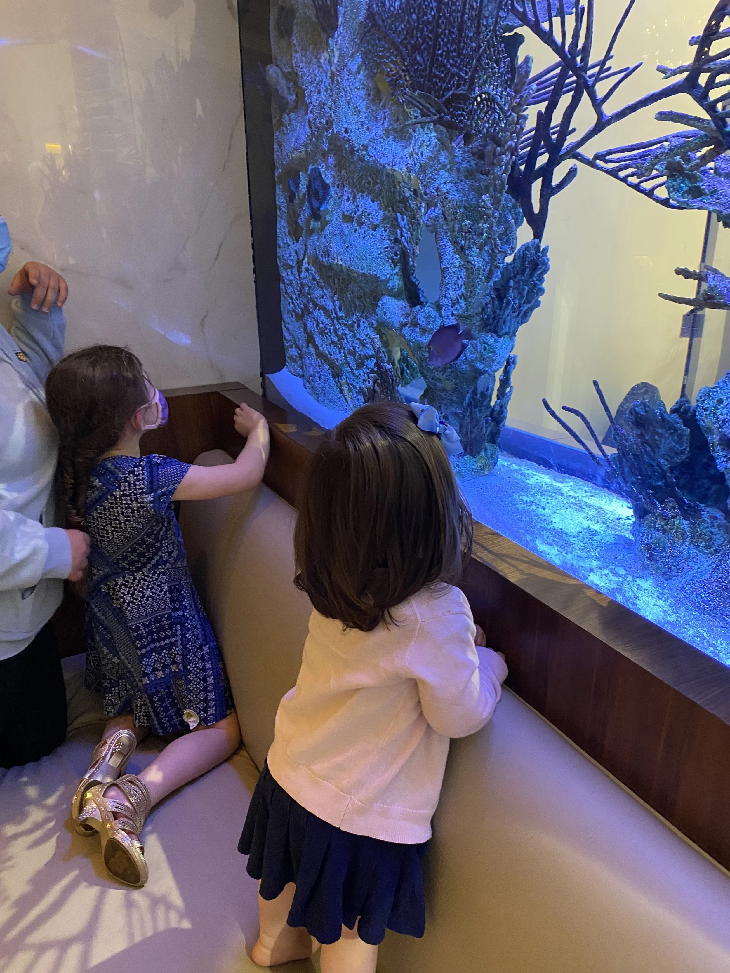 Then they did a sing-a-long of Sweet Caroline, which Hallie also thought was great even though she didn’t know the song. Then, during Sweet Caroline, they dimmed the lights and all of the waiters started marching toward our table with a sparkling dessert. Hallie was so excited that they were singing and dancing for her, until the end, when they all said “happy birthday” and she got really confused and said “it’s not my birthday.”