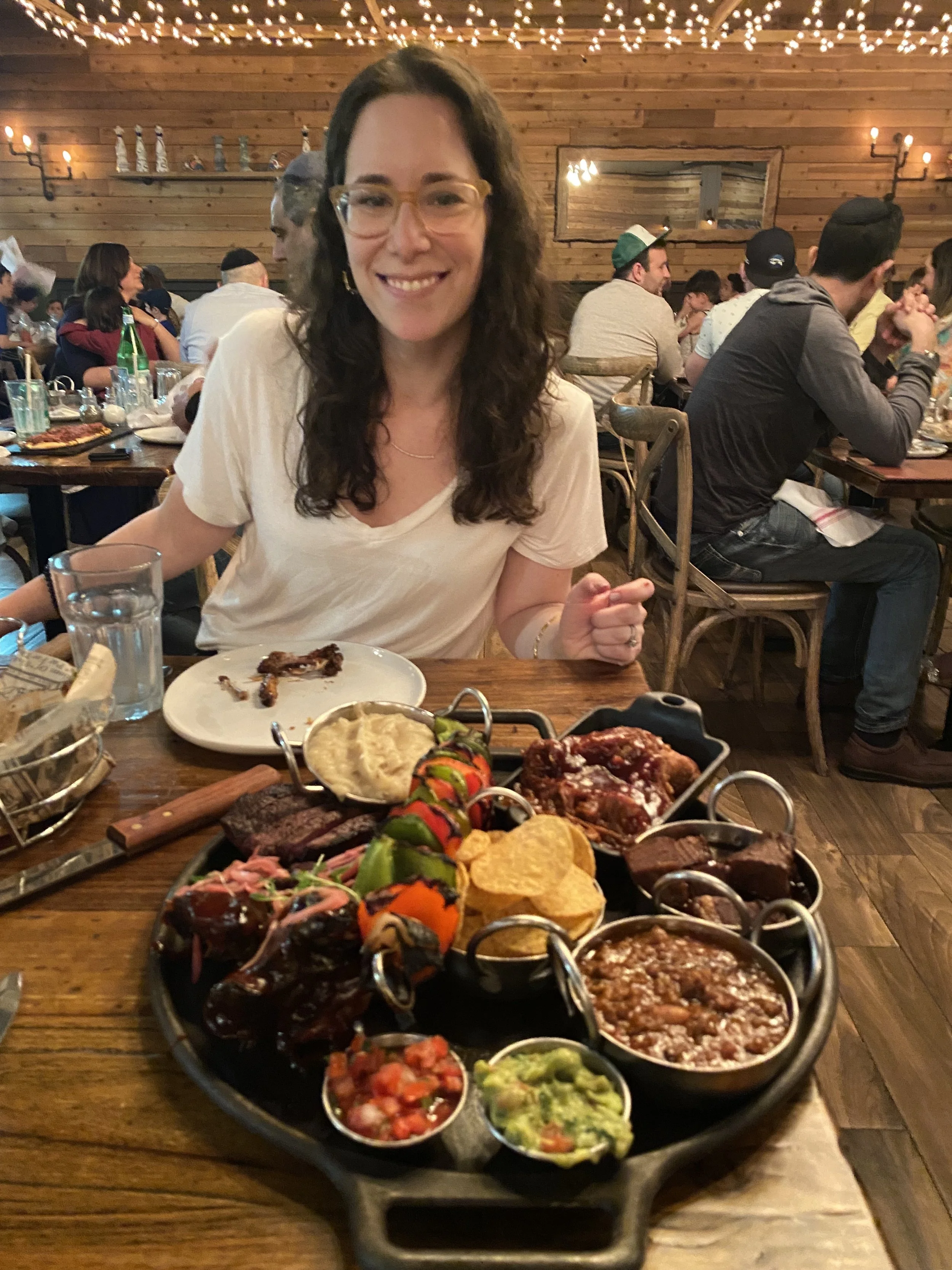 Dinner was fantastic. We started by sharing a cocktail which was actually decent. We also shared an order of bourbon BBQ wings and for the girls we ordered chicken nuggets and fries. For our main, Tzvi and I shared the BBQ Chef Platter for 2, though it could’ve easily fed three or maybe even four. The platter had short ribs, grilled steak, pulled briset, burnt ends, sausage, baked beans chili, chips, onions, guac, mashed potatoes and skewers of grilled veggies. It was delicious. A ton of food, but all delicious.