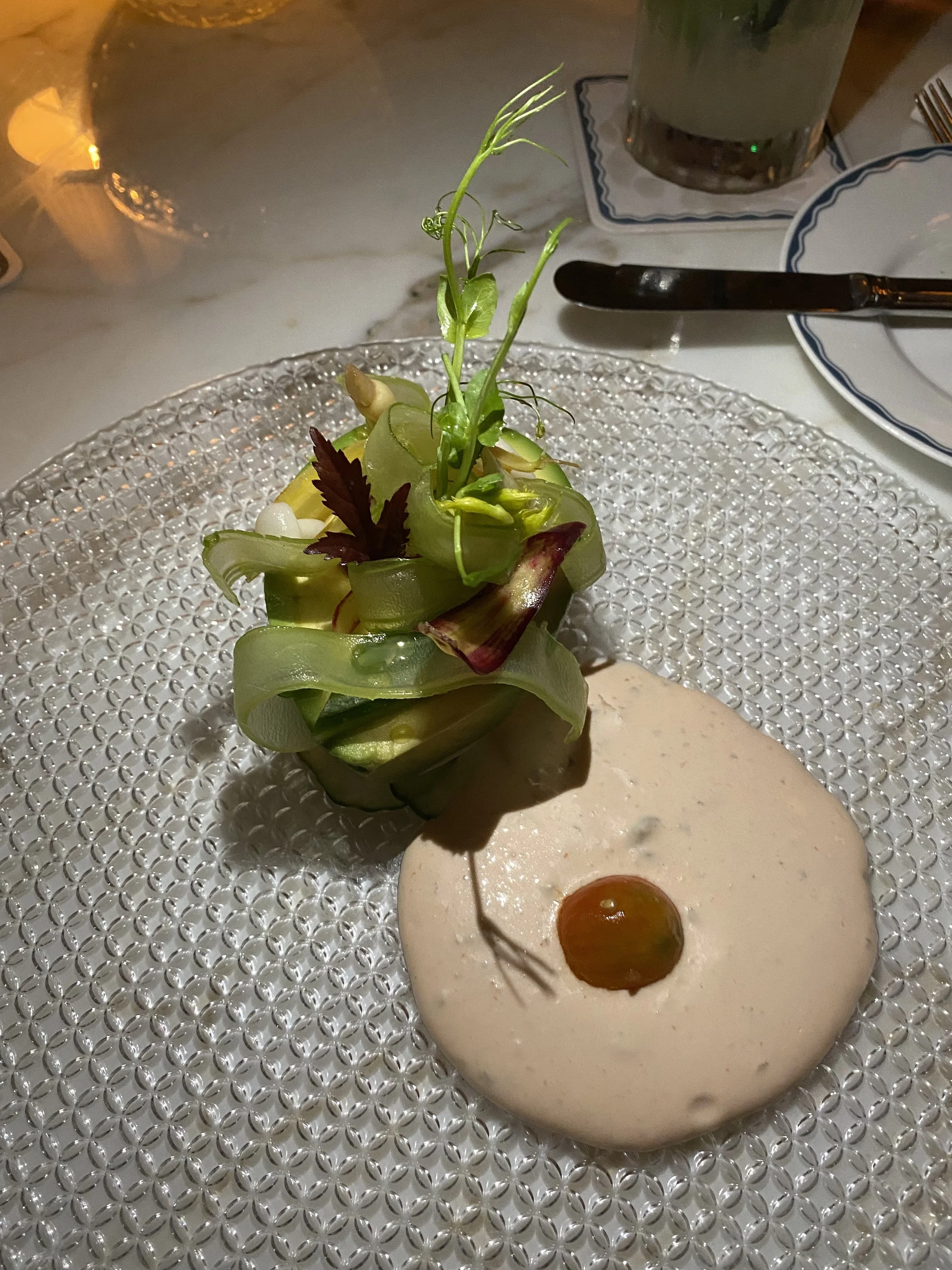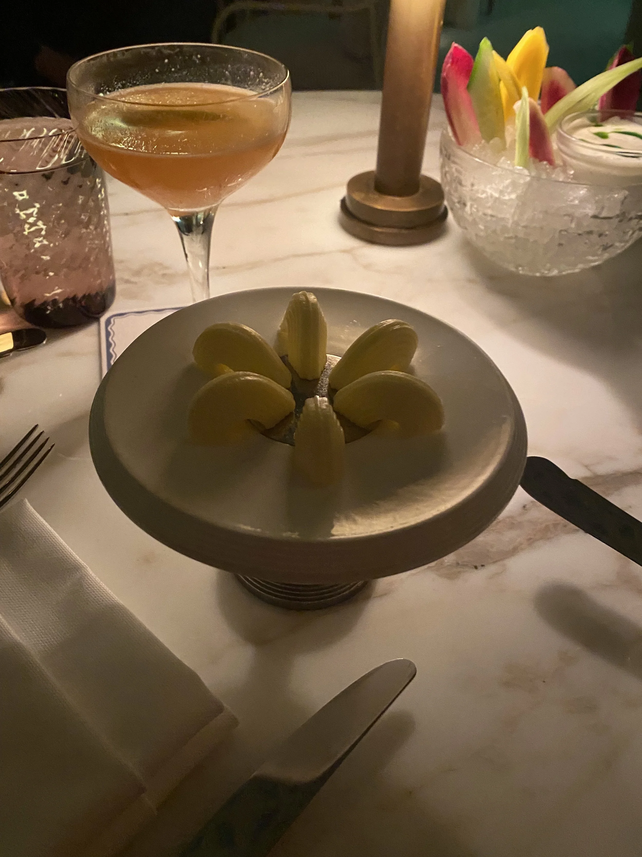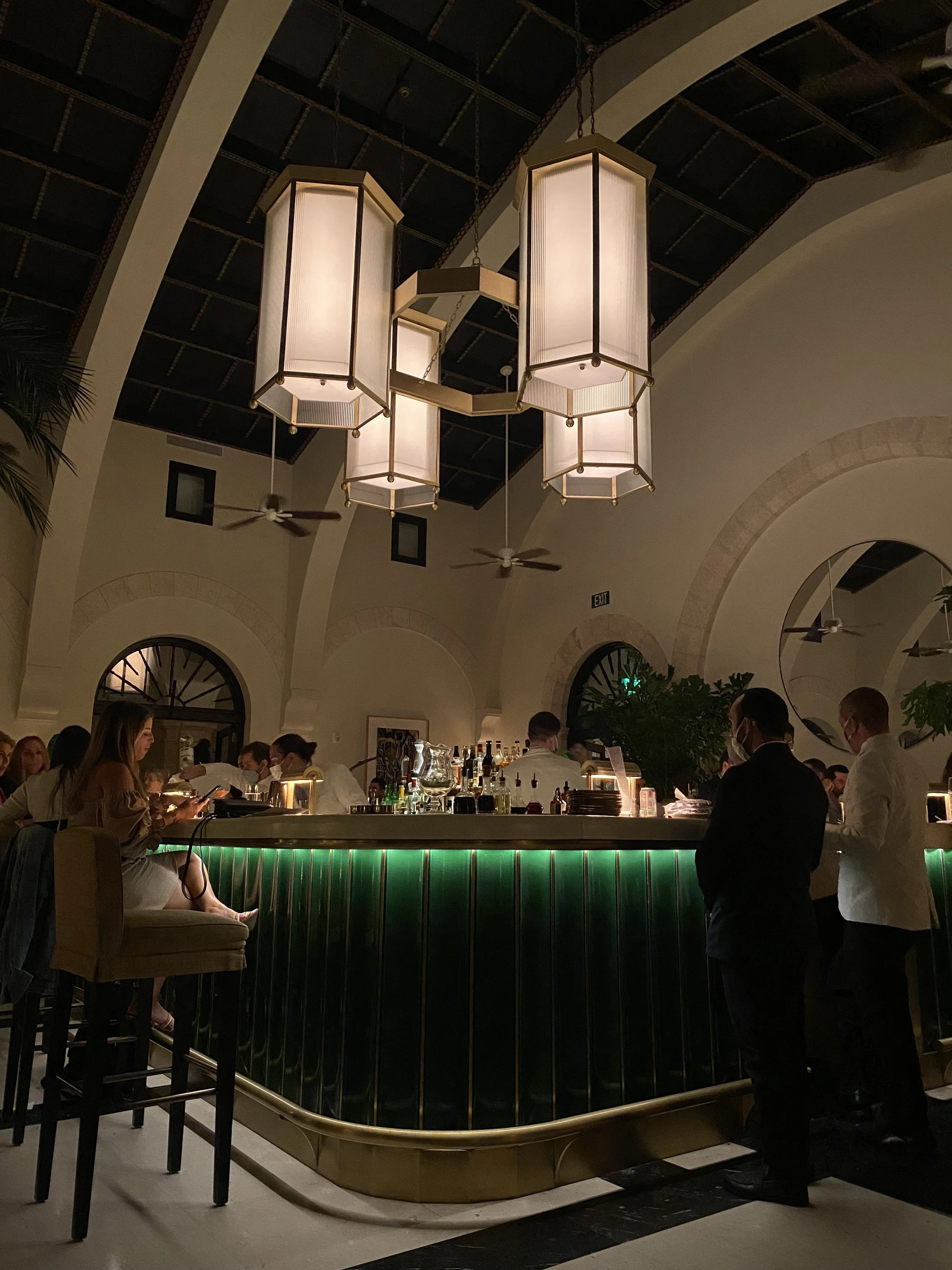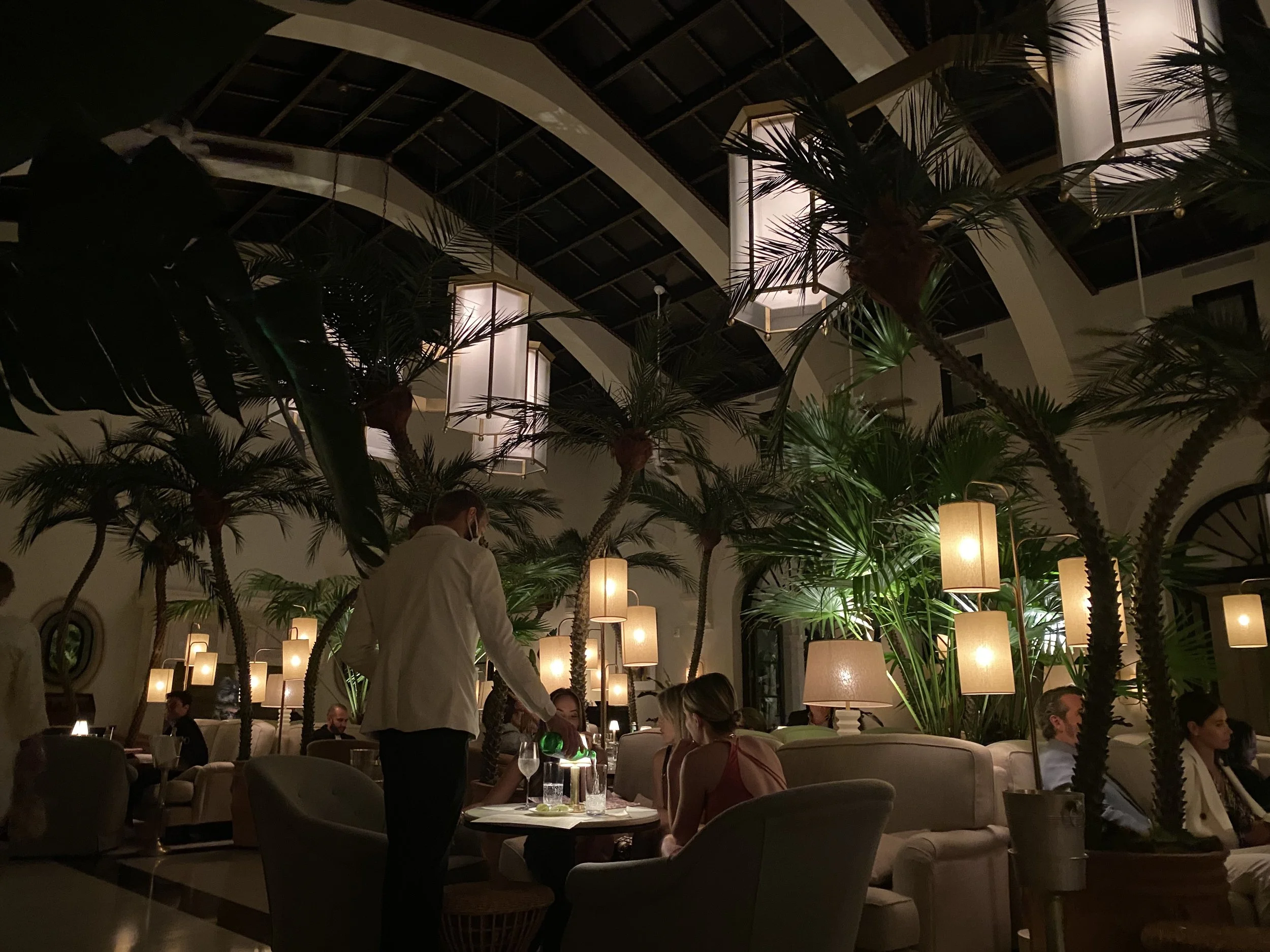 We took an Uber to the Four Seasons in Surfside, in the northern part of Miami. We had a 9pm dinner reservation at the Surf Club (the restaurant at the Four Seasons), so we spent an hour having drinks at the Champaign Bar (the bar at the Four Seasons). First of all, the hotel is gorgeous. I think it was $2000/night for the nights we were in Miami. It looks like it was fairly recently renovated, or maybe restored is a better word. It has a real old-Miami feel to it. Everything looks old – classic furniture, ceiling fans in the bar – but also looks brand new. I had a drink called Fiesta in Rio, which had cachaca, pineapple juice, orgeat and acai infused Campari. Tzvi had a drink called Derby Day, which had bourbon, bees wax, vermouth, fig cognac and was topped with a cherry that had been soaking in a jar of a Manhattan cocktail for a month. Tzvi’s also had a stalk of wheat in it that he poked himself in the eye with several times. Drinks were great. They also brought us potato chips and olives; I ate all of the chips and Tzvi ate all of the olives.