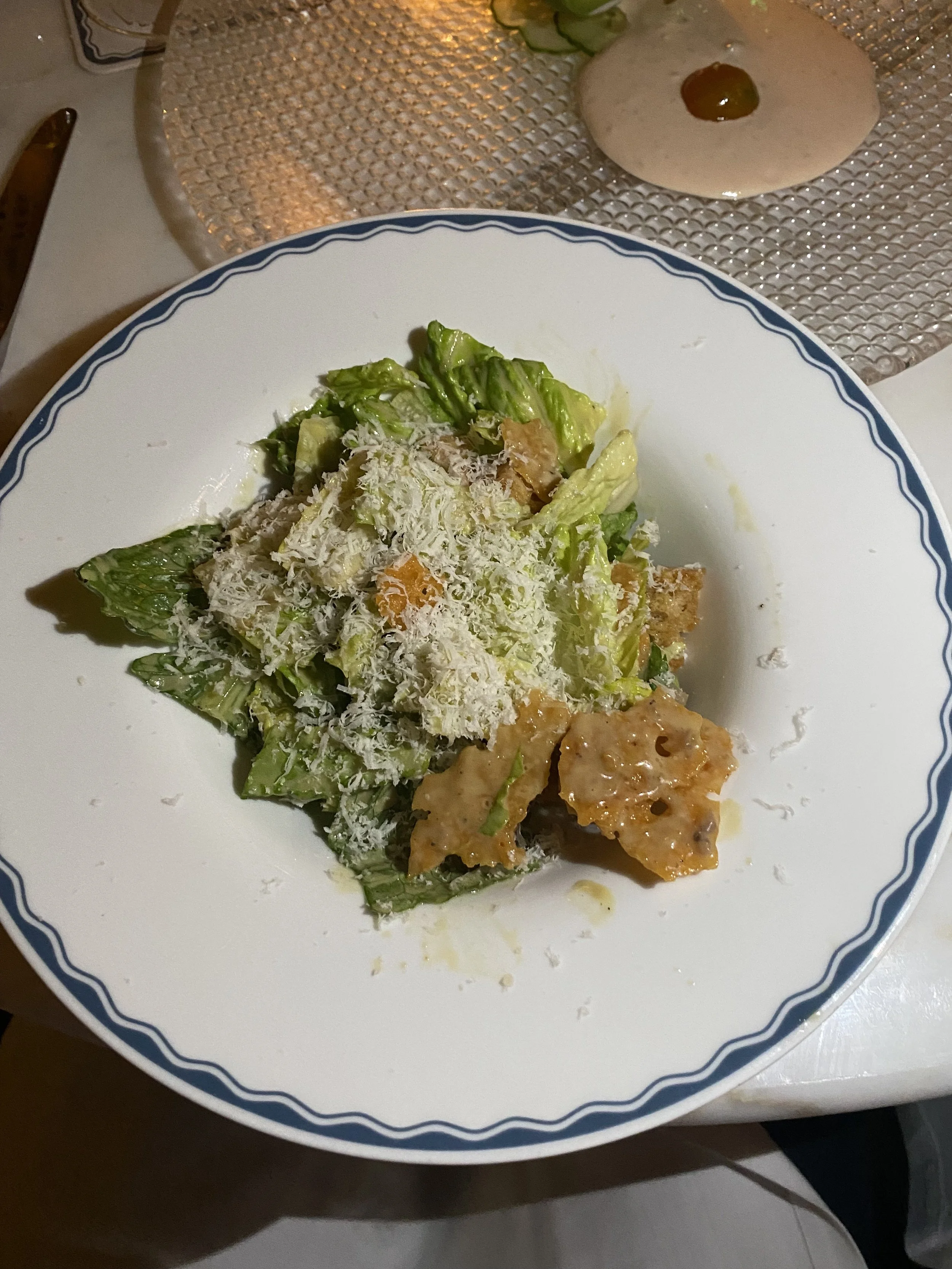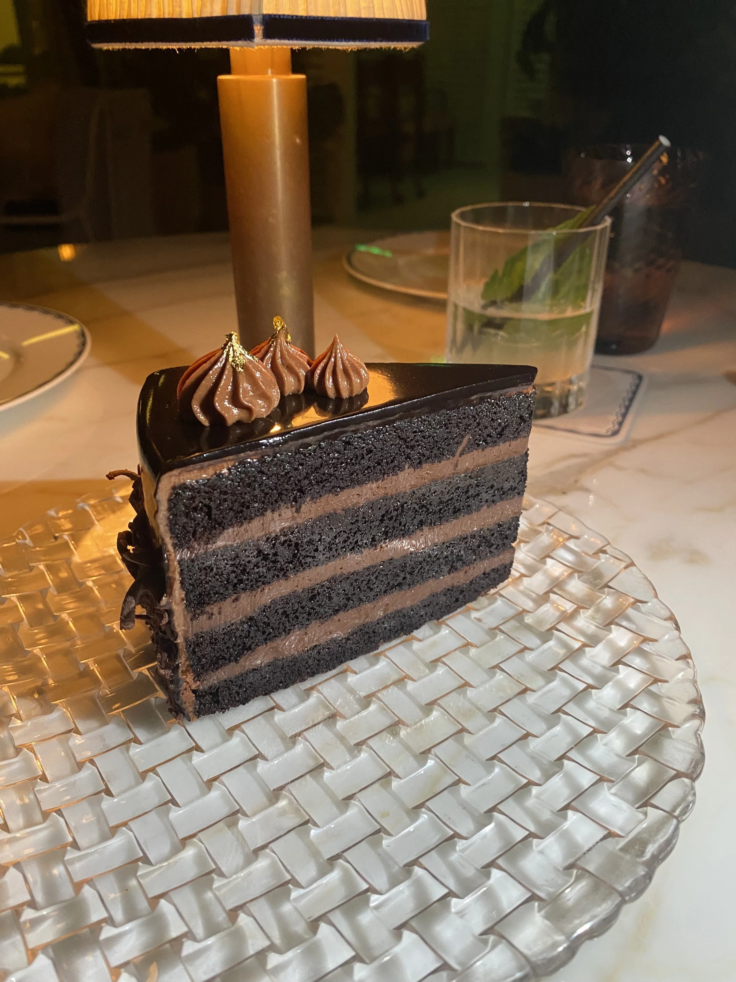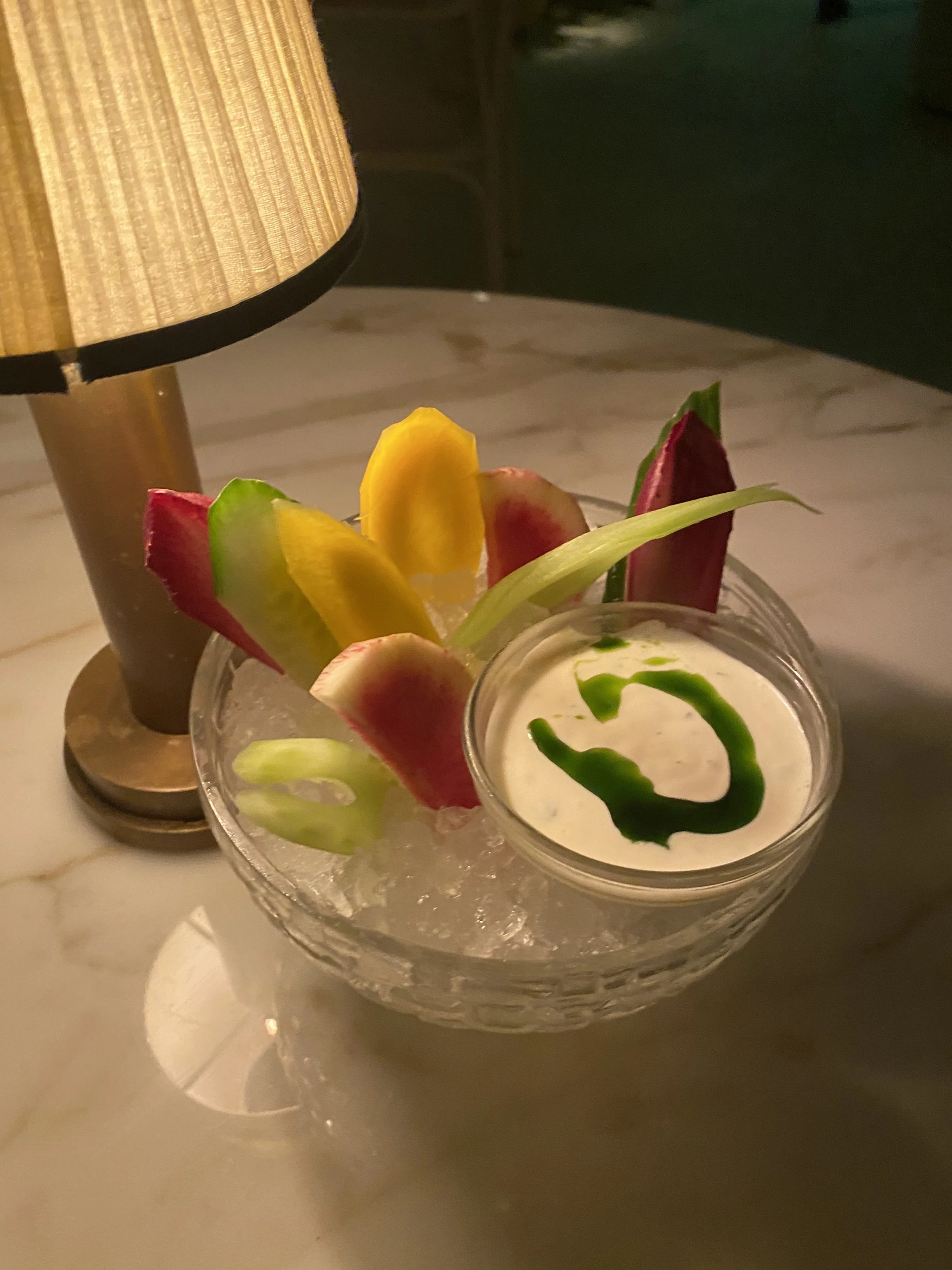 A 9pm we walked across the lobby for our dinner. The Surf Club is a Thomas Keller restaurant – same chef as Per Se in NYC, but less expensive (Per Se is $350 per person, and this was definitely not). First, we started by ordering more drinks, because, why not. Tzvi had a brown derby (I guess it was a Derby only night) and I had a basil smash. To start they brought us delicious bread rolls and little rainbow shaped butter pads. They also brought crudité over ice with ranch dressing. To start we shared a Caesar salad, which was prepared tableside. We really enjoy the tableside Caesar; it’s sad to see some people order it and not even watch the preparation. We also shared an “Avocado Louie” which was basically half of a “perfect” avocado from Santa Barbara filled with pickled vegetables. I didn’t love it, but I was impressed that they managed to get a perfect avocado. For his main, Tzvi had fettuccini alfredo with black truffles, and I had salmon that came with a sauce vierge, which is basically a fancy french salsa that I didn’t eat. All was good. Tzvi really loved his fettuccini. For dessert we had chocolate cake which was very good. I didn’t love the food quite as much as Tzvi, but I was at least able to appreciate that it was thoughtfully prepared and all very fresh and creative.