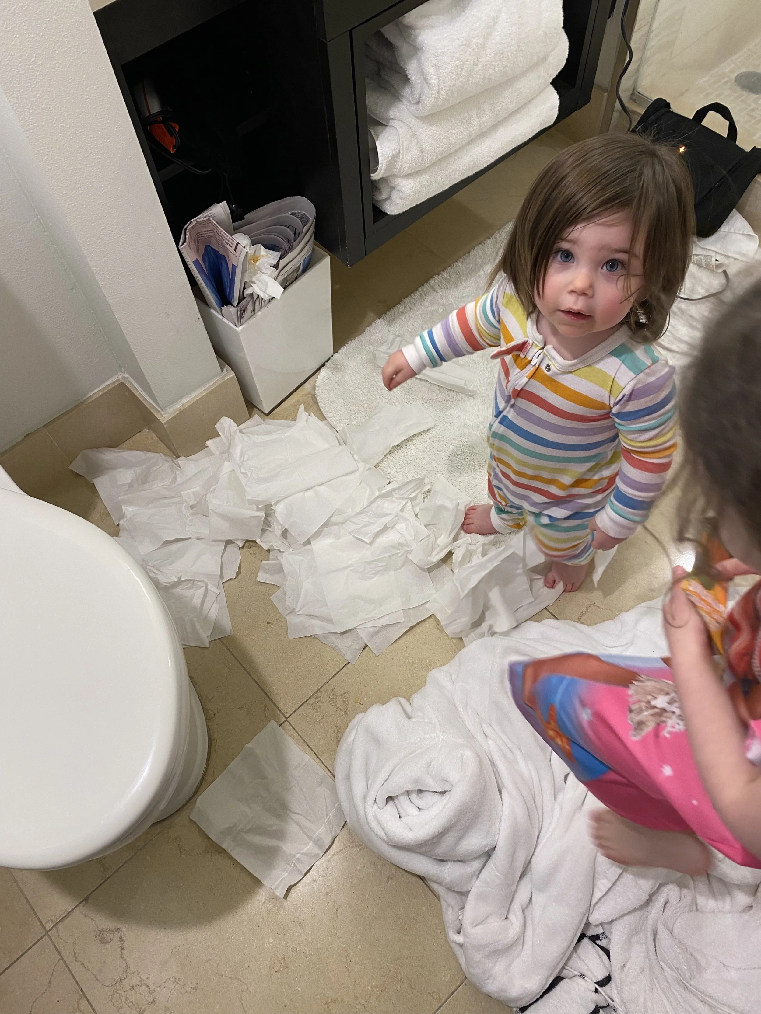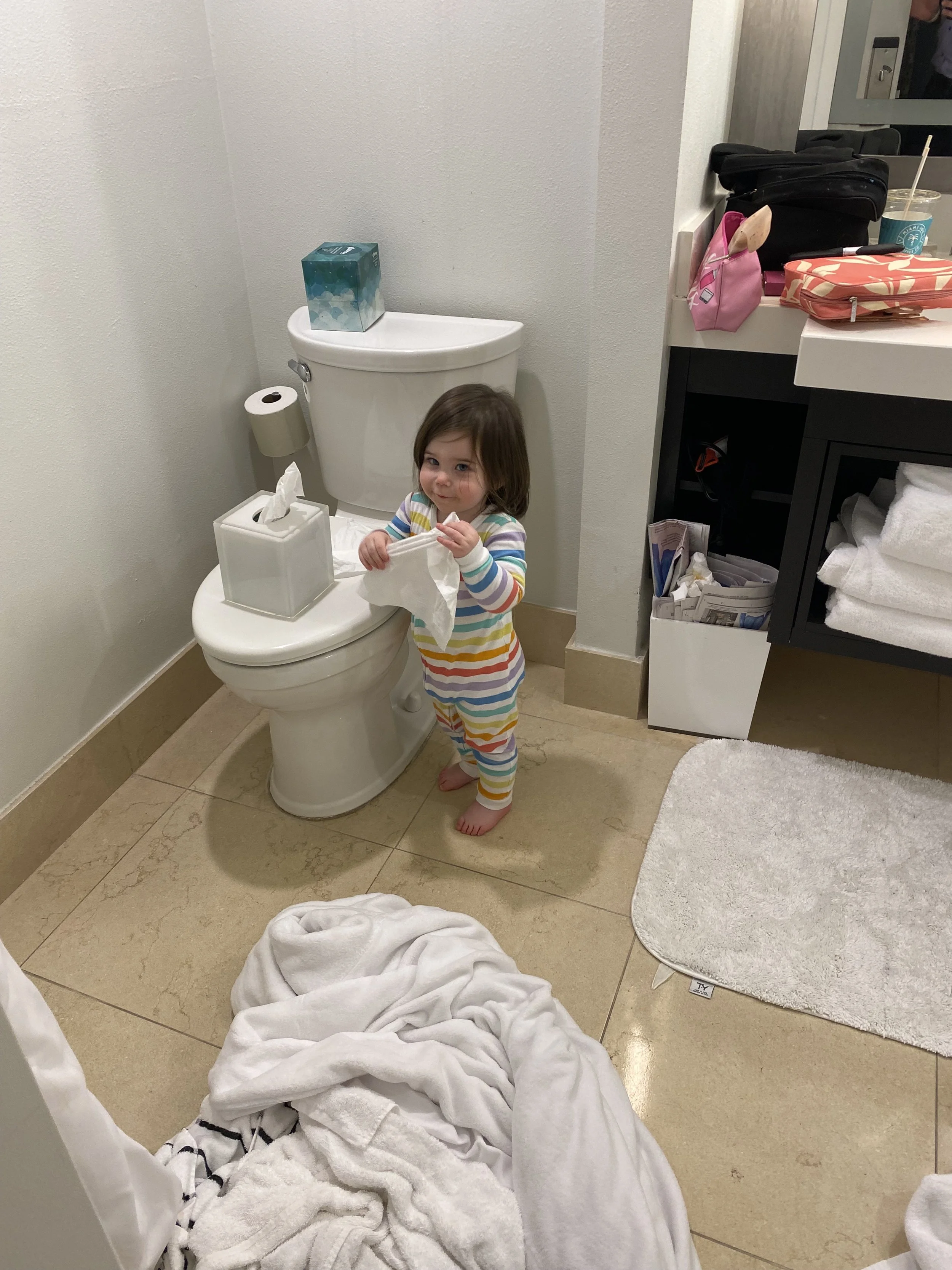 Today we were on our own and Robyn went off to see family she’s only facetimed but never met. So, we tried our best. We made it to the pool area around 10am and it was packed. There was space not directly near the pool, but on this fake grassy area. It turned out to be better because we had a space for the stroller and for the girls to walk around without being nervous that they’d fall in the pool.