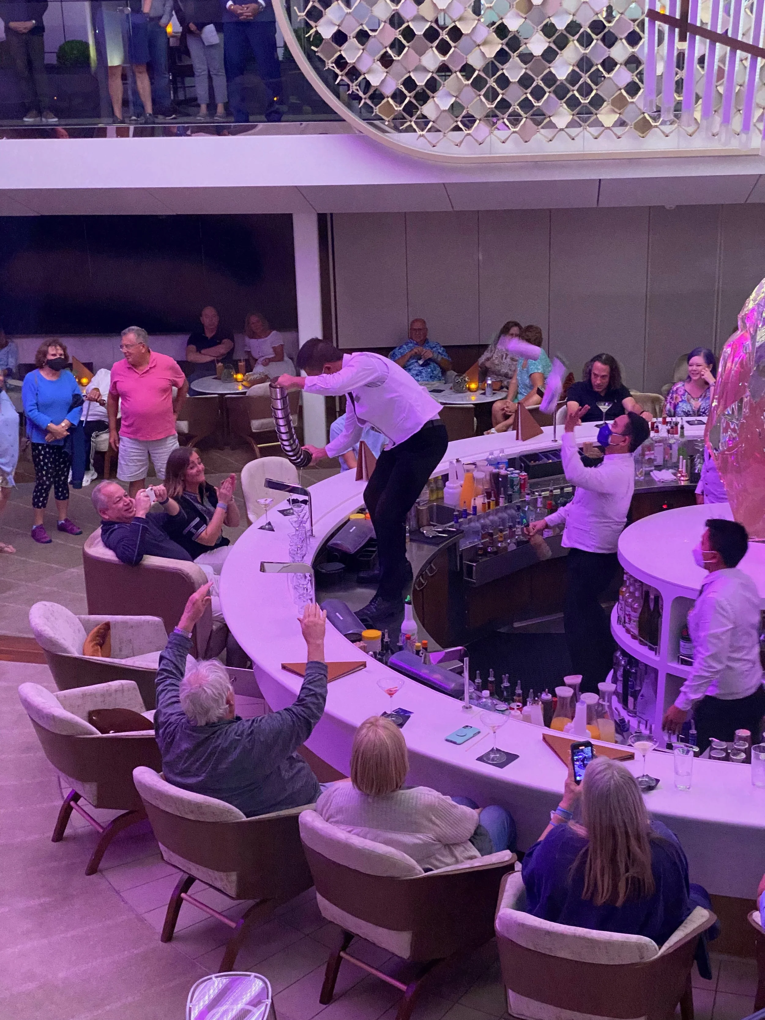 We spent a few minutes walking around and saw the bartenders at the Martini Bar putting on their nightly show where they flipped bottles behind their back and caught them and then made a giant martini that they poured into a bunch of glasses at once. It was cool.