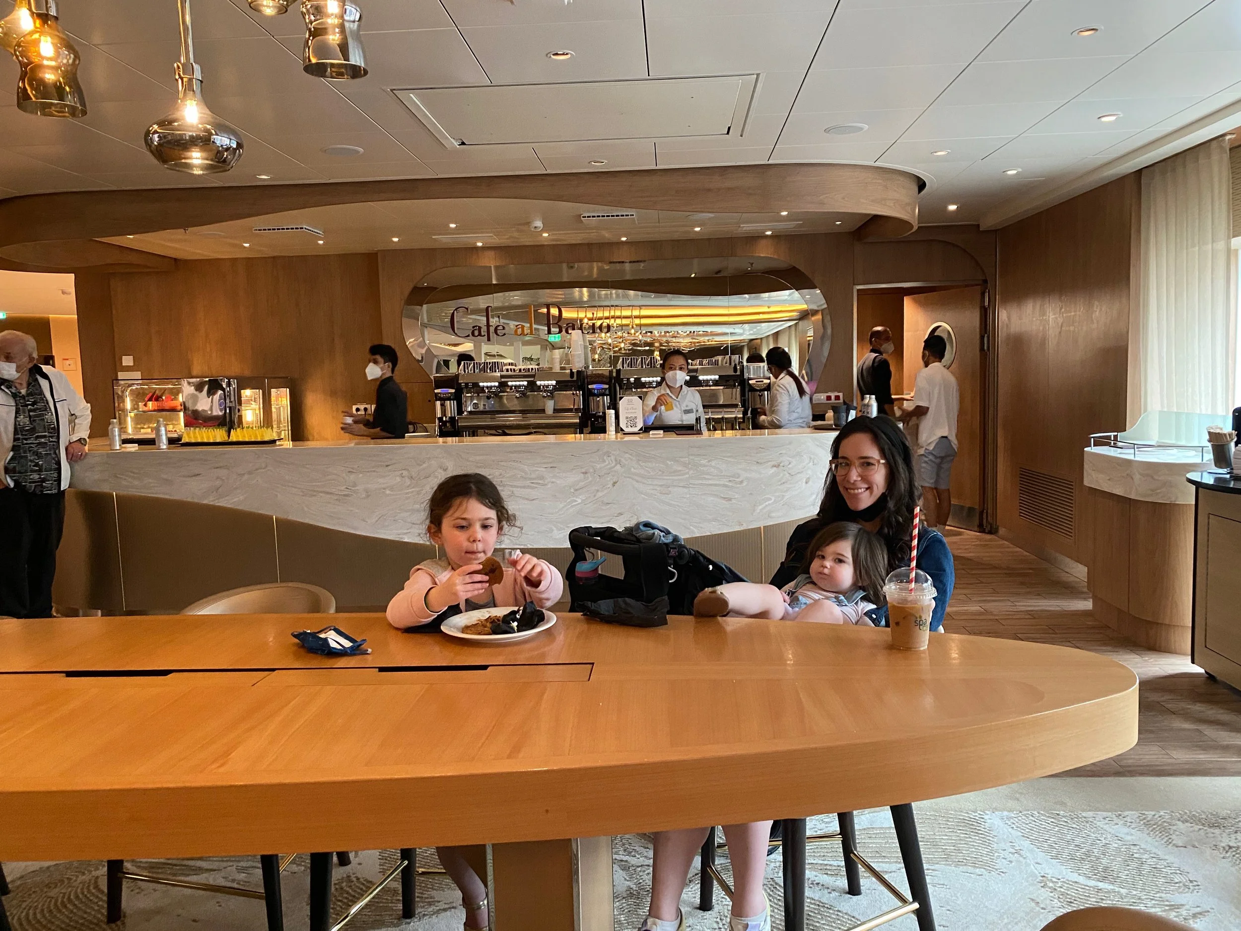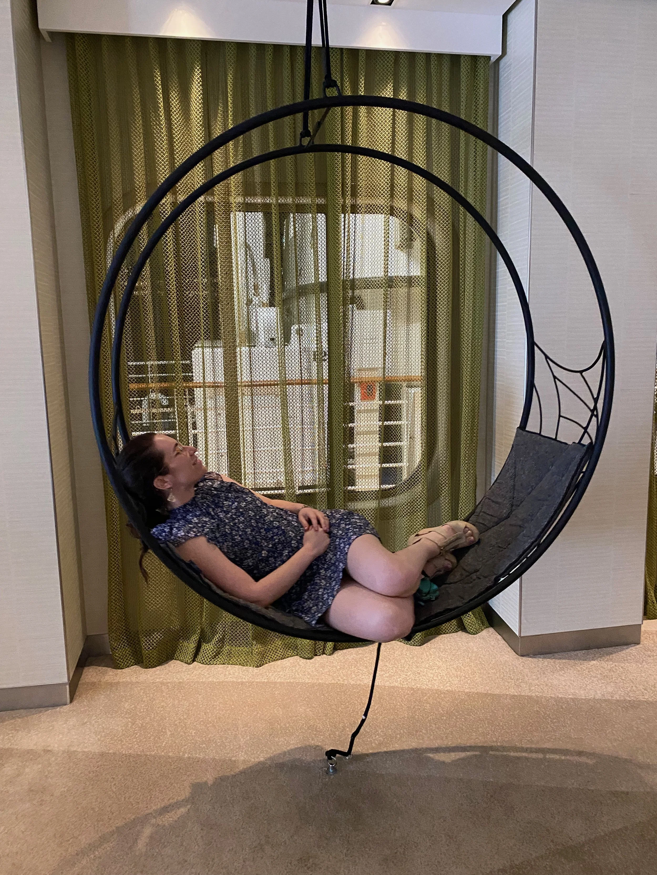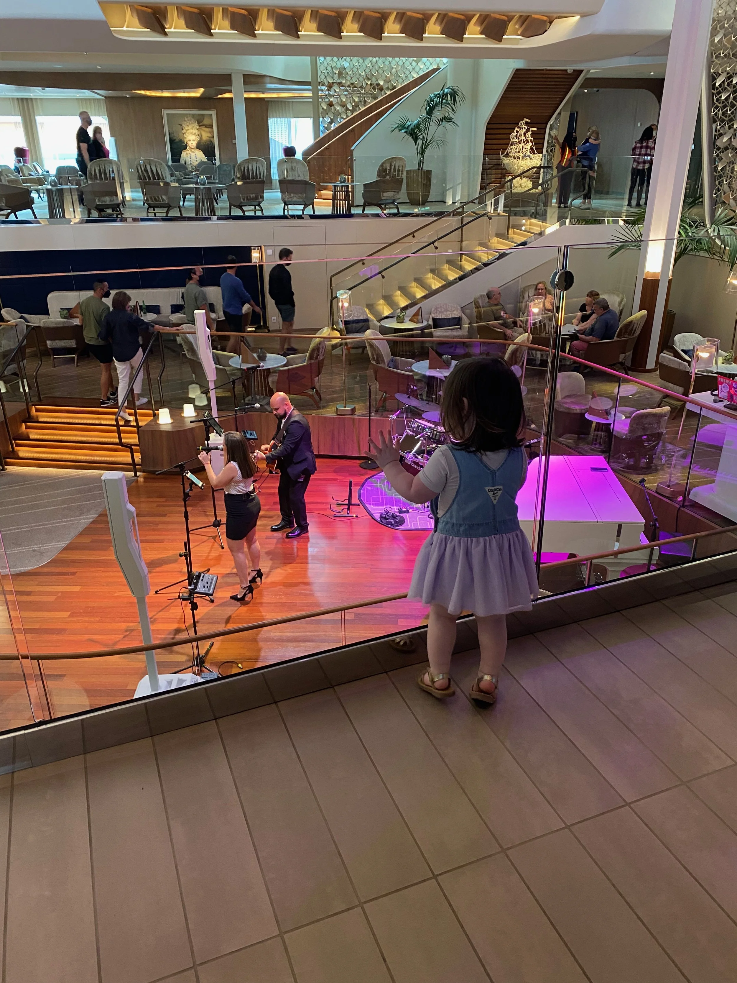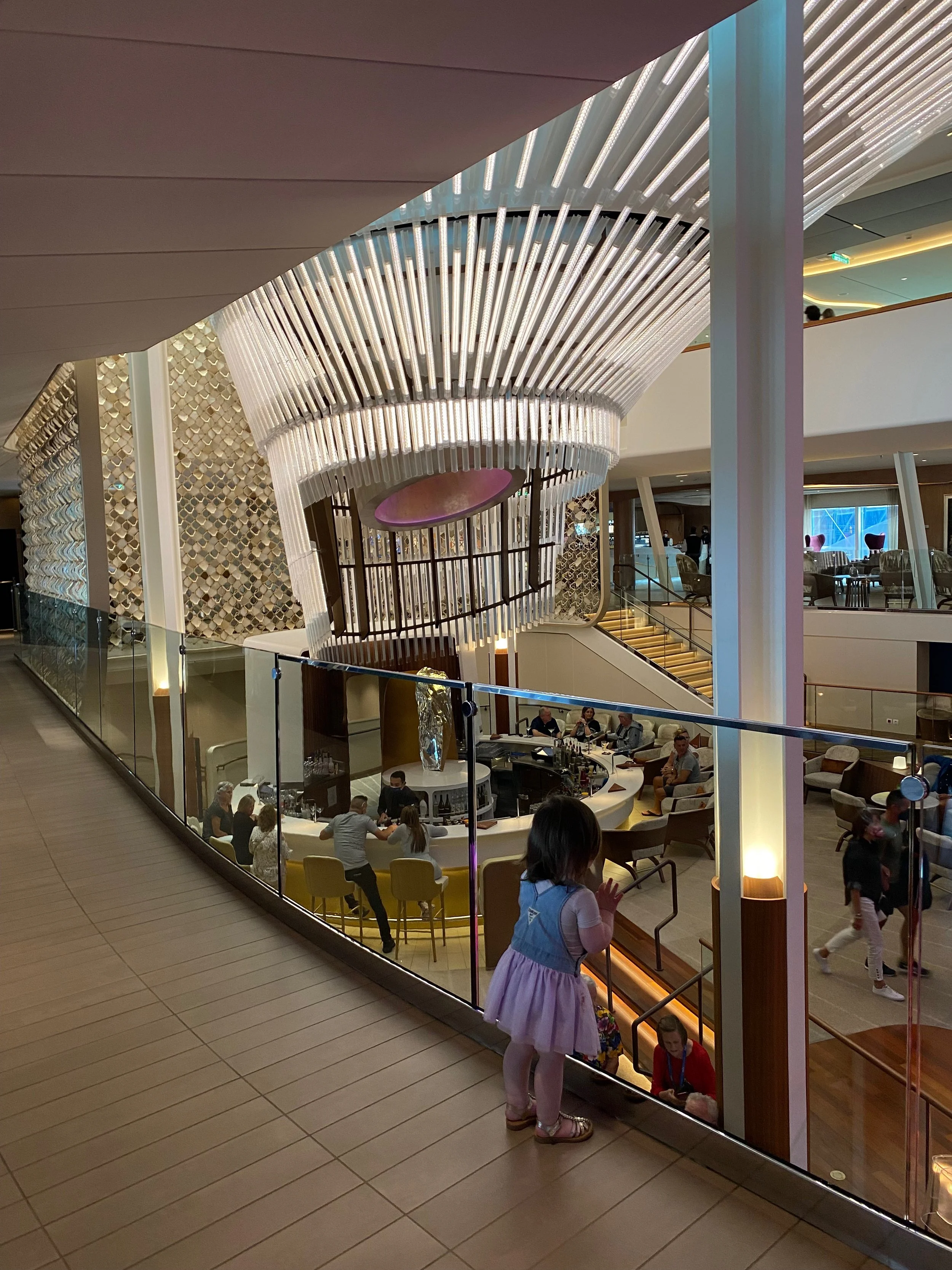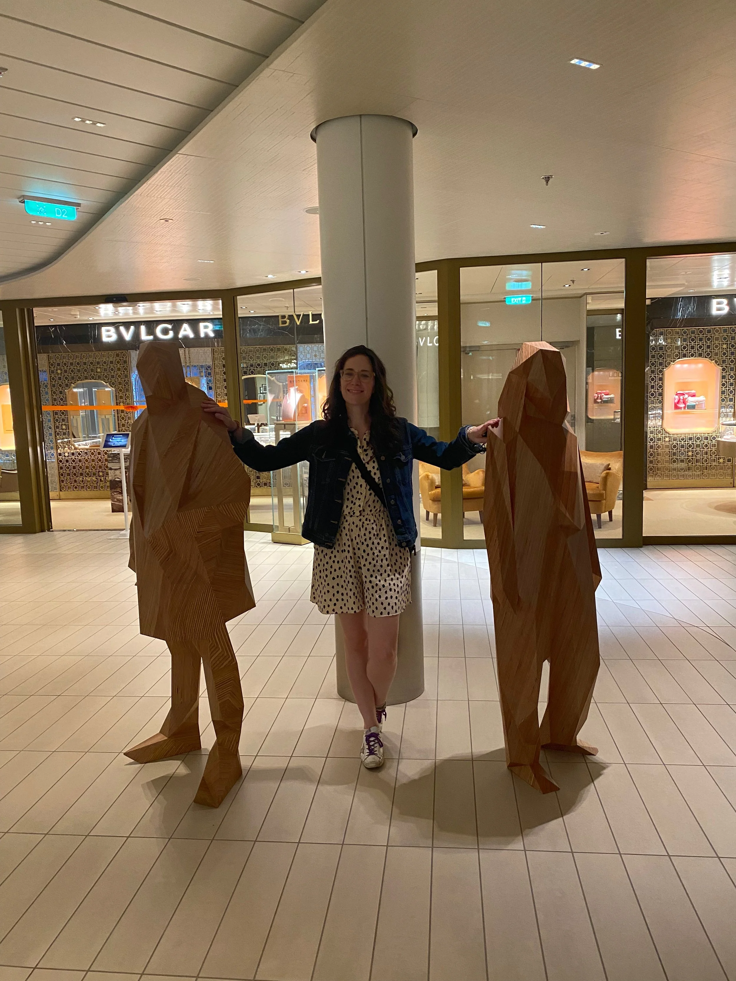 We walked all over the ship – there’s one resort deck with outdoor pool and two hot tubs (though strangely the hot tubs are two decks up from the pool, so kind of annoying to get to if you’re sitting at the pool). There’s also an adults only solarium. We saw the fitness center with Peloton bikes. We found the Grand Plaza, which spans decks 3, 4 and 5 and is home to several restaurants, the café (Café al Baccio) and the Martini Bar. We also saw the Rooftop Garden on the top deck at the back of the ship. I’ll just say, it’s a really beautiful ship. All of the art is very modern and all of the spaces are just really nice. They clearly put a lot of thought into design on this ship. There’s one hallway that’s basically a dark corridor with mirrors on all sides and strange gold statues. Hallie got scared walking through it.