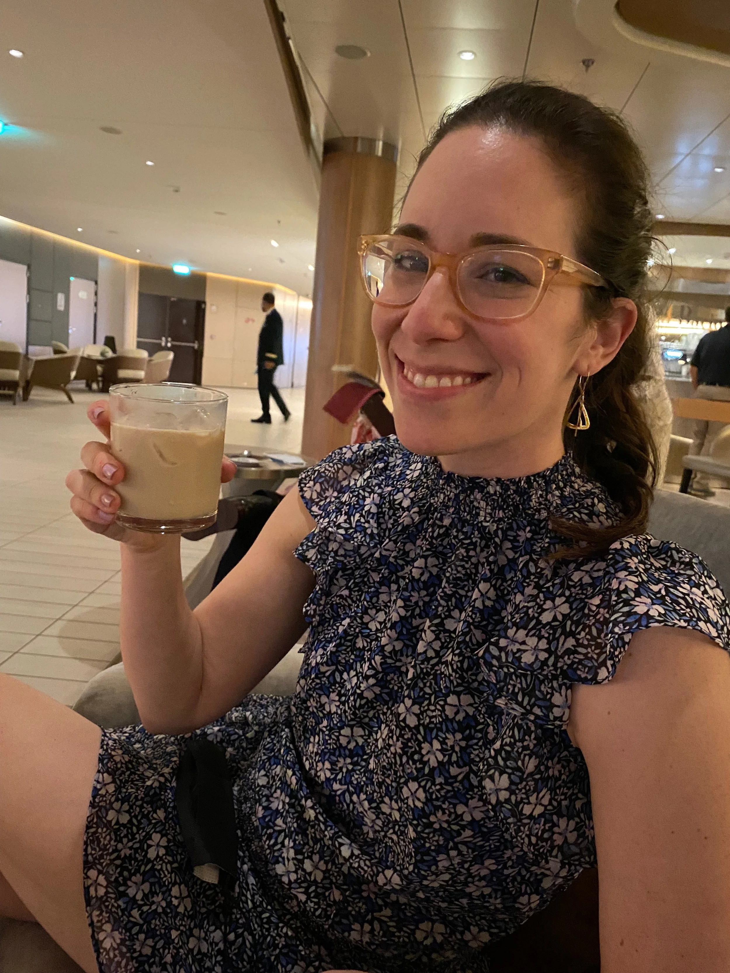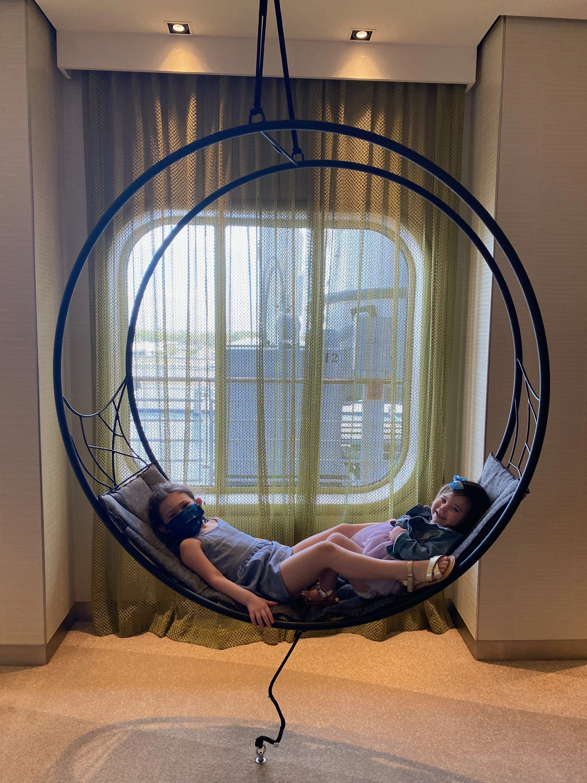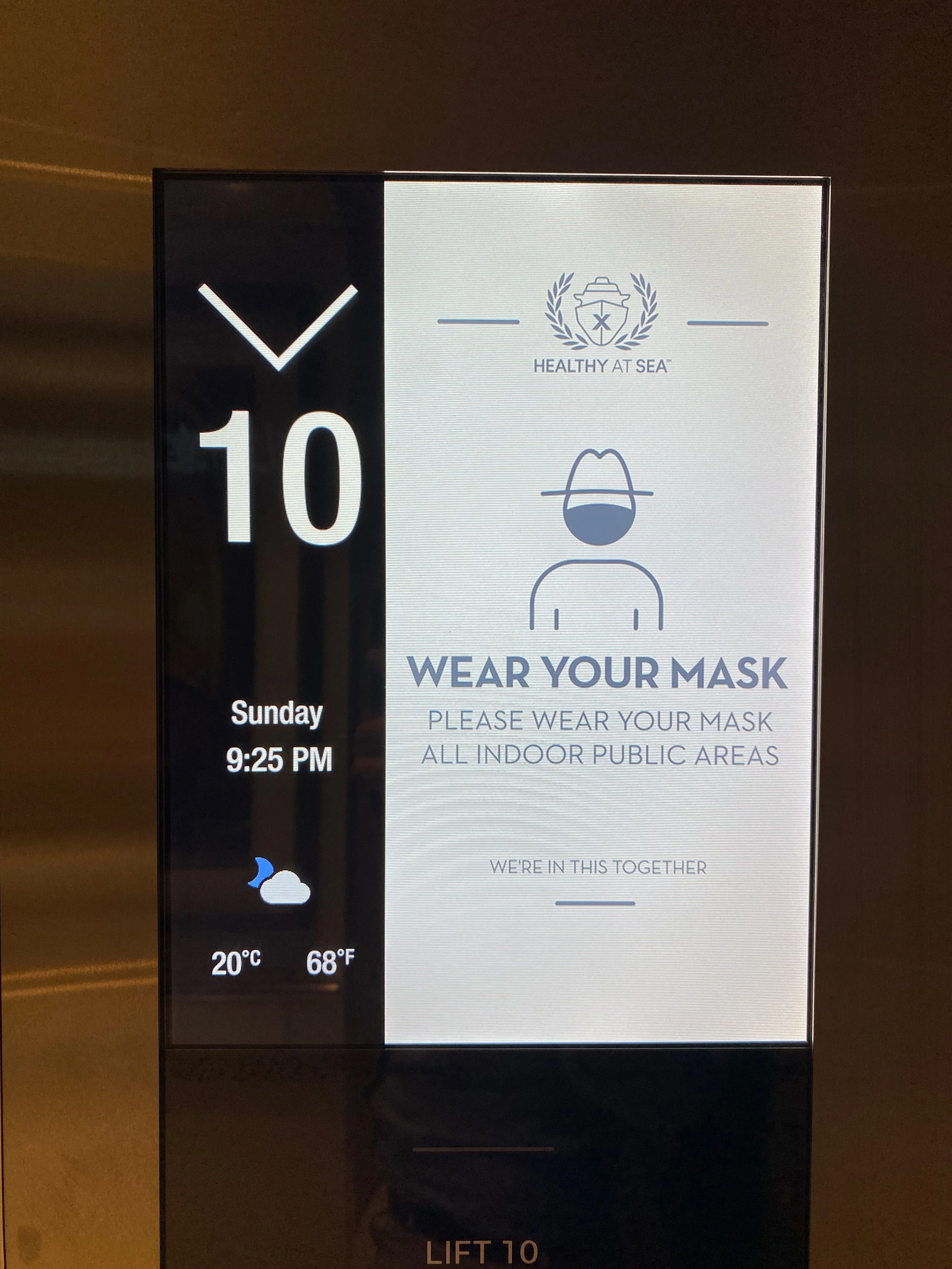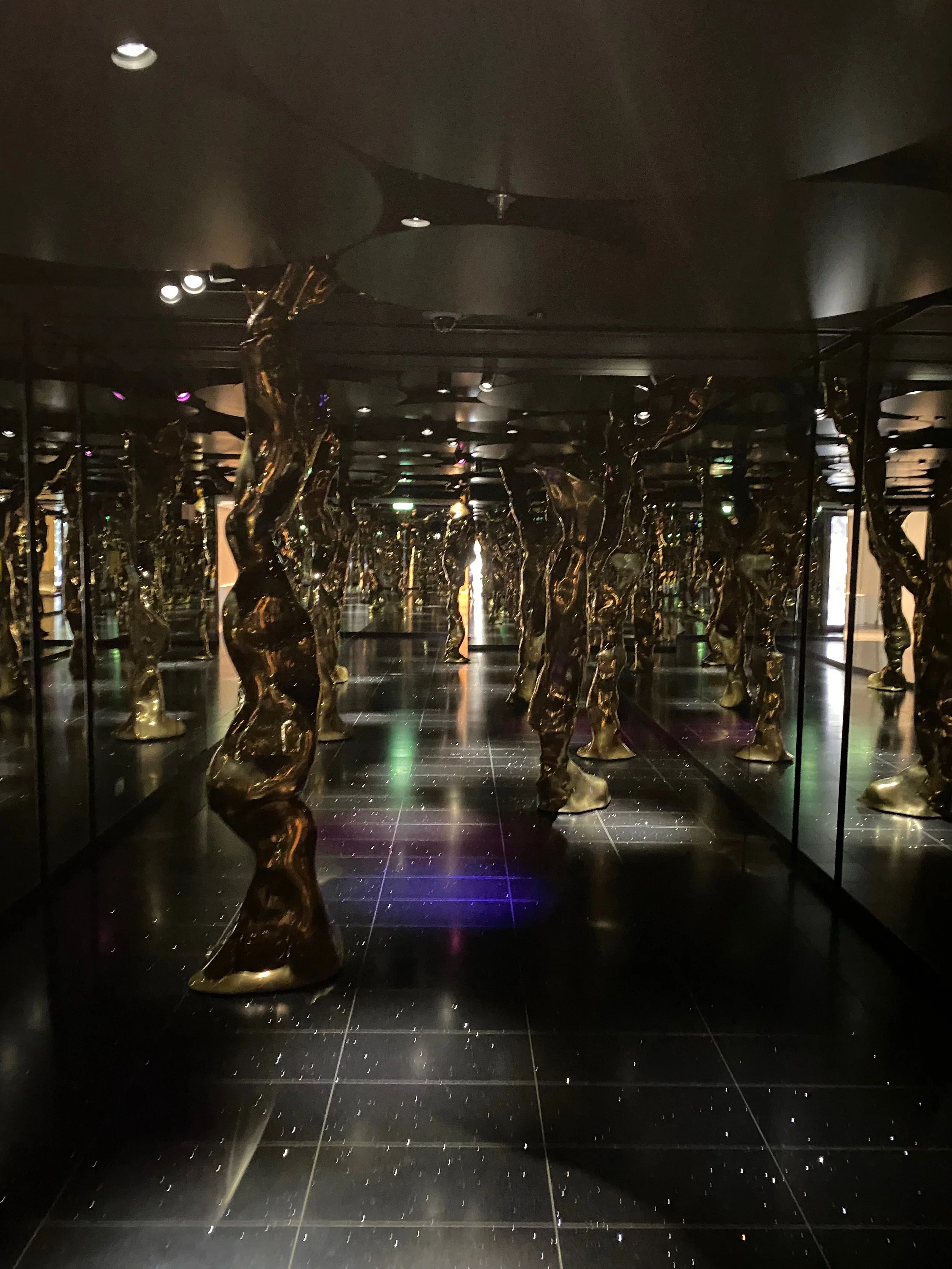We walked all over the ship – there’s one resort deck with outdoor pool and two hot tubs (though strangely the hot tubs are two decks up from the pool, so kind of annoying to get to if you’re sitting at the pool). There’s also an adults only solarium. We saw the fitness center with Peloton bikes. We found the Grand Plaza, which spans decks 3, 4 and 5 and is home to several restaurants, the café (Café al Baccio) and the Martini Bar. We also saw the Rooftop Garden on the top deck at the back of the ship. I’ll just say, it’s a really beautiful ship. All of the art is very modern and all of the spaces are just really nice. They clearly put a lot of thought into design on this ship. There’s one hallway that’s basically a dark corridor with mirrors on all sides and strange gold statues. Hallie got scared walking through it.