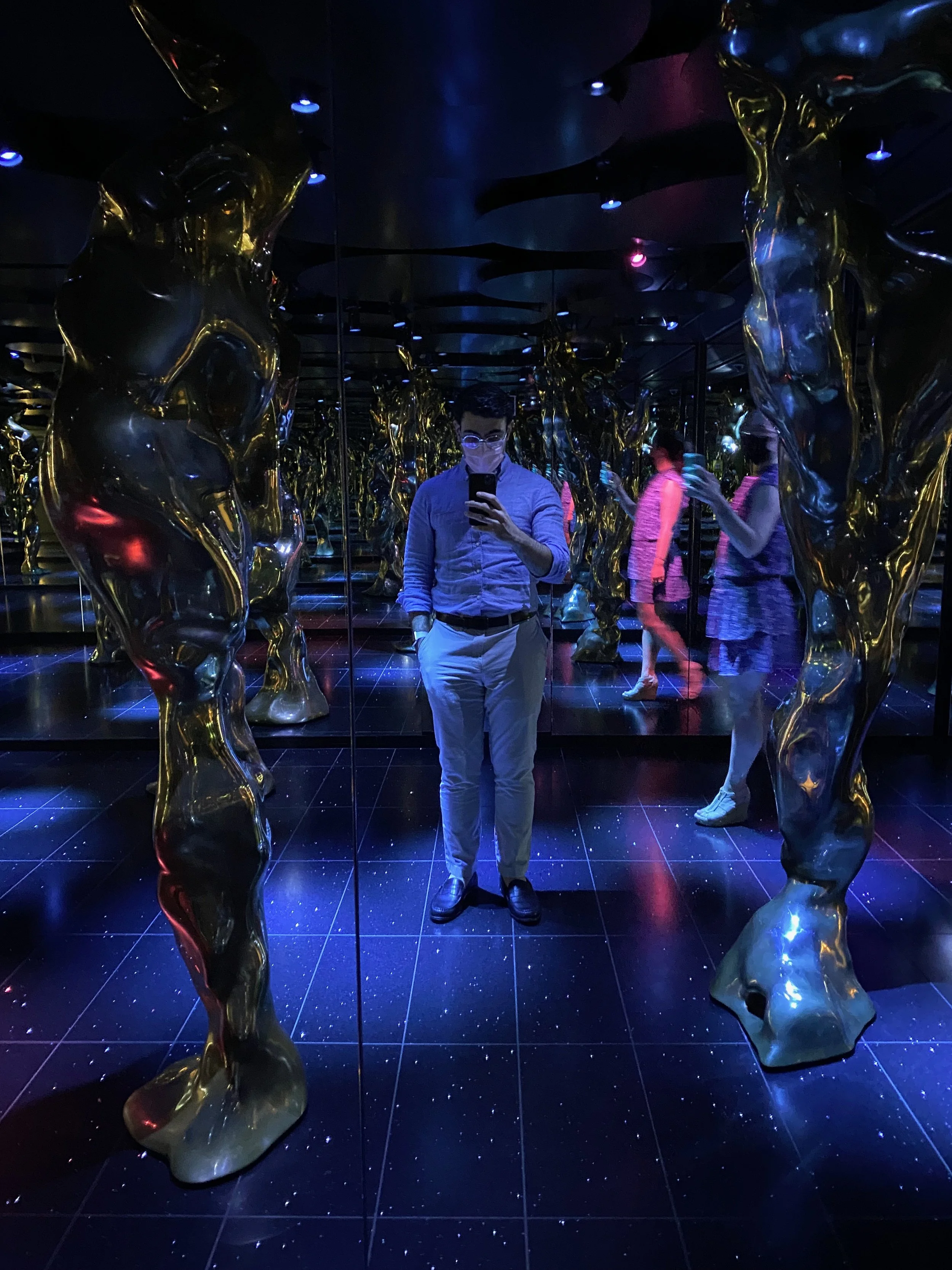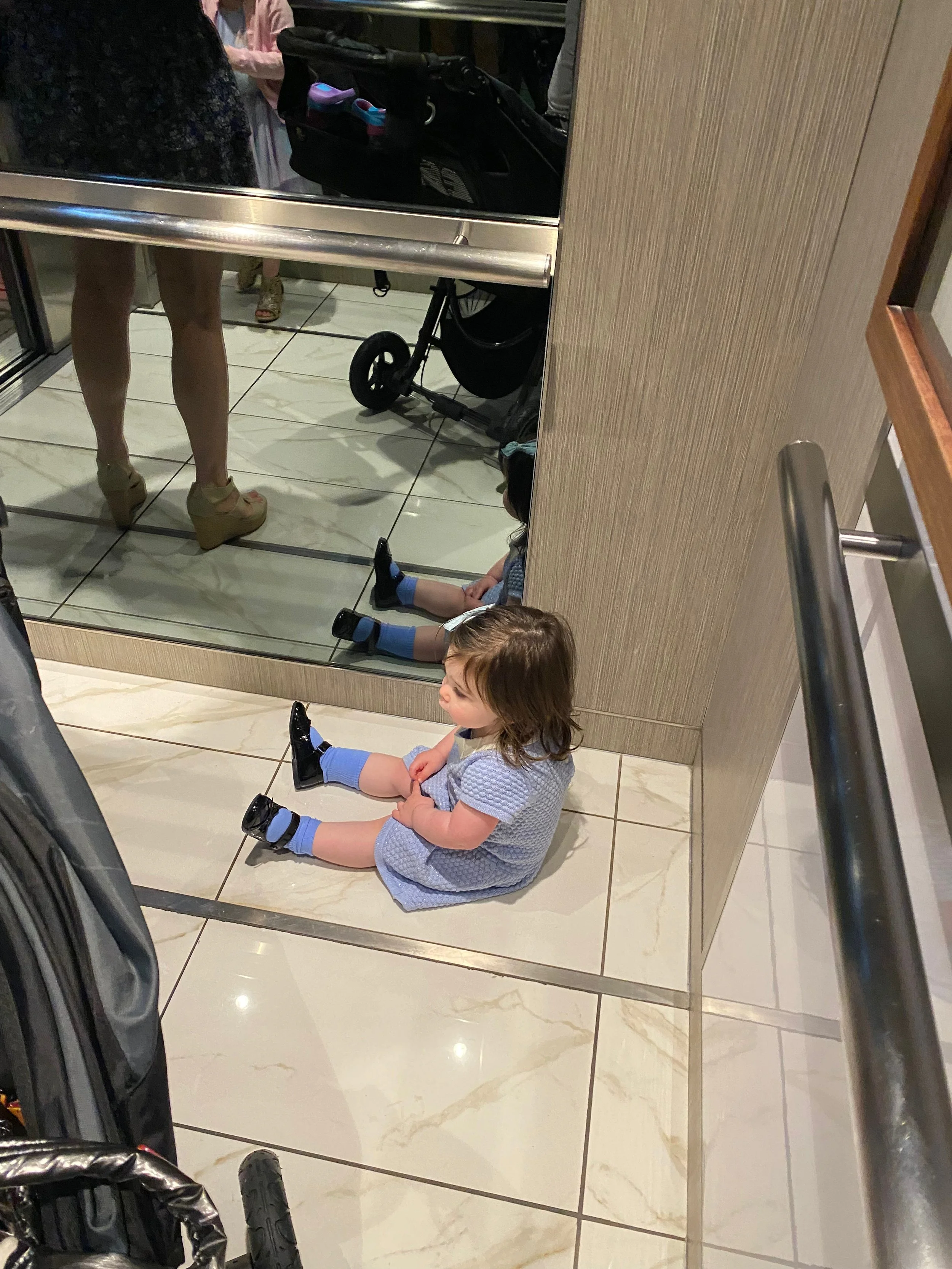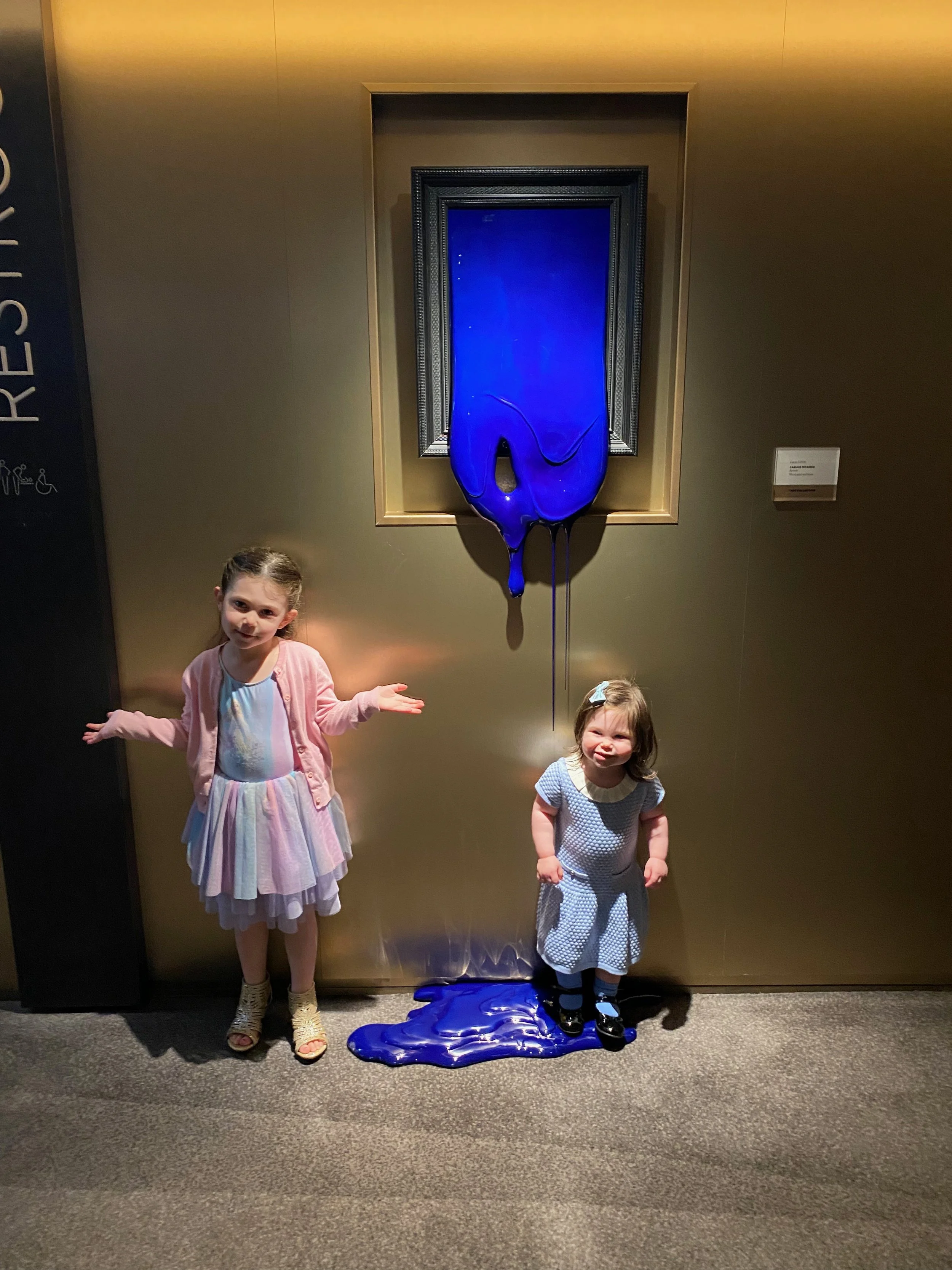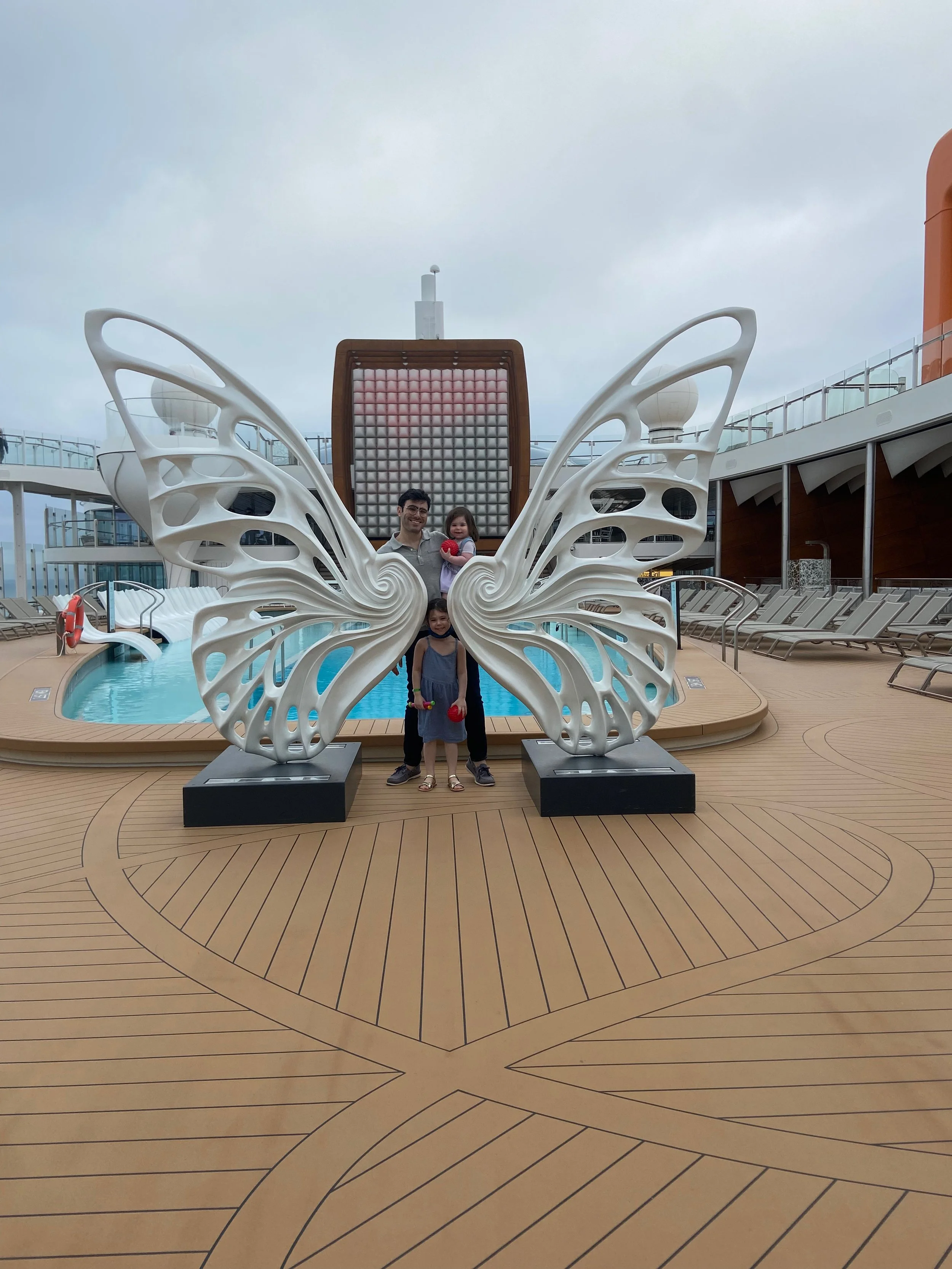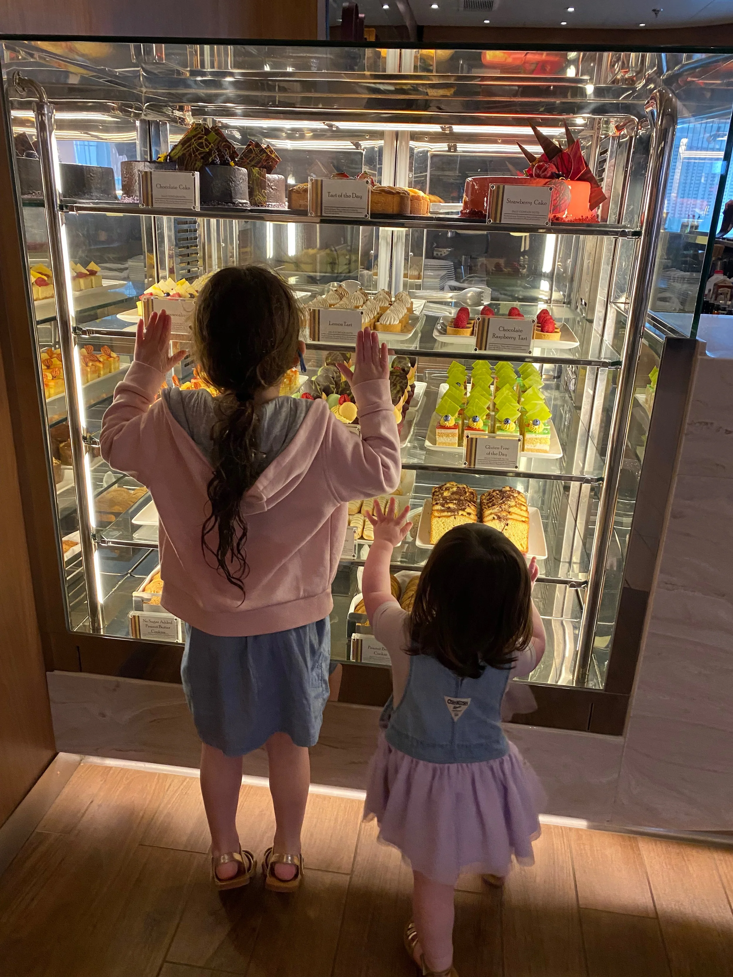 We walked all over the ship – there’s one resort deck with outdoor pool and two hot tubs (though strangely the hot tubs are two decks up from the pool, so kind of annoying to get to if you’re sitting at the pool). There’s also an adults only solarium. We saw the fitness center with Peloton bikes. We found the Grand Plaza, which spans decks 3, 4 and 5 and is home to several restaurants, the café (Café al Baccio) and the Martini Bar. We also saw the Rooftop Garden on the top deck at the back of the ship. I’ll just say, it’s a really beautiful ship. All of the art is very modern and all of the spaces are just really nice. They clearly put a lot of thought into design on this ship. There’s one hallway that’s basically a dark corridor with mirrors on all sides and strange gold statues. Hallie got scared walking through it.