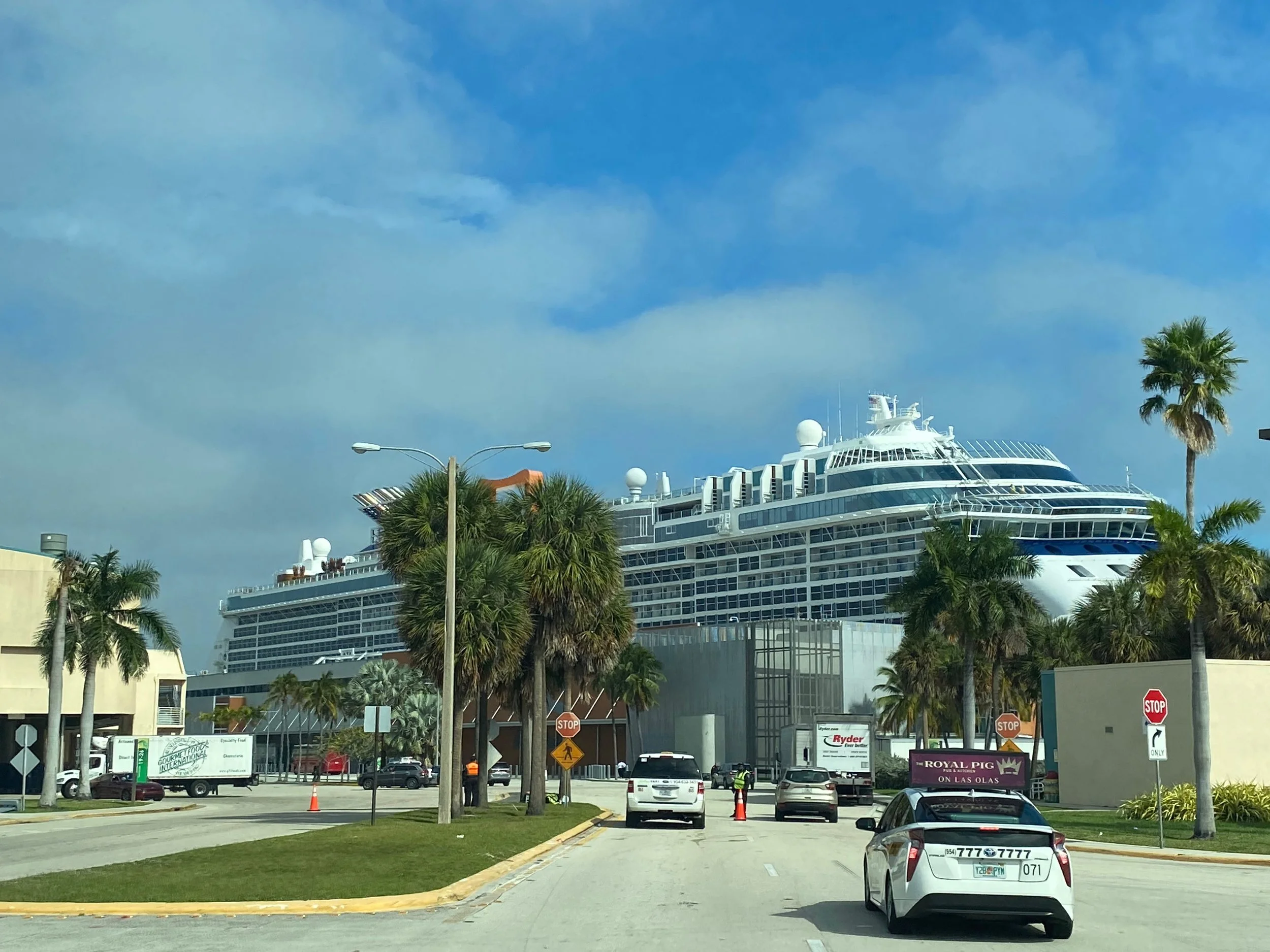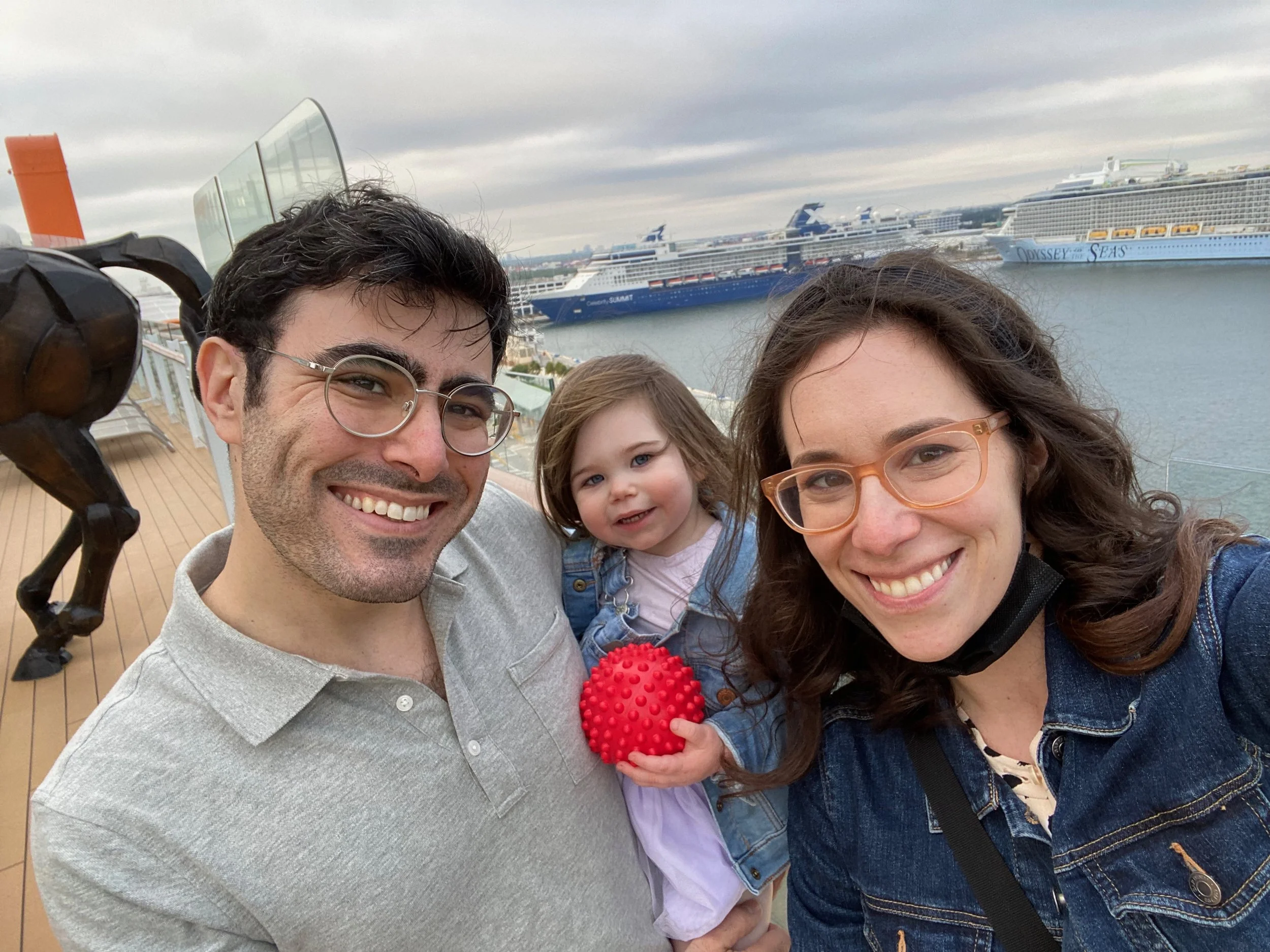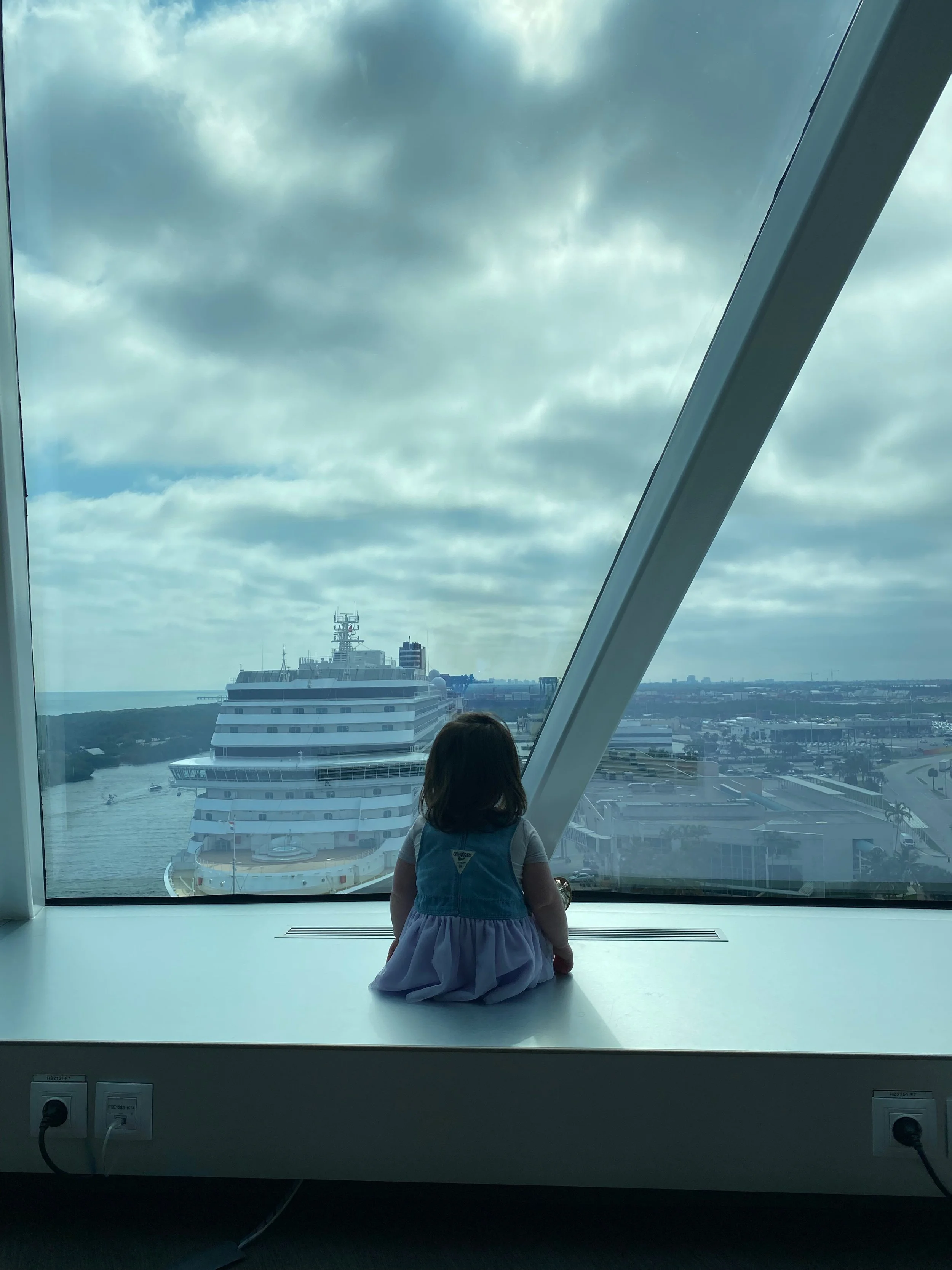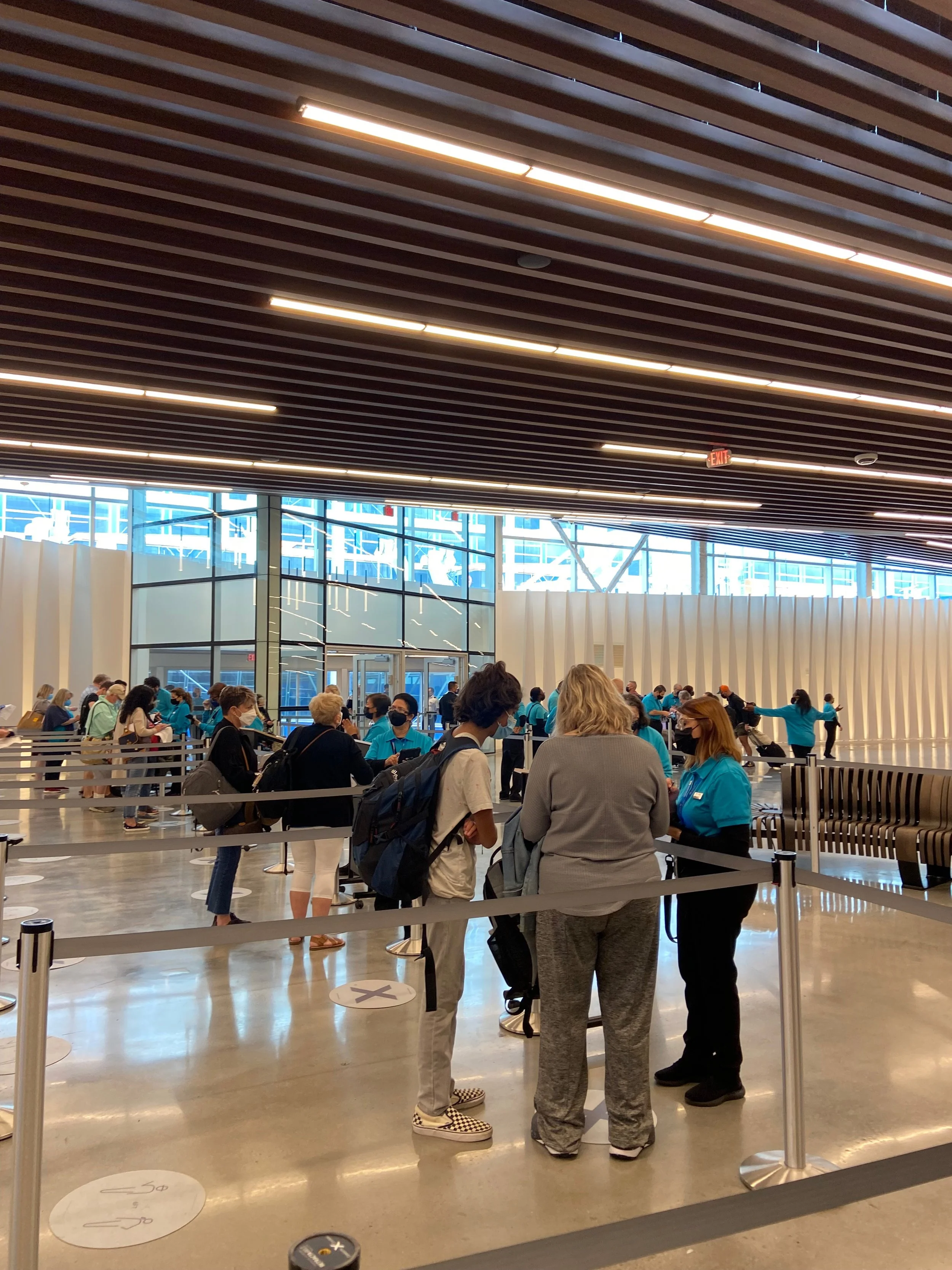 We wanted to get out of the hotel around 10, but I don’t think we left until 10:30. The Uber ride to Fort Lauderdale was about 40/45 minutes and we made it to Port Everglades in time for our 11 – 1130 check in window. Check in was extremely smooth. First, they checked the kids. Hallie got a green sticker that said VAX and Madeleine was upset she couldn’t have a sticker also. We all had to show our COVID results and vaccine cards and then went through security, check in, and another check in, walked over a long bridge, and finally, we were on the ship!