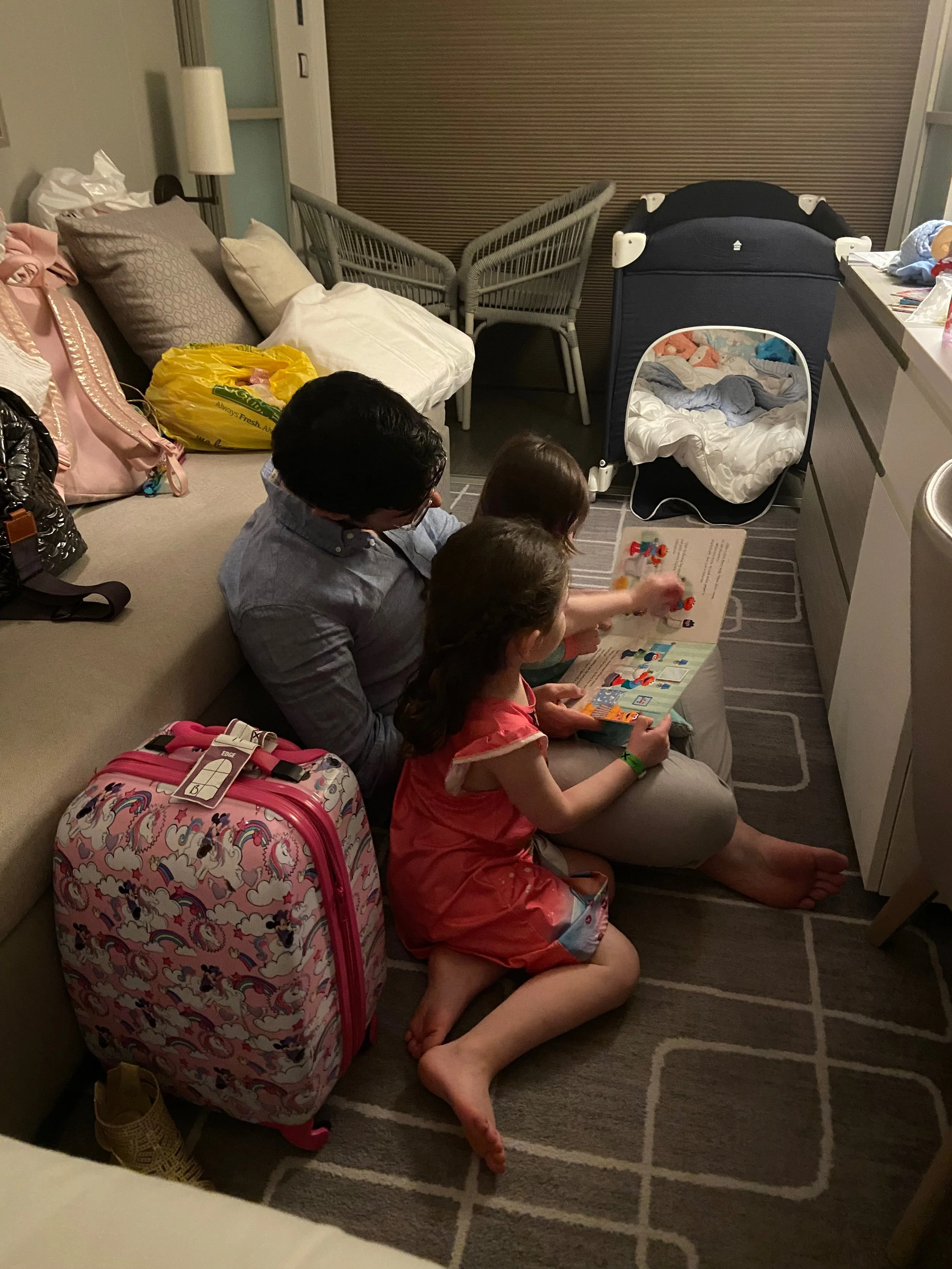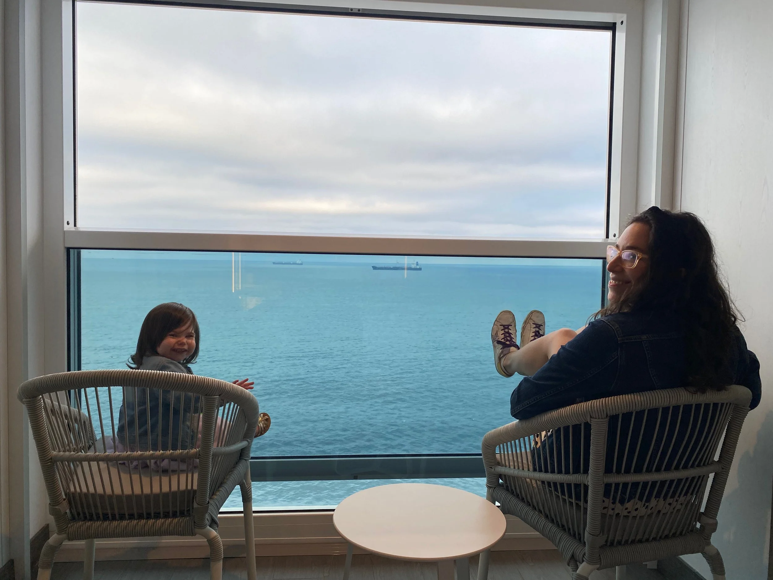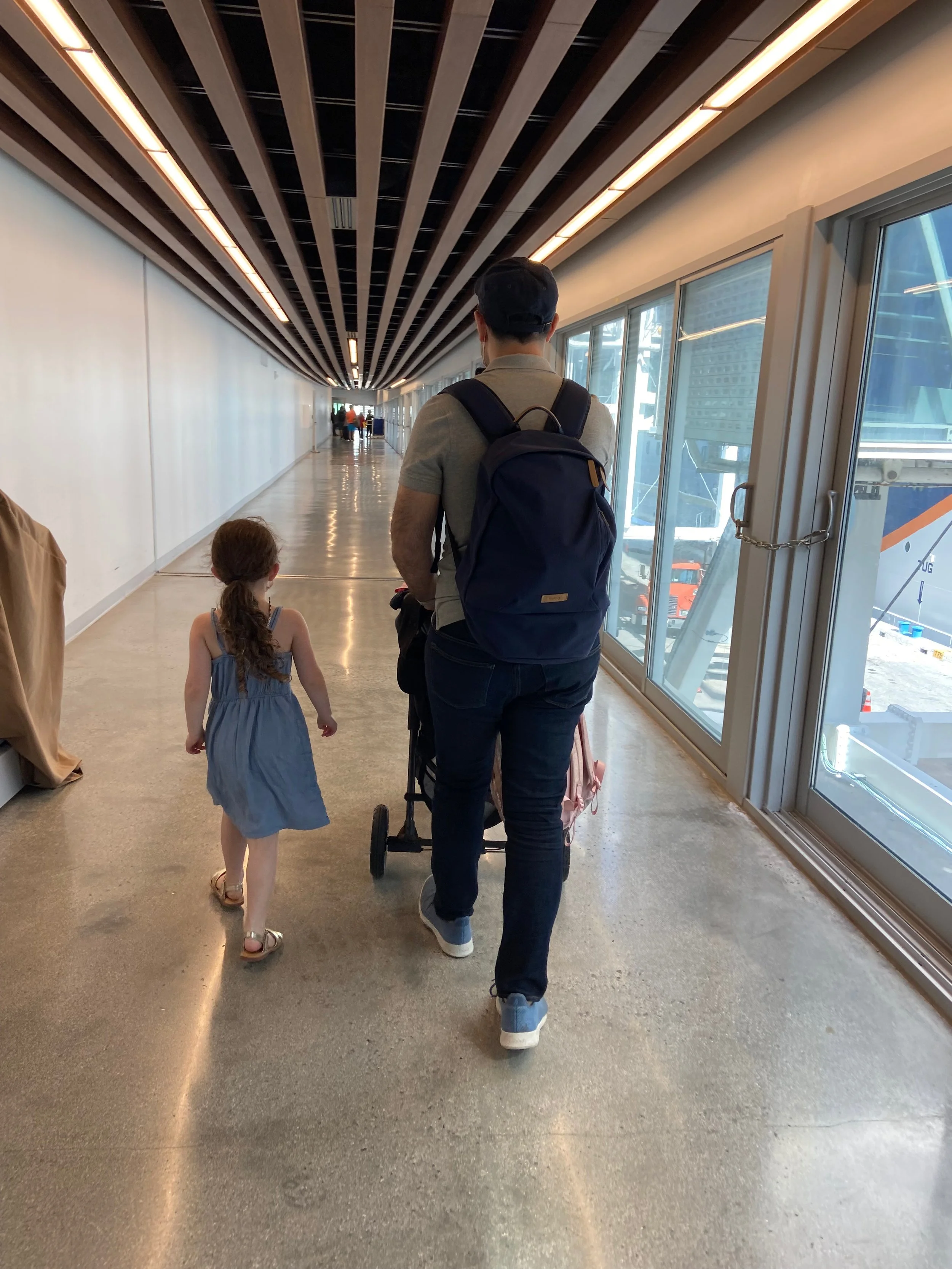 We wanted to get out of the hotel around 10, but I don’t think we left until 10:30. The Uber ride to Fort Lauderdale was about 40/45 minutes and we made it to Port Everglades in time for our 11 – 1130 check in window. Check in was extremely smooth. First, they checked the kids. Hallie got a green sticker that said VAX and Madeleine was upset she couldn’t have a sticker also. We all had to show our COVID results and vaccine cards and then went through security, check in, and another check in, walked over a long bridge, and finally, we were on the ship!