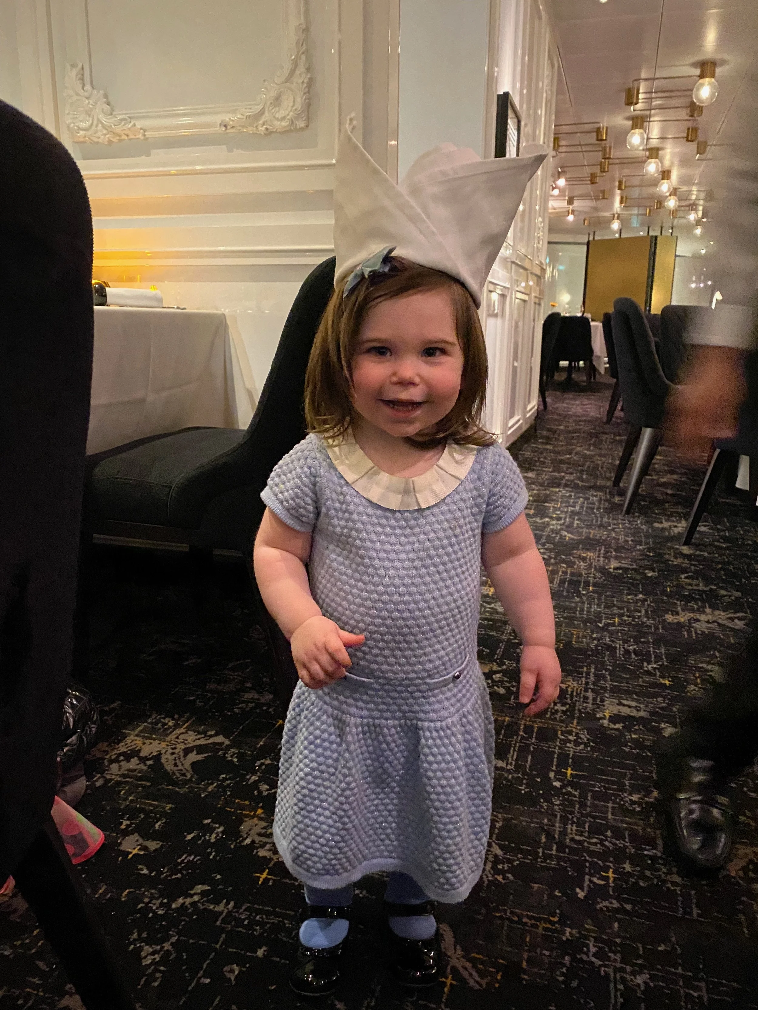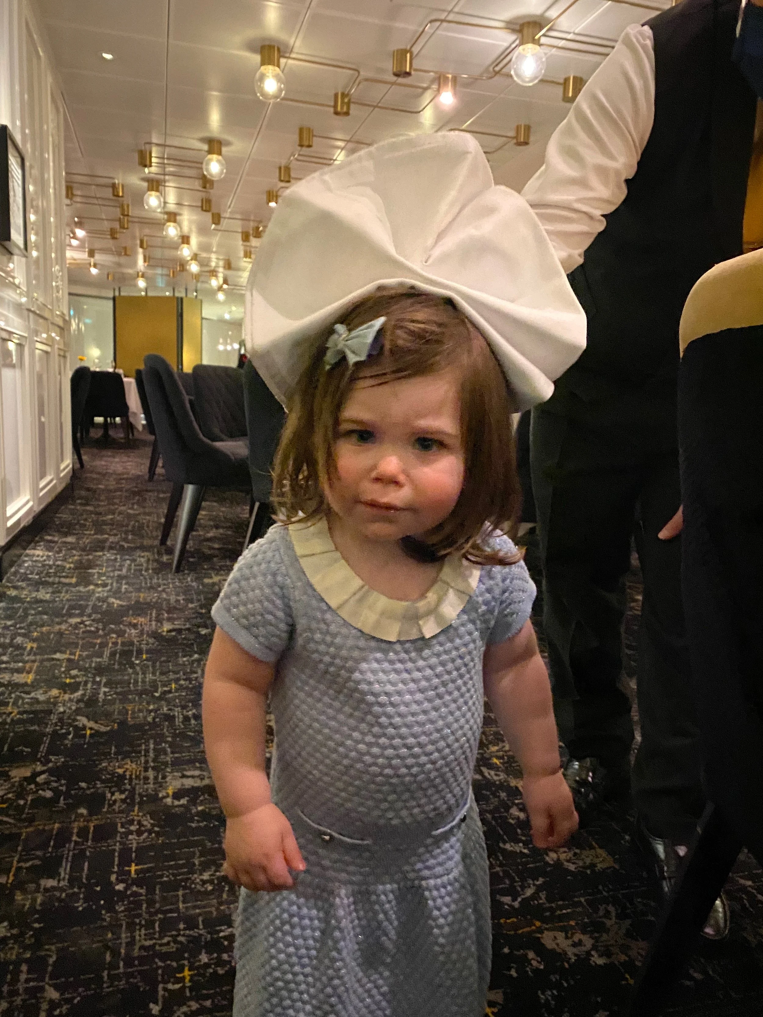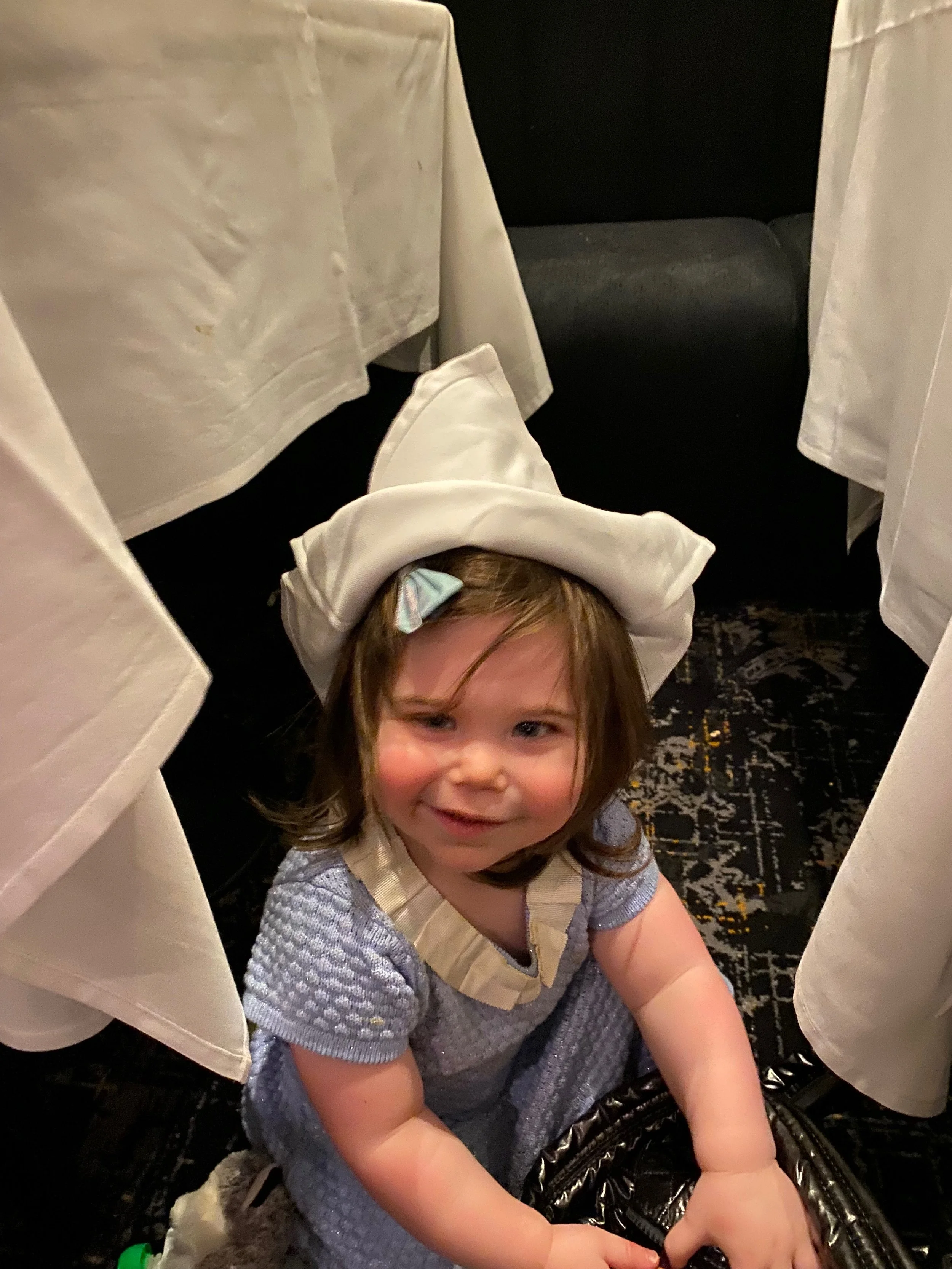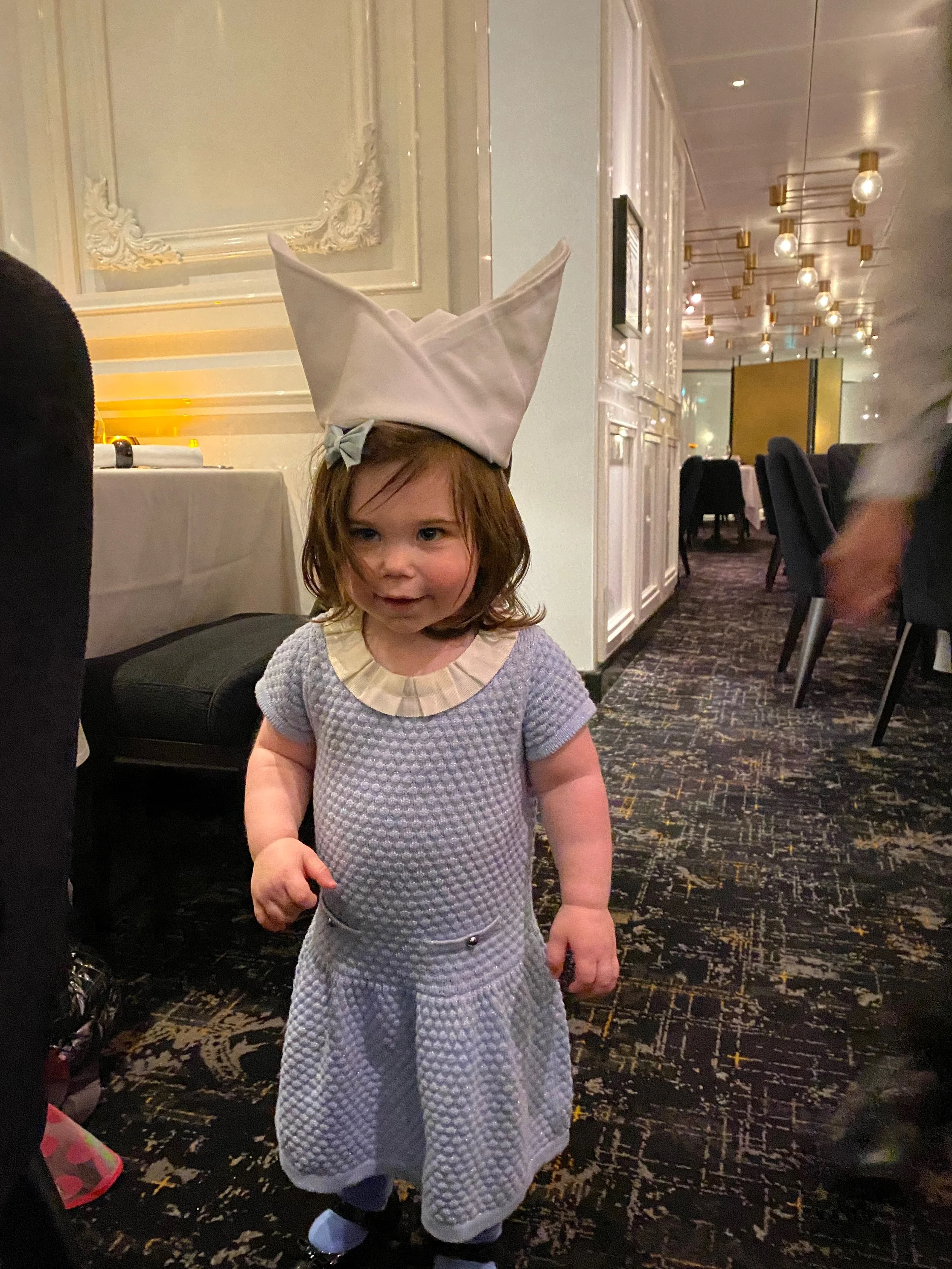 As we were packing ourselves up, the waiter kept making hats for Madeleine out of napkins. They stayed on her head for about five seconds and then she demanded he make more. It was cute.