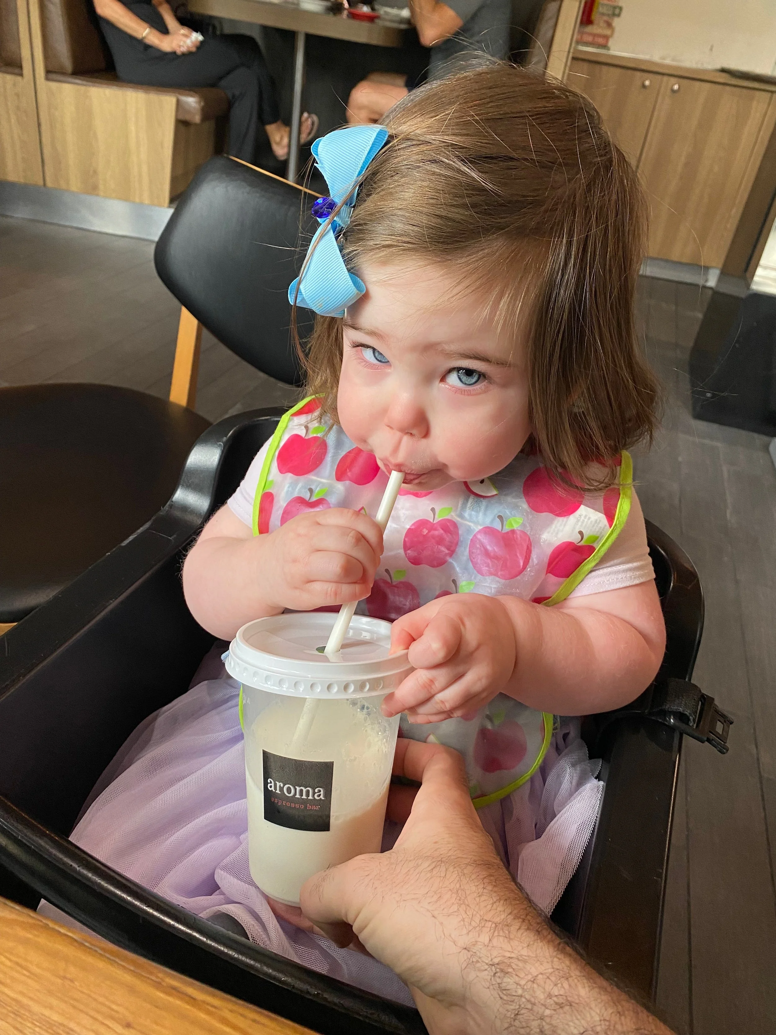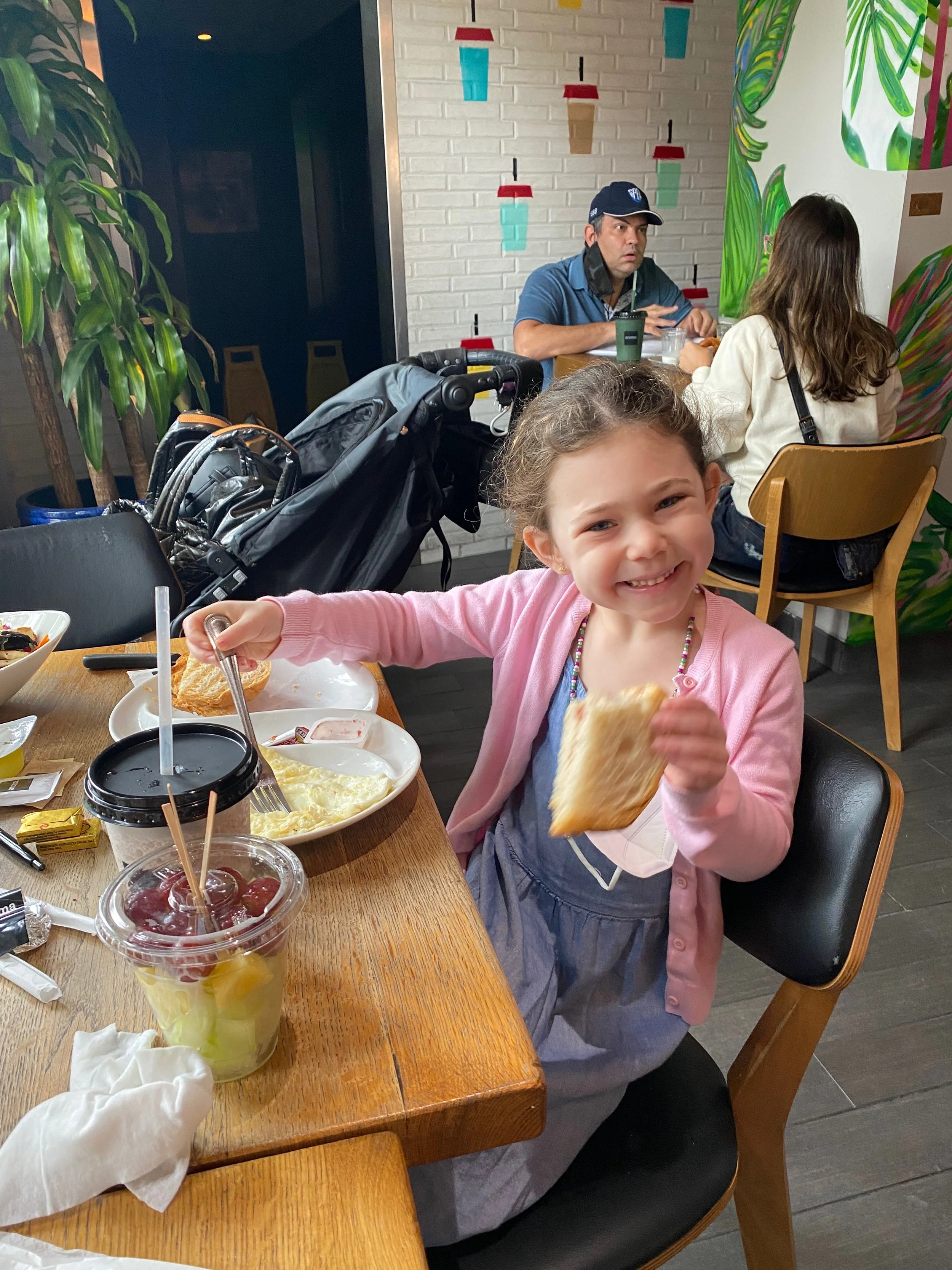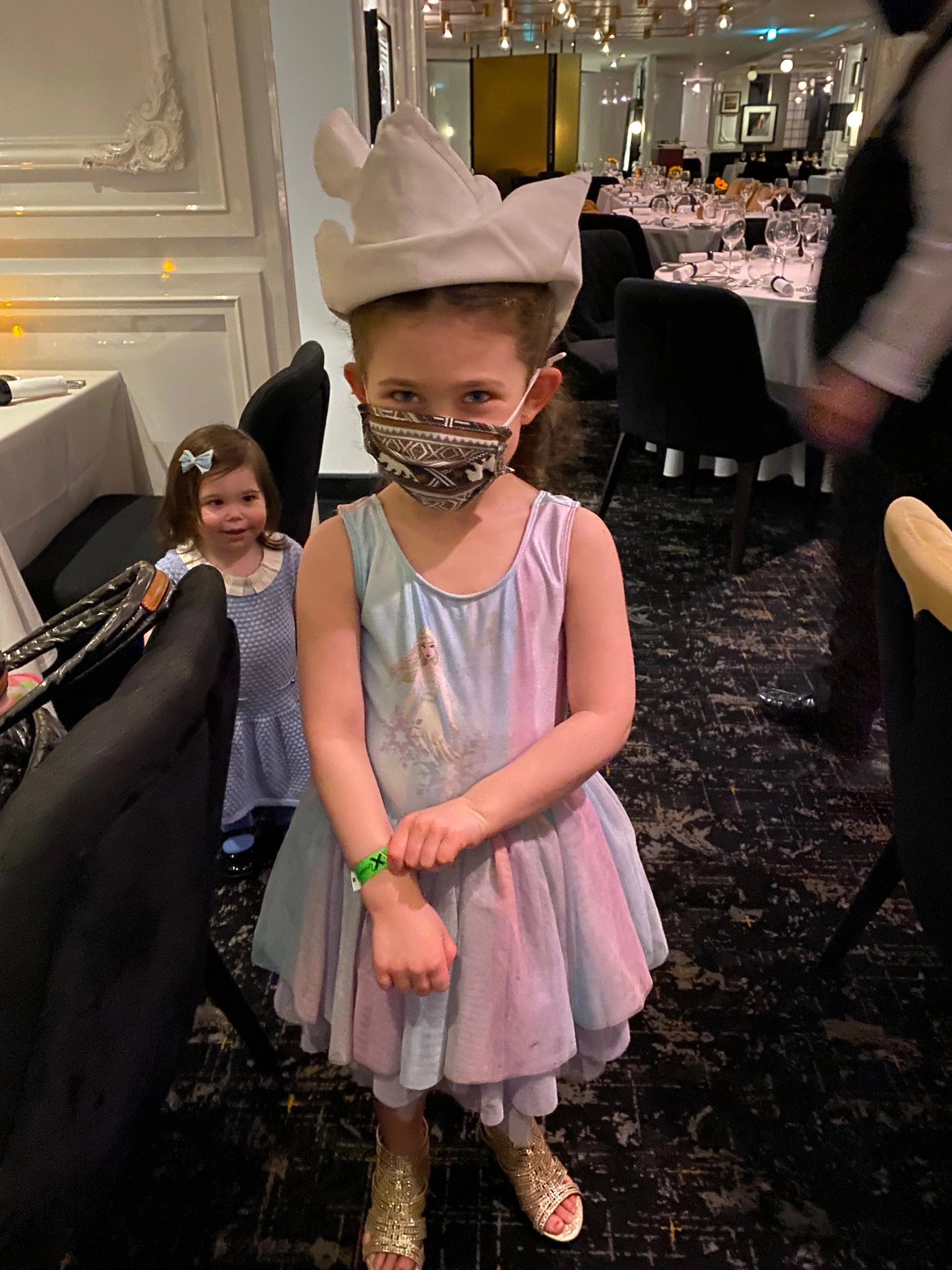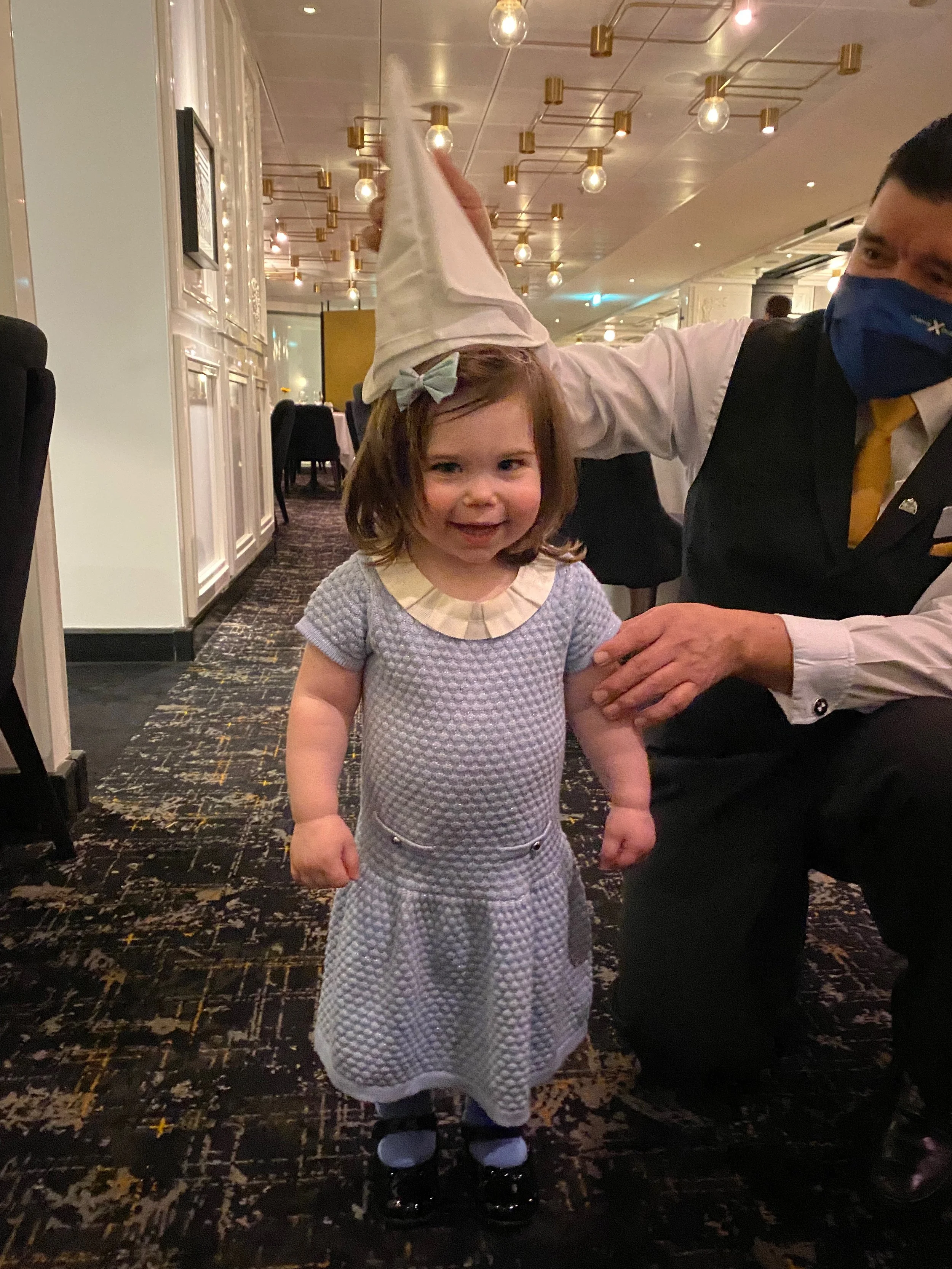 As we were packing ourselves up, the waiter kept making hats for Madeleine out of napkins. They stayed on her head for about five seconds and then she demanded he make more. It was cute.